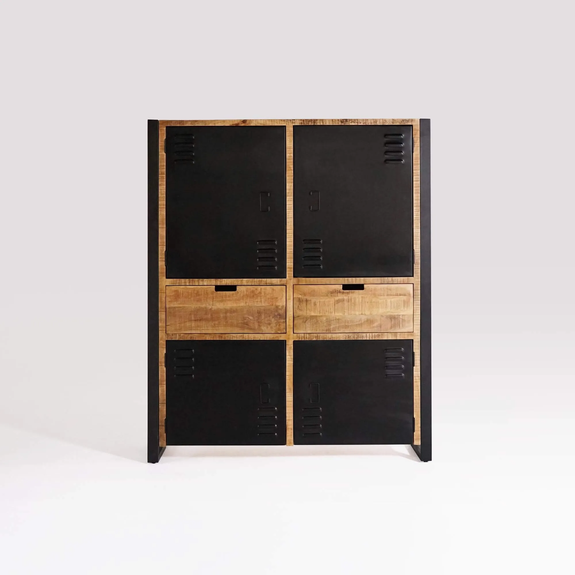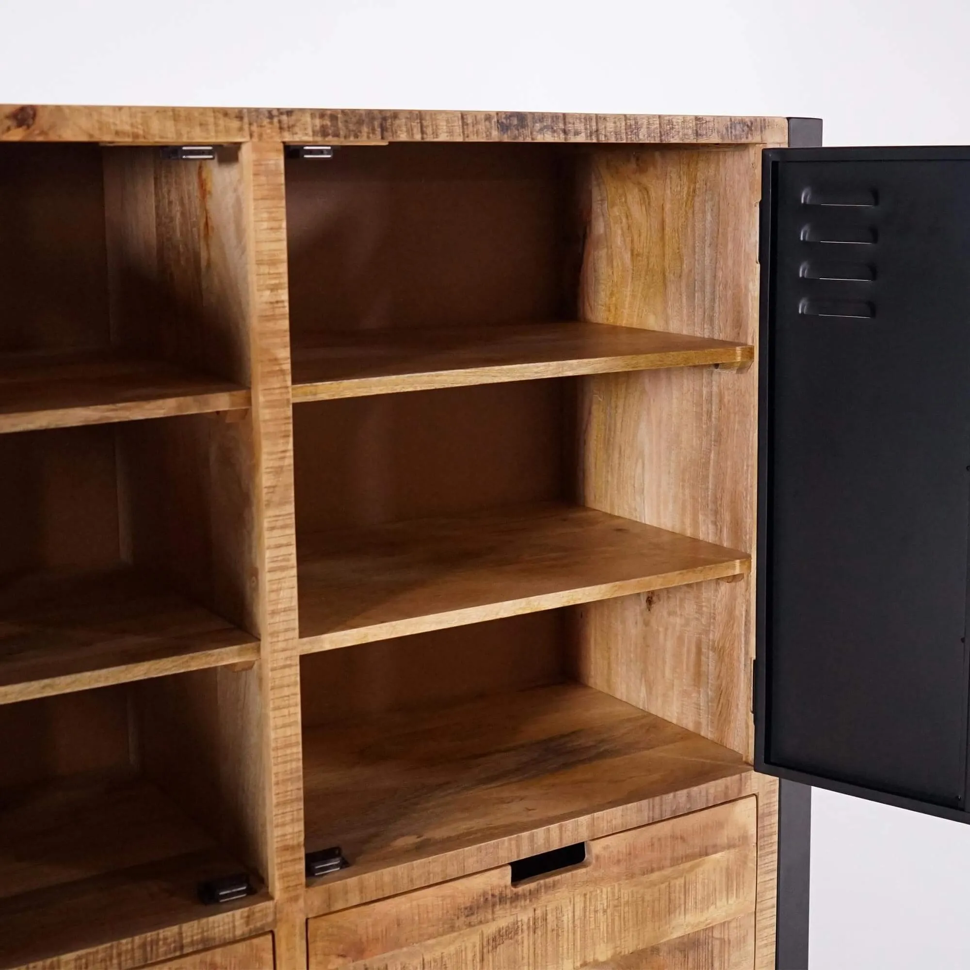 De kast in massief mangohout met metalen deuren wordt gemonteerd geleverd en past gemakkelijk in een lichte woonkamer, een creatieve werkruimte of een moderne eetkamer. De uitgesproken vormgeving geeft ritme aan de ruimte, terwijl ze toch sober genoeg blijft om verschillende stijlen te begeleiden, van een stedelijke loft tot een natuurlijker interieur.