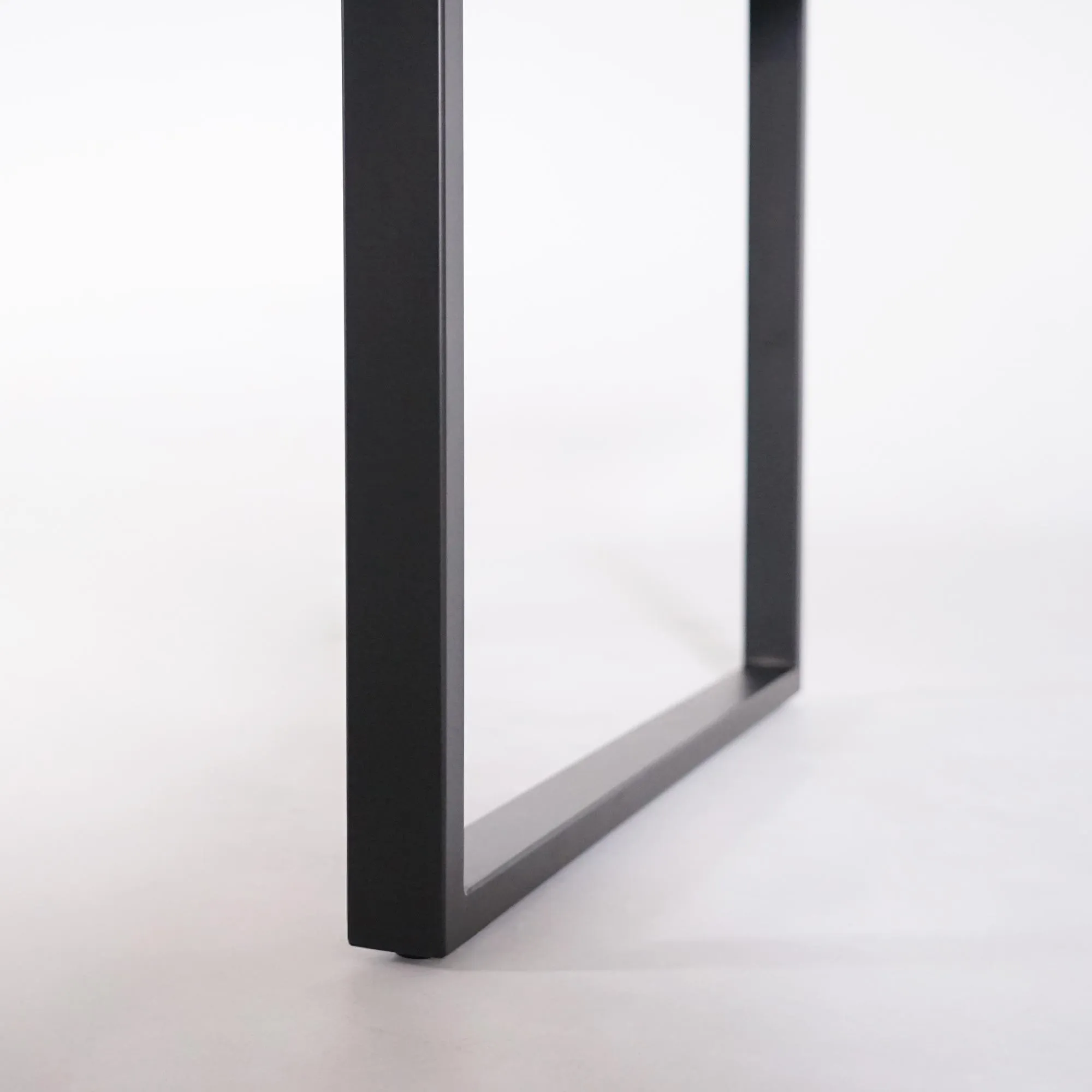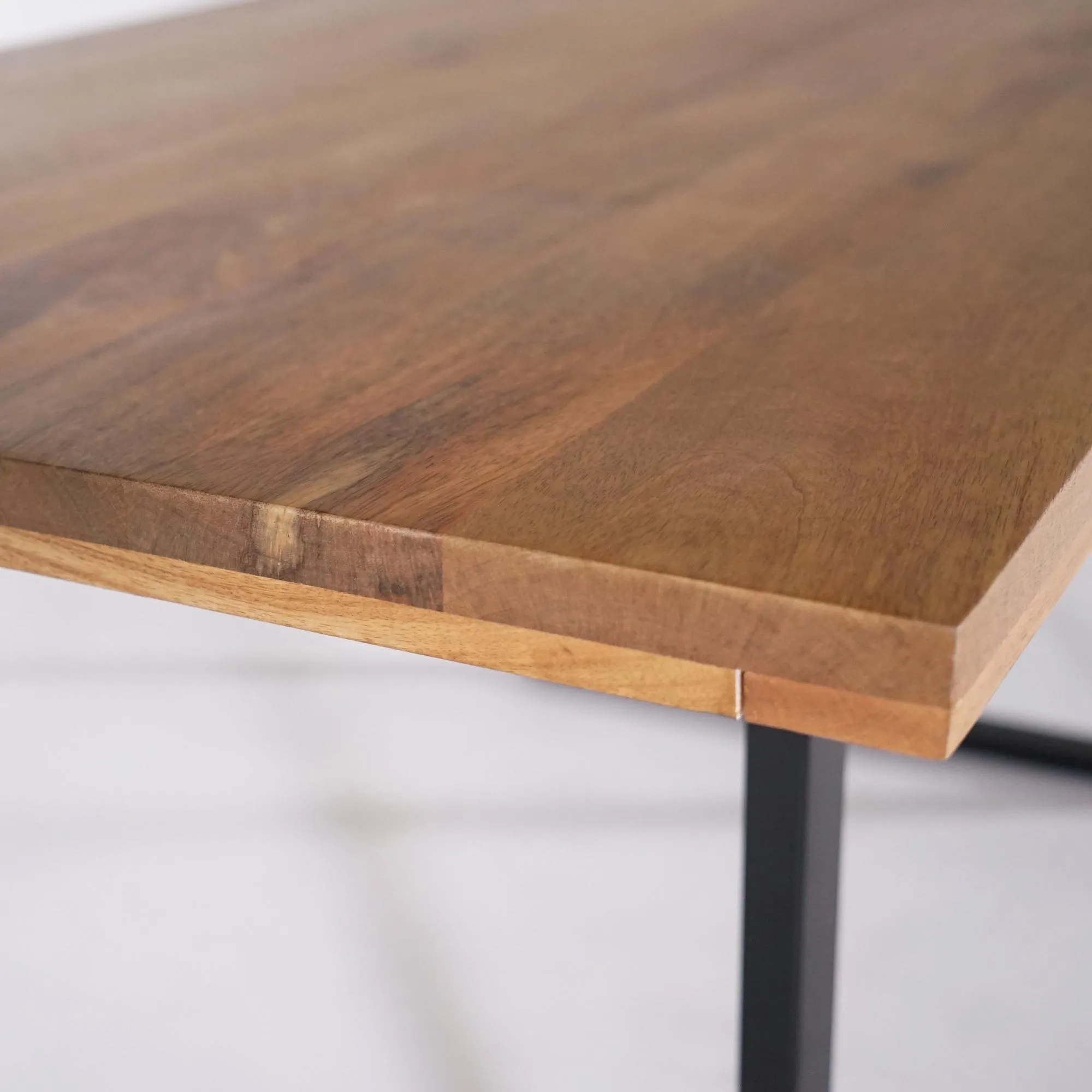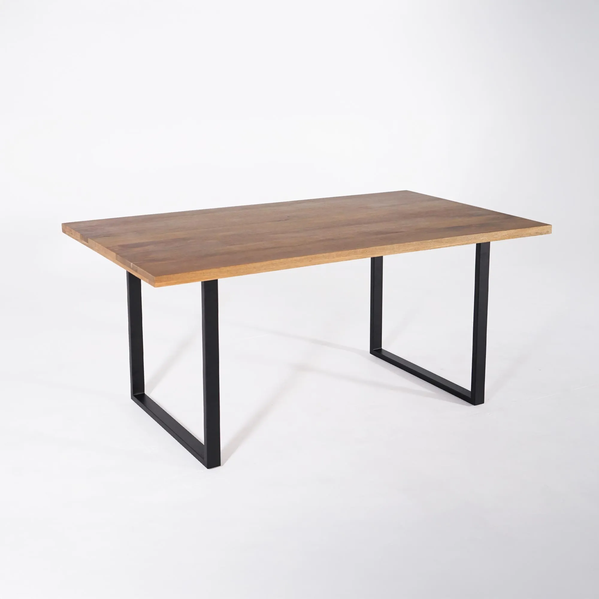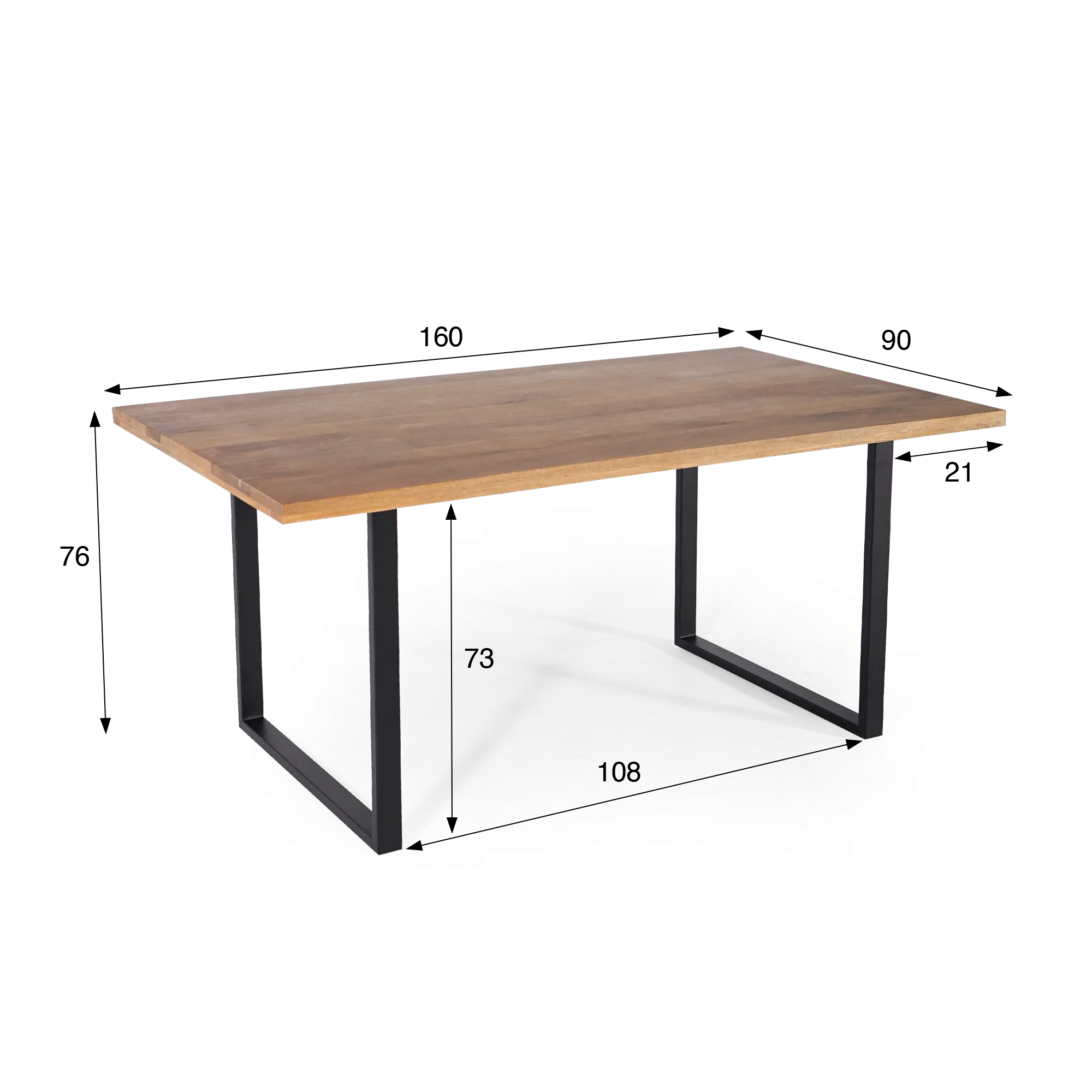 De zwarte metalen poten van deze eettafel in massief mangohout en metaal geven het geheel een grafische en stabiele uitstraling. Hun strakke vorm, licht teruggeplaatst ten opzichte van het blad, creëert extra beenruimte en vergemakkelijkt de circulatie rond de tafel. De combinatie van mangohout en metaal zorgt voor een subtiel contrast, typerend voor de industriële stijl, maar tegelijk sober genoeg om te passen in zowel een hedendaags interieur als een warm ingerichte eetkamer.