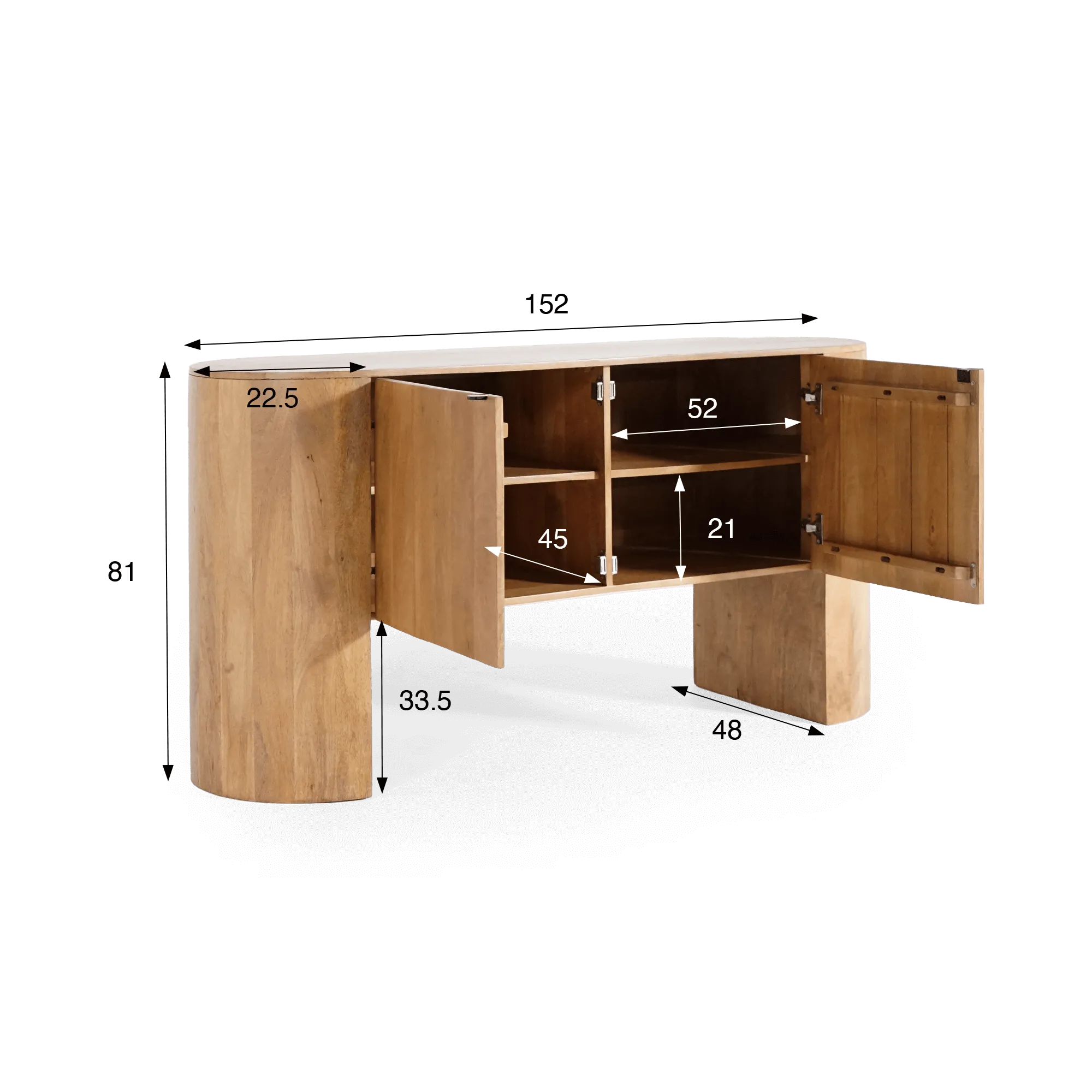 Achter de twee draaideuren biedt het massief houten dressoir met 2 deuren Timea een gestructureerde en aangename opbergruimte. Elk compartiment is opgebouwd rond vaste legplanken, ideaal voor servies, tafellinnen of dagelijkse gebruiksvoorwerpen. De royale en goed geproportioneerde binnenvolumes zorgen voor een vlot dagelijks gebruik, terwijl de totale hoogte van dit massief houten dressoir met 2 deuren – 81 cm – het tot een ideaal meubel maakt om decoratieve objecten of verlichting op te plaatsen. De deuren openen soepel en onthullen een bijpassend houten interieur, ontworpen met oog voor visuele continuïteit.