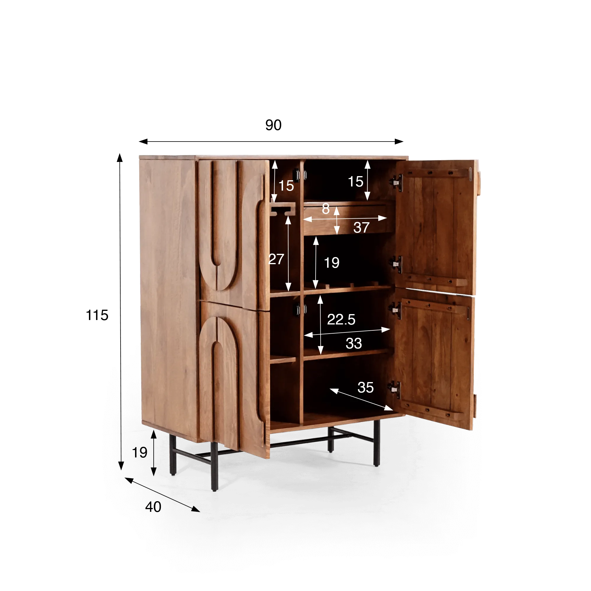 Met zijn afmetingen van 90 cm breed, 45 cm diep en 116 cm hoog past dit massief houten barkmeubel perfect in een woonkamer of eetkamer, waar het meteen een blikvanger wordt. Het metalen onderstel van 19 cm hoog geeft het meubel een luchtige uitstraling en zorgt tegelijk voor perfecte stabiliteit.