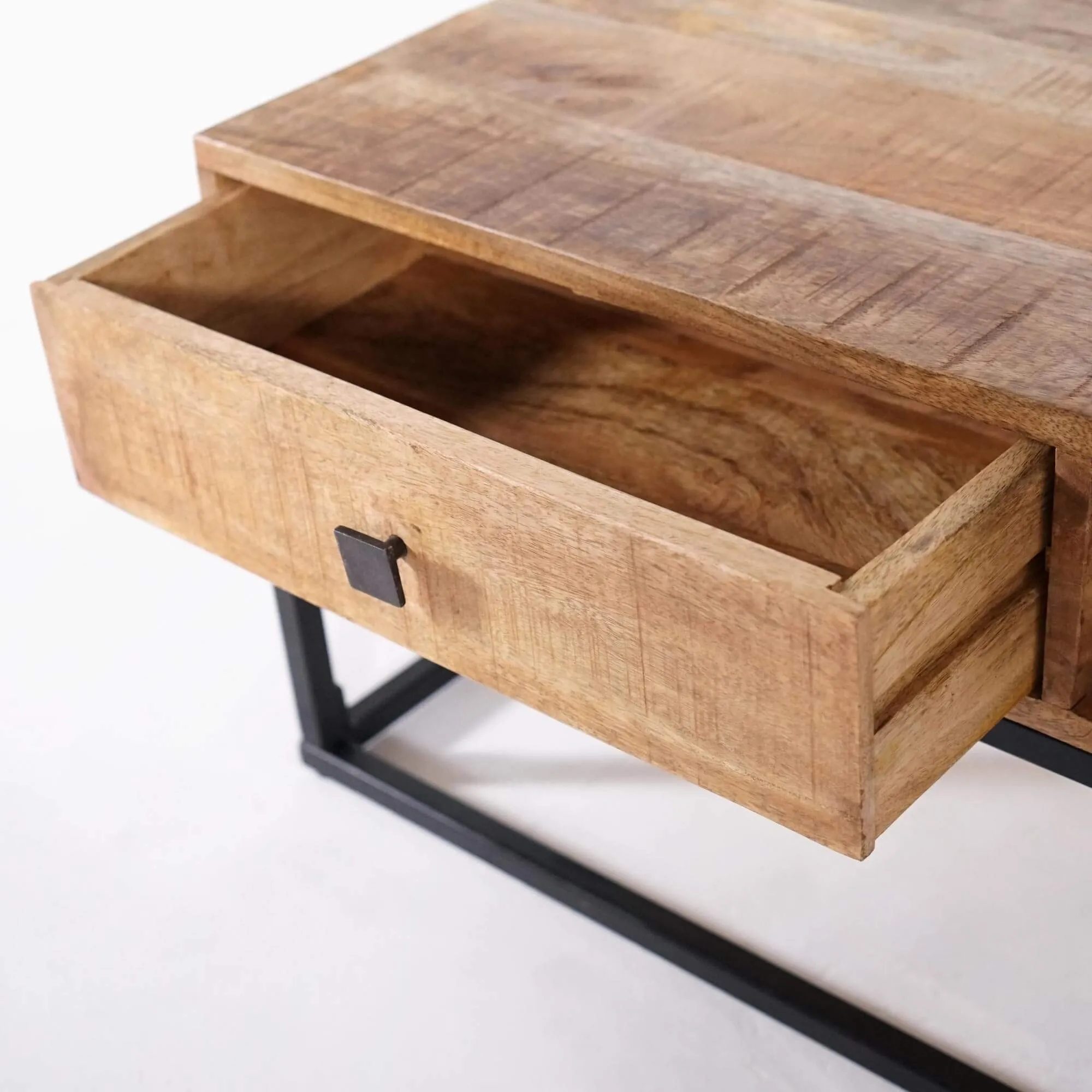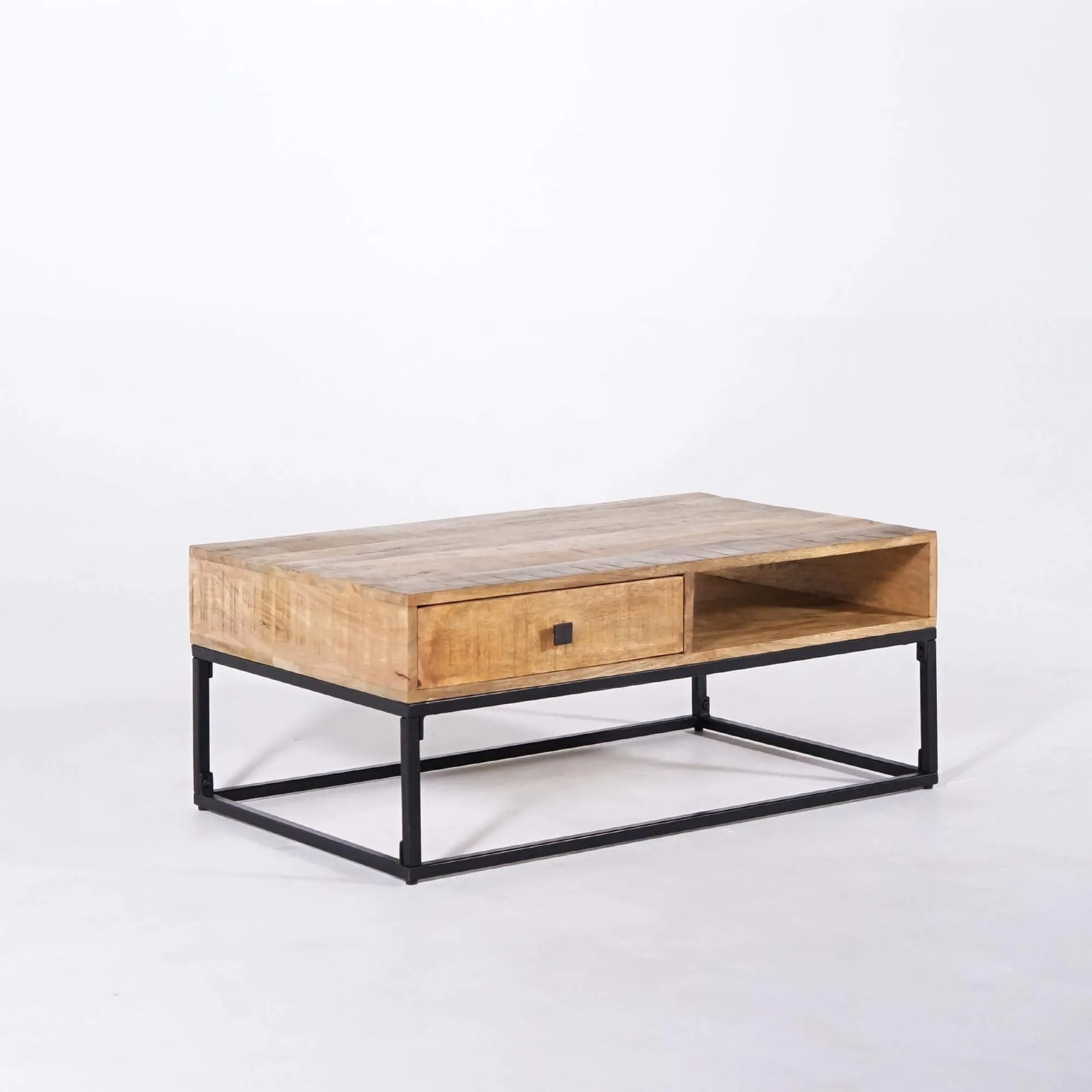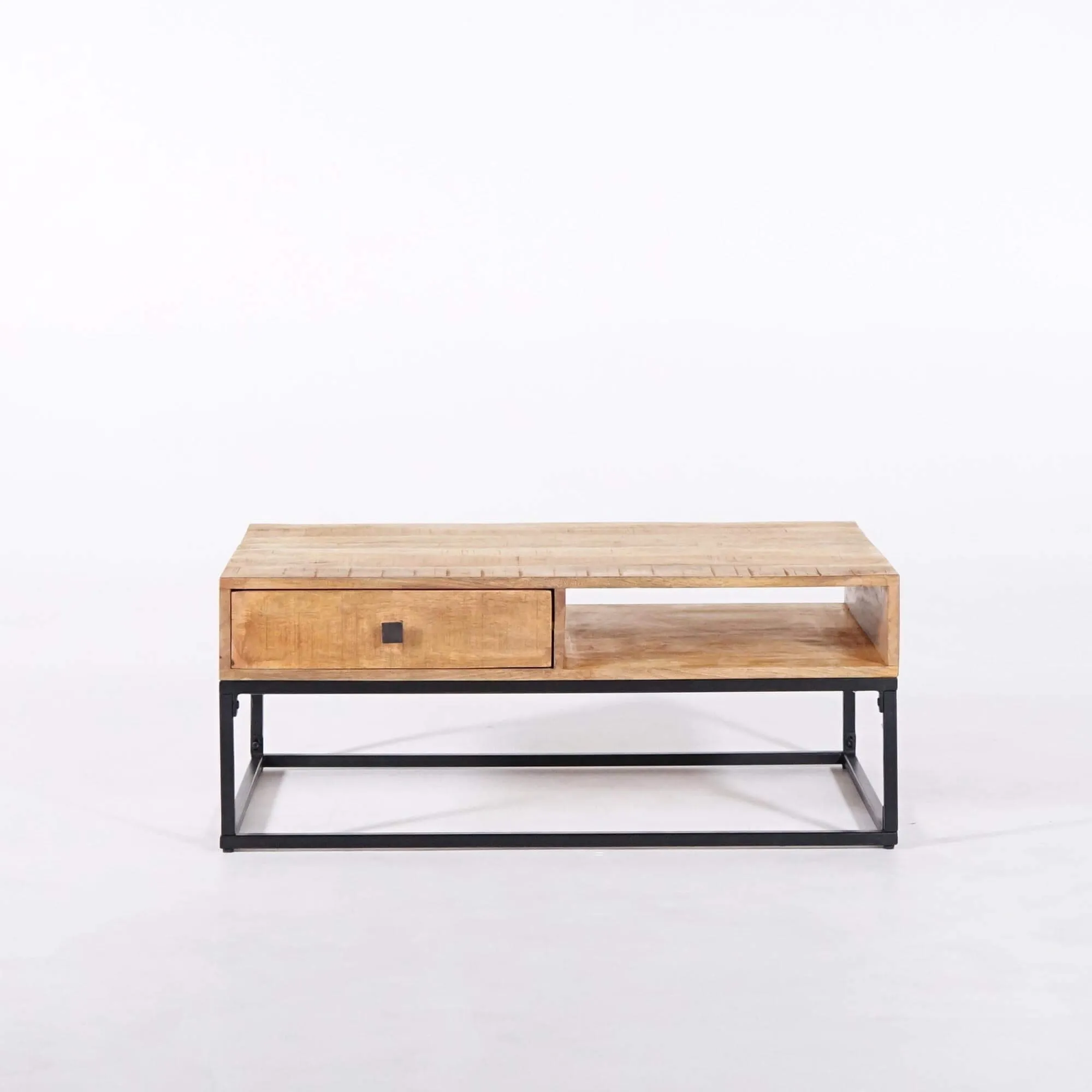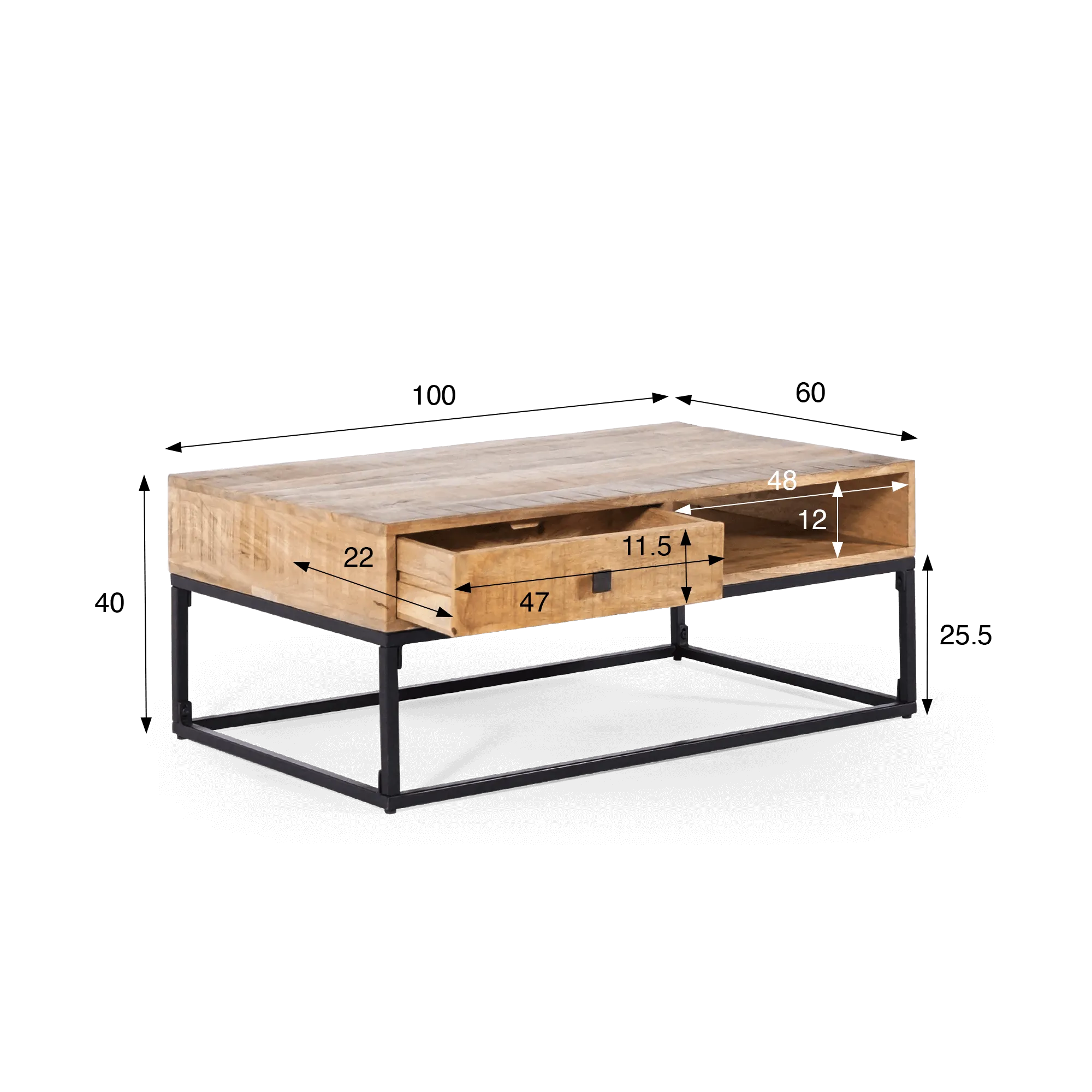 De opbergruimte in deze salontafel in massief mangohout met metalen frame is ontworpen om het dagelijkse leven te ondersteunen zonder de lijnvoering te verzwaren. De twee lades, aan beide zijden geplaatst, bieden een discrete plek voor afstandsbedieningen of accessoires. Elke lade heeft een nuttige breedte van ongeveer 47 cm en een diepte van 22 cm, ideaal voor alledaagse voorwerpen en tegelijk makkelijk bereikbaar. Daarnaast zorgt een open vak van 48 × 12 cm voor een natuurlijke organisatie van tijdschriften of boeken in de woonkamer.