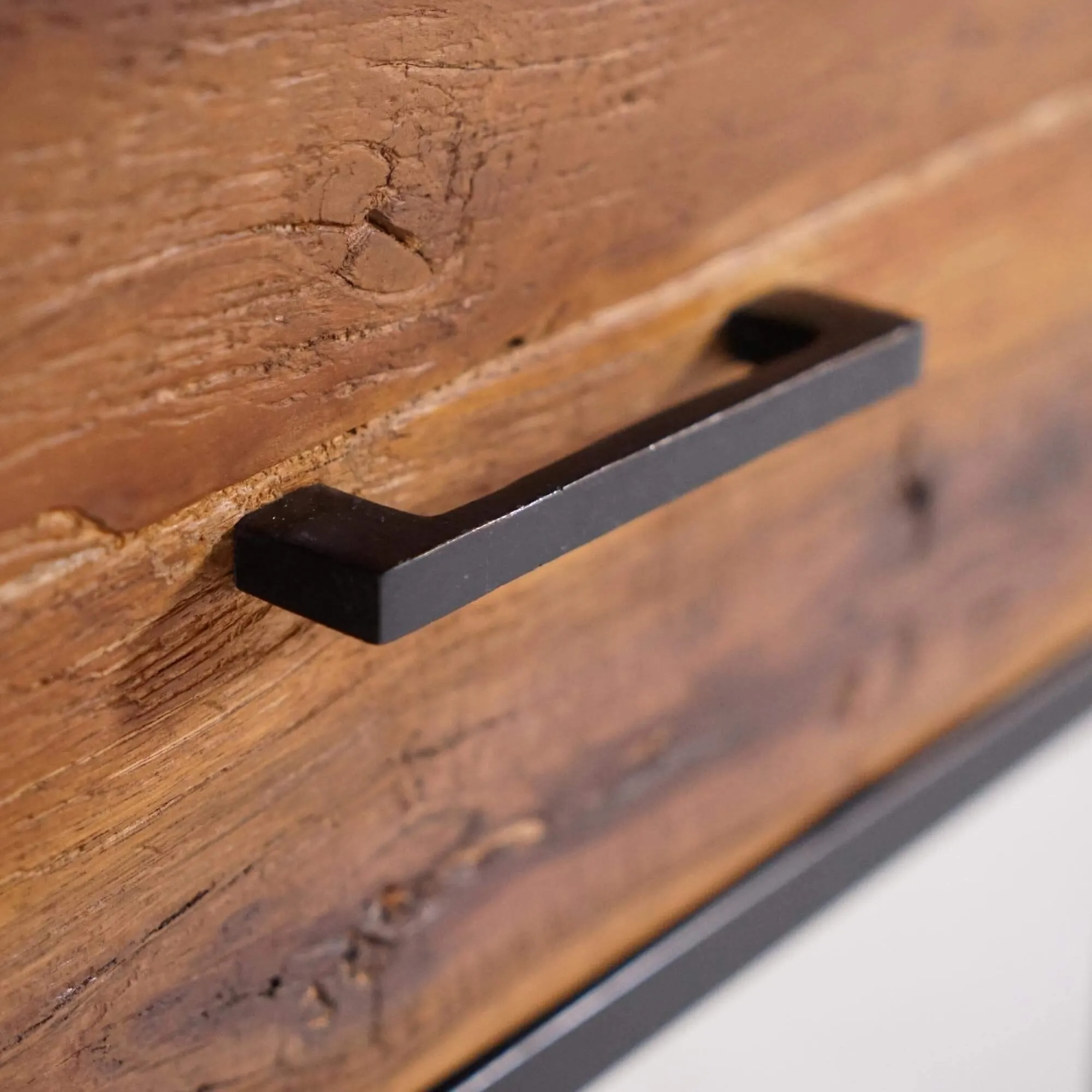 Wij hebben het nachtkastje in gerecycleerd hout Recycled ontworpen als een stuk dat zowel ruw als verfijnd is, waarbij elk detail het verhaal vertelt van het materiaal waarvan het is gemaakt. Vervaardigd uit massief gerecycleerd hout viert het de schoonheid van oude houtsoorten die door de tijd getekend zijn, gecombineerd met een structuur in mat zwart metaal die de moderniteit ervan benadrukt. Deze dialoog tussen authenticiteit en industriële strakheid vat perfect de geest van deze collectie samen: een tweede leven geven aan het materiaal zonder aan elegantie in te boeten.