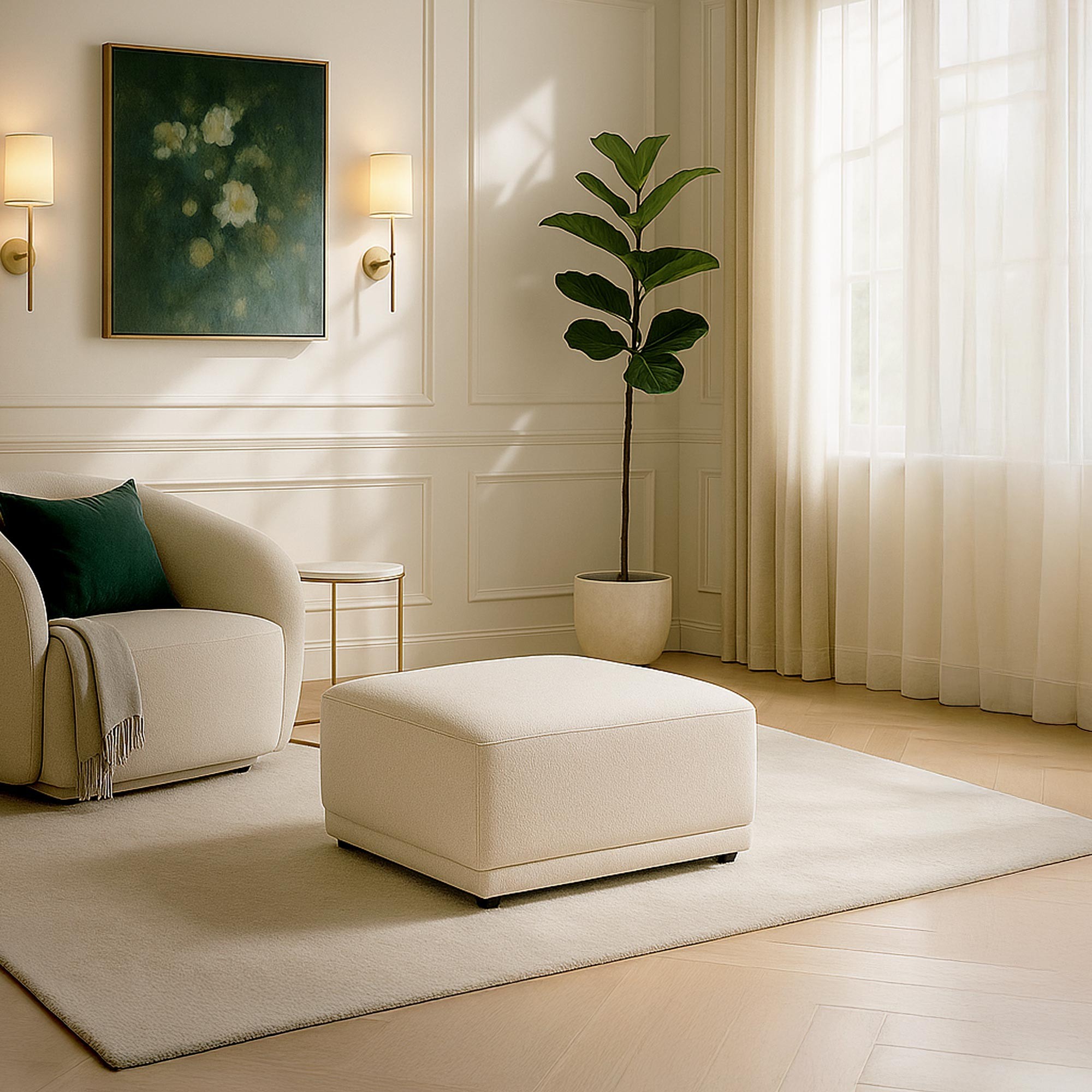 Wij wilden dat deze stoffen poef veel meer zou zijn dan een eenvoudig accessoire: hij belichaamt een idee van comfort tot in de kleinste details, waarbij elke naad en elke afwerking bijdraagt aan de algemene elegantie. Het combineren van de Elora stoffen poef met onze fauteuil uit dezelfde collectie versterkt de visuele samenhang en creëert een vloeiend geheel dat zich zowel in een hedendaags als in een klassiek interieur kan integreren.