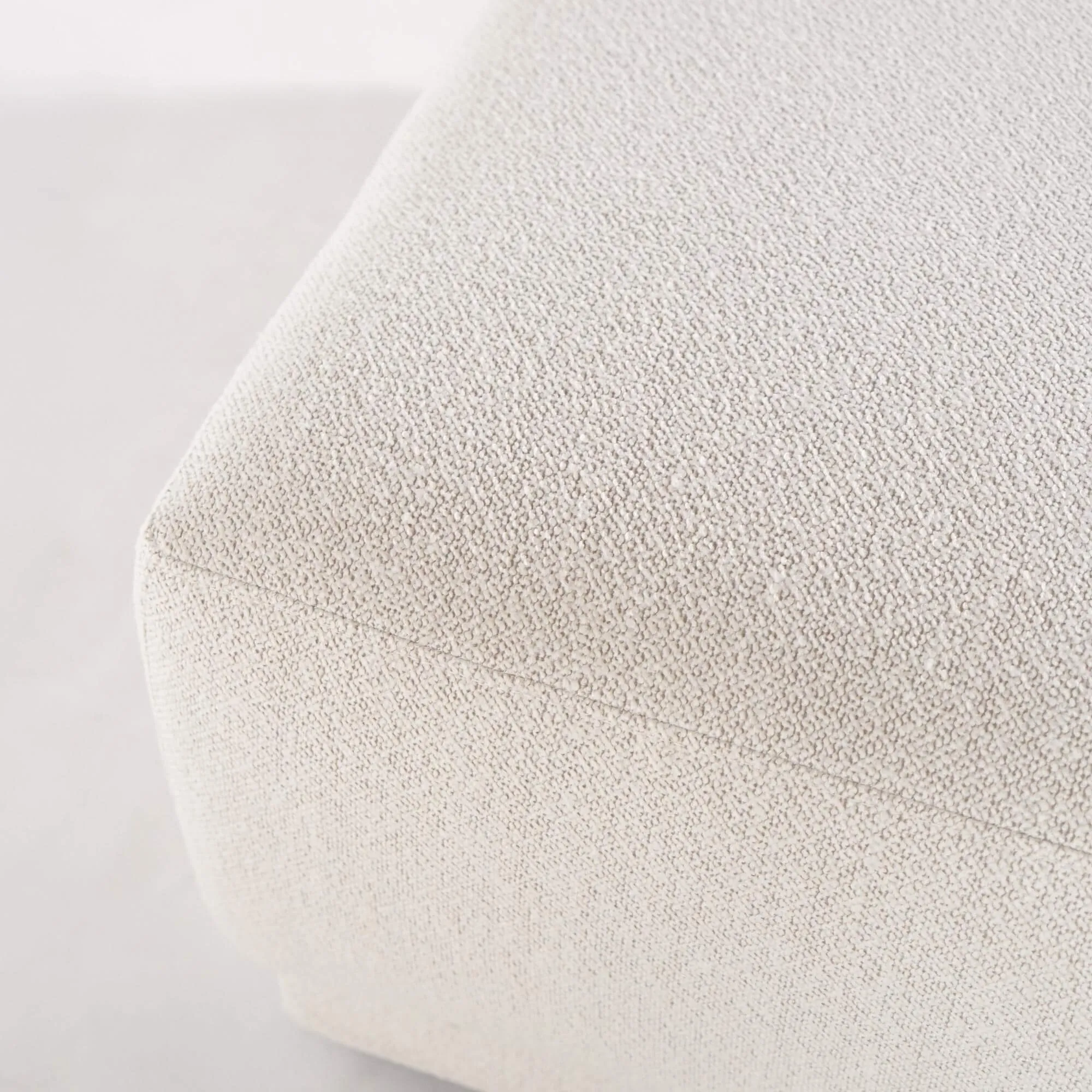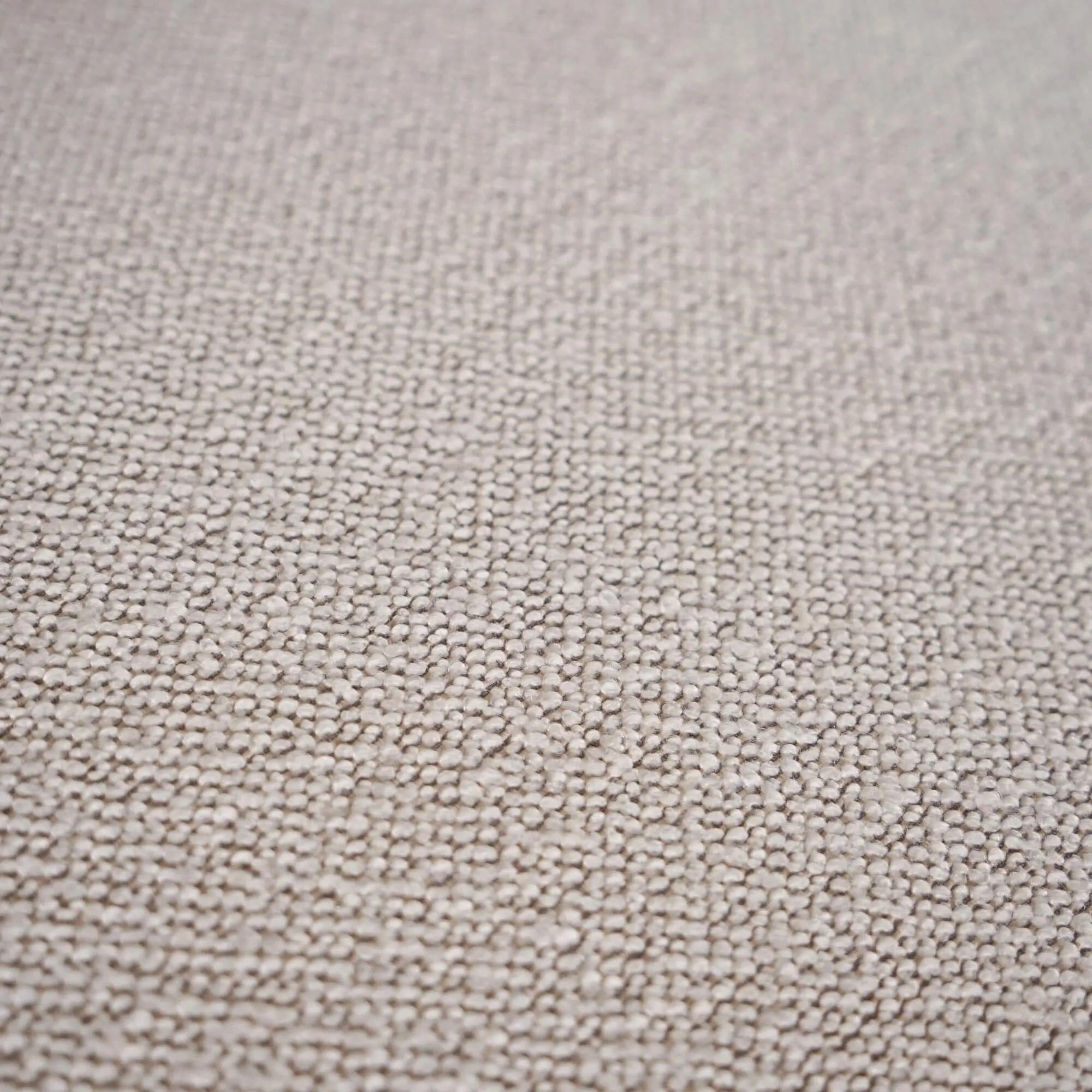 Gemaakt van een getextureerde boucléstof, Oeko-Tex®-gecertificeerd, overtuigt deze stoffen poef door zijn aangename gevoel en opmerkelijke stevigheid. Met een zorgvuldig bepaalde dichtheid en een dichte weving garandeert deze bekleding een perfecte vormvastheid in de tijd, zelfs bij dagelijks gebruik. Binnenin combineerden we een HR-schuim met hoge veerkracht, veren en verschillende lagen PU-schuim om een duurzaam en stabiel comfort te bieden. Het discrete zwarte onderstel in kunststof laat de poef een zwevende uitstraling behouden en verzekert tegelijk een solide basis.
