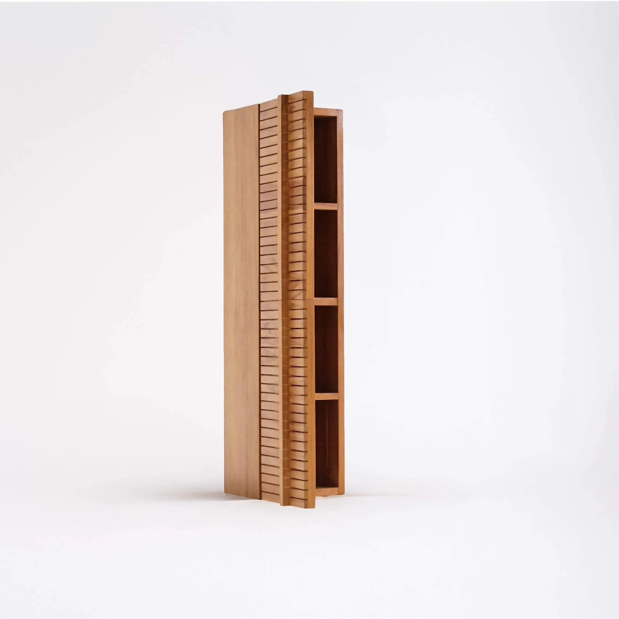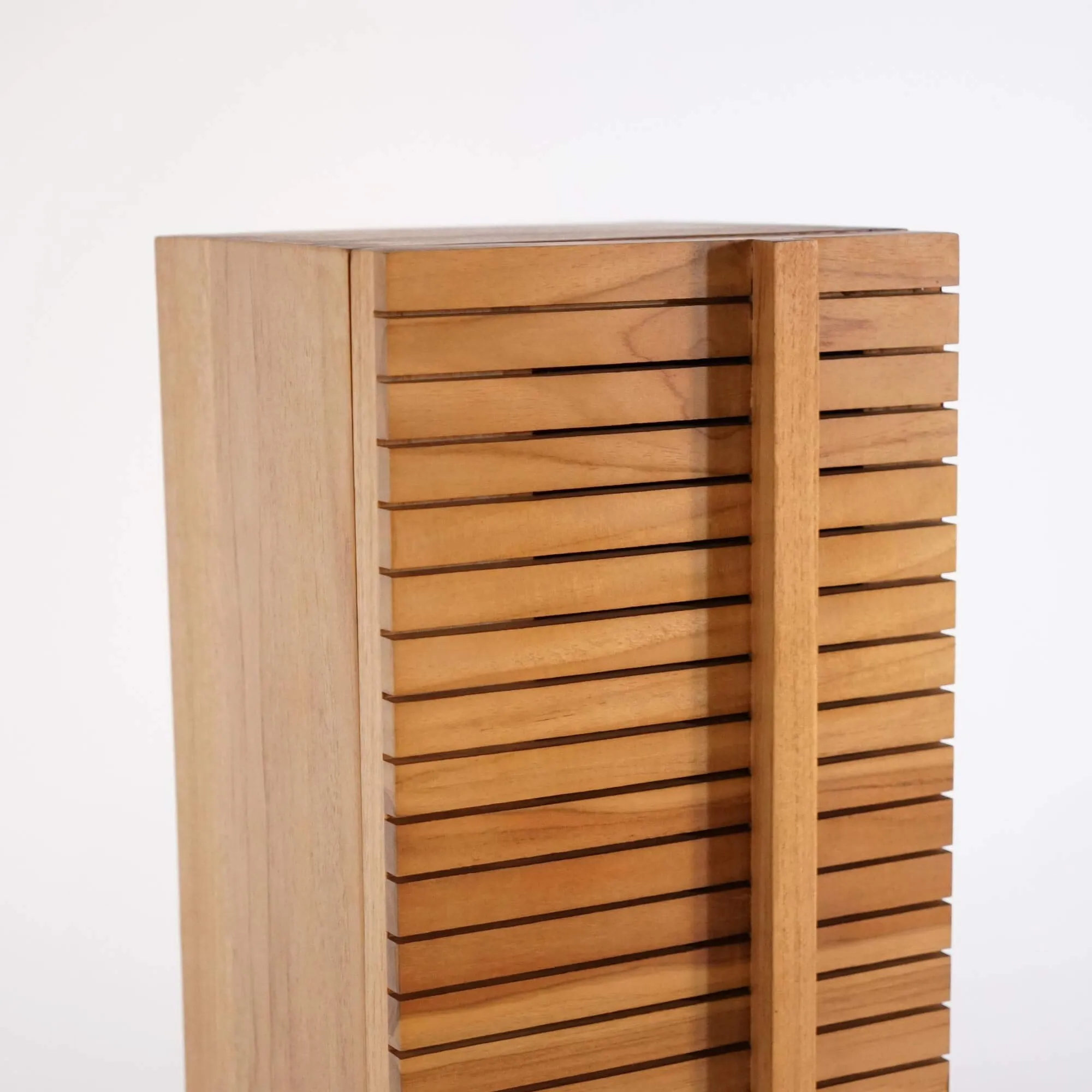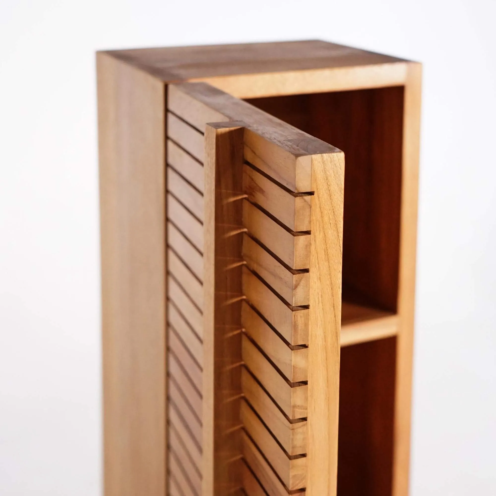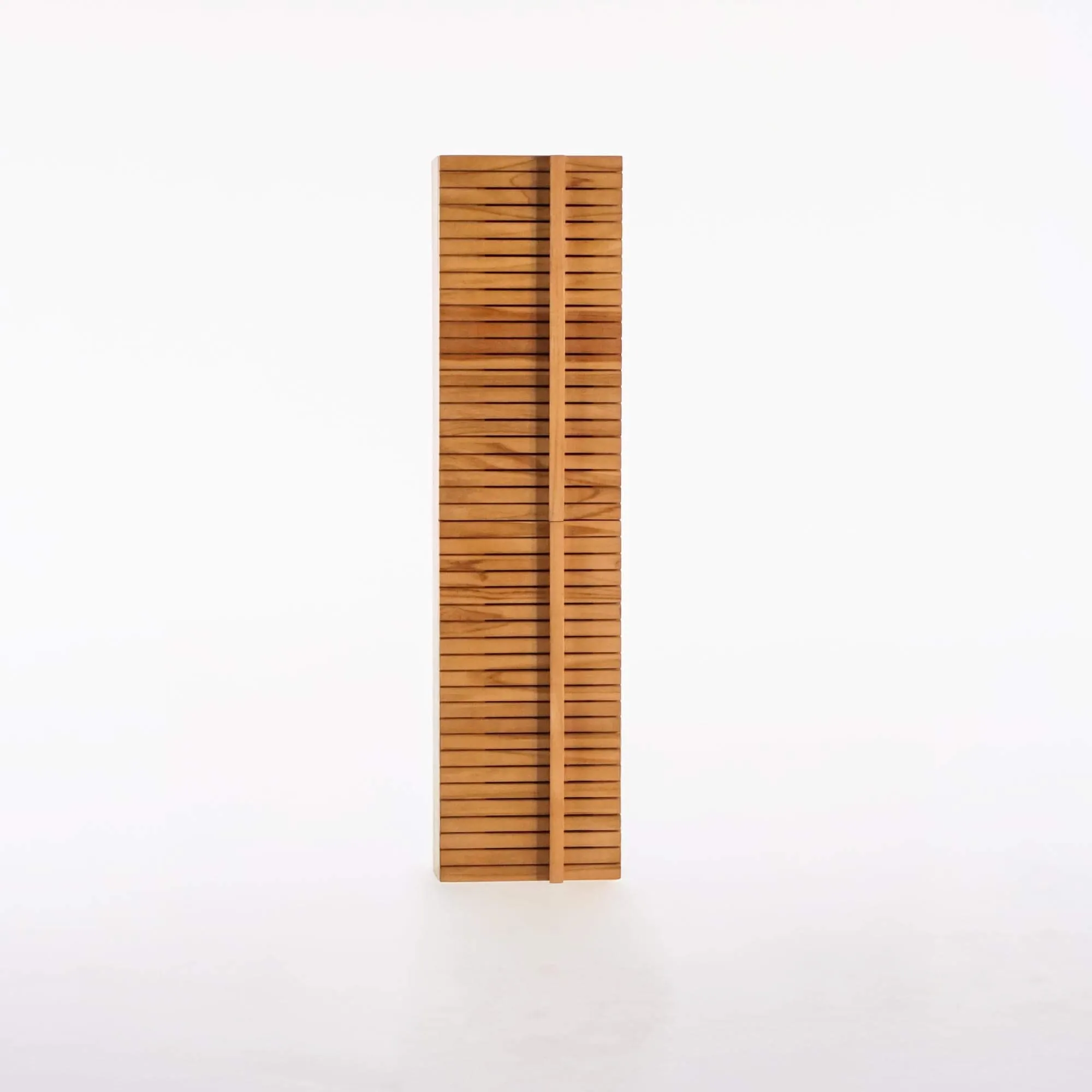 De verfijnde, verticale vorm van deze massief teakhouten badkamerkolom vindt zijn evenwicht in het patroon van de fijne lamellen die de twee draaideuren sieren. Elke groef onthult de rijkdom van het hout en zijn gouden nuances, terwijl de zachte randen en geïntegreerde handgrepen de Japandi-geest oproepen — een esthetiek die eenvoud en ambachtelijk vakmanschap waardeert.