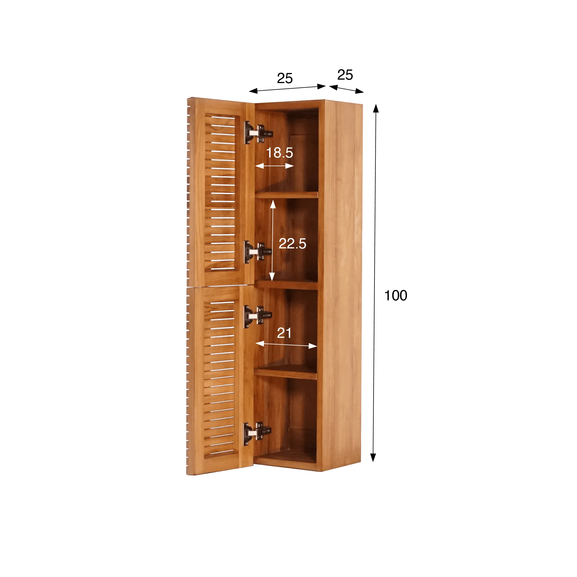 Wij hebben de massief teakhouten badkamerkolom Devika ontworpen als een natuurlijke verlenging van het wastafelmeubel uit dezelfde collectie: een zwevend meubel in massief teak, bedacht om elegantie, ergonomie en rust te verenigen. Dit wandmeubel, 100 cm hoog en 25 cm diep, oogt licht maar biedt toch een echte opbergcapaciteit.