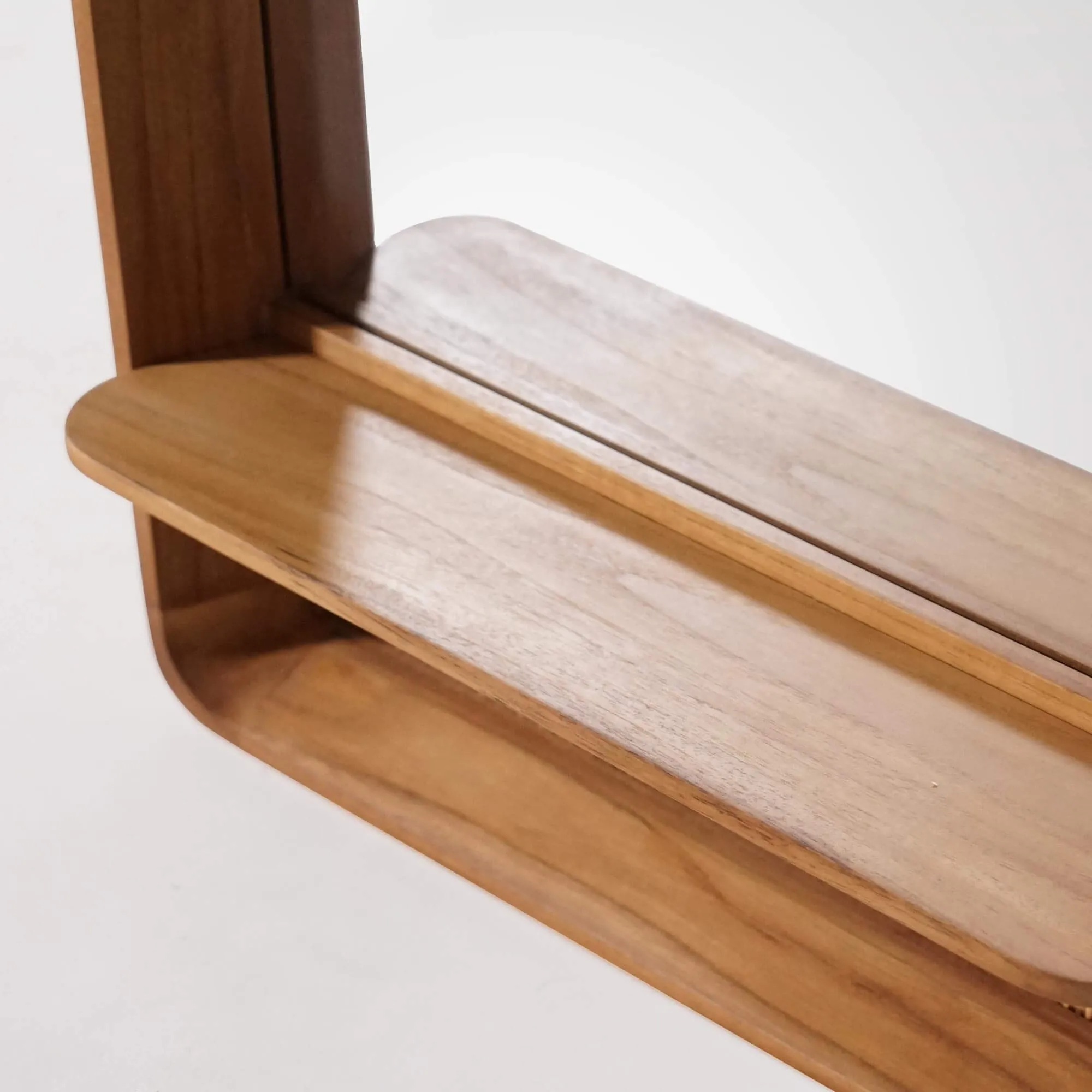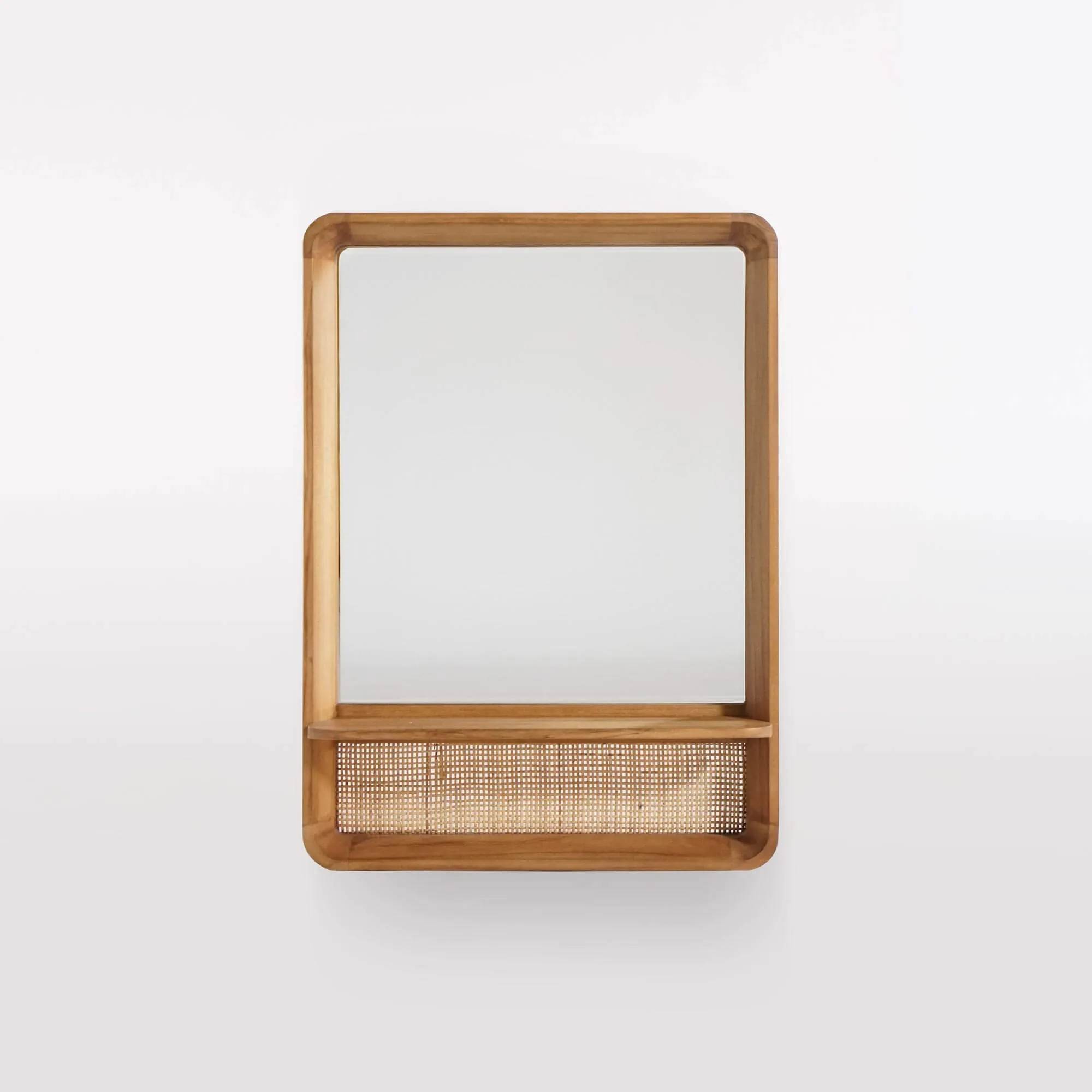 We hebben deze rechthoekige spiegel in teakhout en rotan ontworpen als een stuk dat zowel functioneel als decoratief is, bedoeld om onze badkamermeubels in massief teakhout te vergezellen en tegelijk een echte esthetische autonomie te behouden. De zachte, afgeronde lijnen weerspiegelen onze wens om functionaliteit te combineren met natuurlijke elegantie: een kader van massief teakhout, een geïntegreerde legplank en een onderste nis afgewerkt met rotanvlechtwerk voor een resultaat dat zowel sober als warm en verfijnd is.