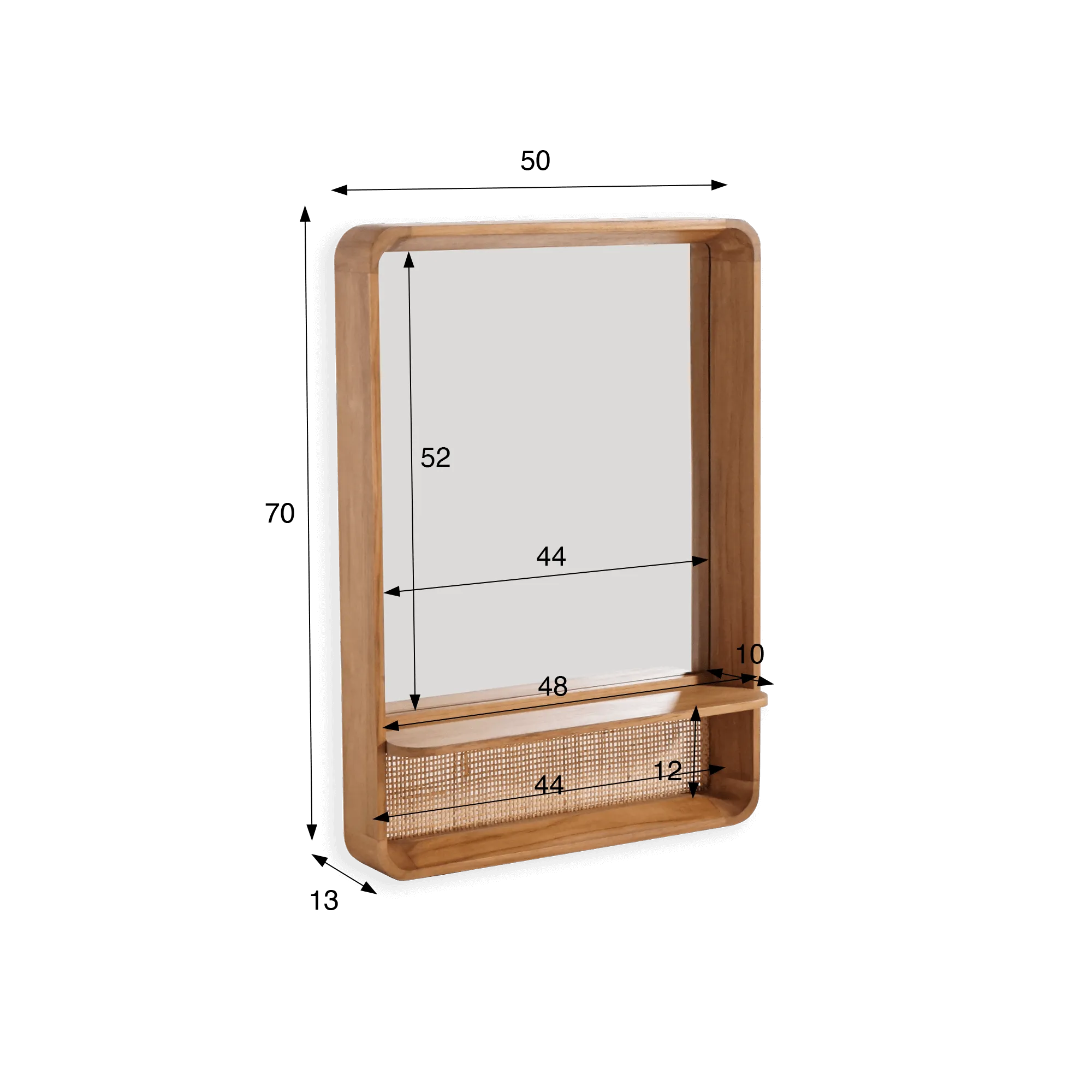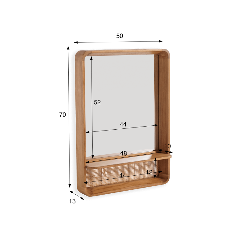Met een hoogte van 70 cm en een breedte van 50 cm biedt deze rechthoekige spiegel in teakhout en rotan een mooie reflecterende oppervlakte (44 × 52 cm), gecombineerd met een praktisch opbergvak. De plank, 10 cm diep, is ideaal om dagelijkse benodigdheden op te plaatsen: flessen, parfums of verzorgingsaccessoires. Onder deze plank zorgt het natuurlijke rotanvlechtwerk voor een subtiel spel van texturen en licht, een knipoog naar het ambachtelijke vakmanschap van onze ateliers.