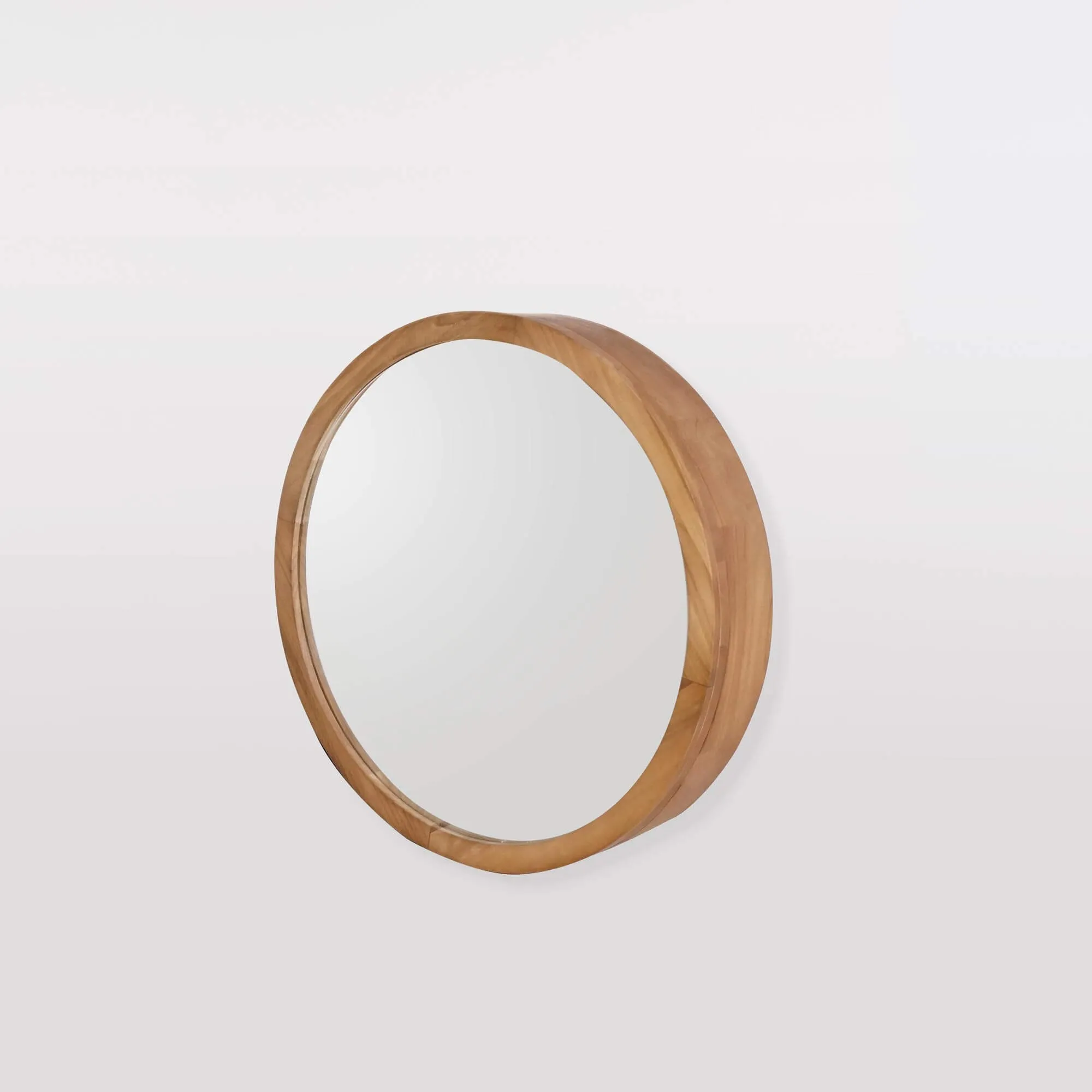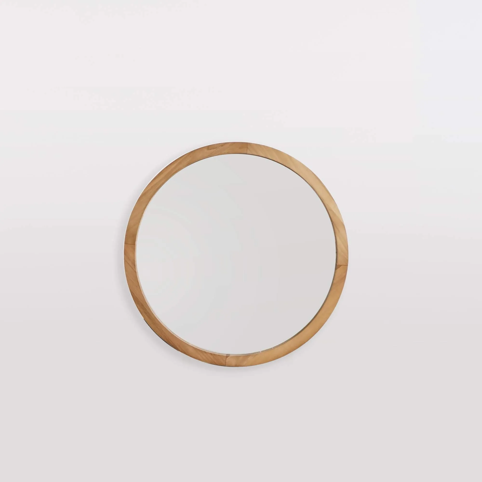 De keuze voor massief teakhout was vanzelfsprekend voor deze ronde badkamerspiegel met opbergvak. Van nature bestand tegen vocht, geeft het de spiegel een uitzonderlijke duurzaamheid en behoudt het zijn glans door de jaren heen. Elk stuk wordt ambachtelijk vervaardigd, en de unieke houtnerf maakt er een object met een eigen karakter van. Onze ontwerpers wilden de essentie van het materiaal behouden: geen overbodige details, geen artificie, enkel een evenwicht tussen functie en emotie.