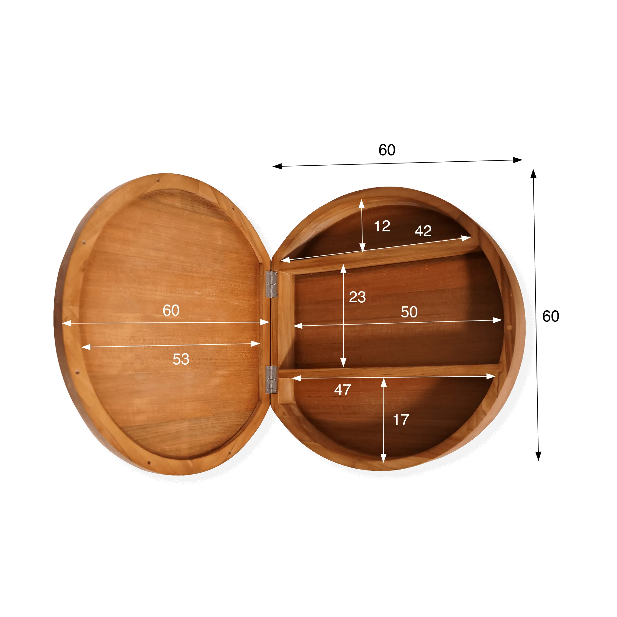 De diameter van 60 cm van deze ronde badkamerspiegel met opbergvak past perfect in een uitgebalanceerde geometrie, ontworpen om zich zowel aan kleine als grote badkamers aan te passen. Op het eerste gezicht charmeert hij door de verfijning van zijn rand en de natuurlijke warmte van het teakhout. Eenmaal geopend onthult hij twee binnenplanken – met een hoogte van 23 cm voor de centrale ruimte – ideaal om dagelijkse benodigdheden te organiseren: flesjes, parfums of verzorgingsproducten. De discrete scharnieren en de verfijnde uitsnijding van het kader zorgen voor een soepele opening en stabiele sluiting.