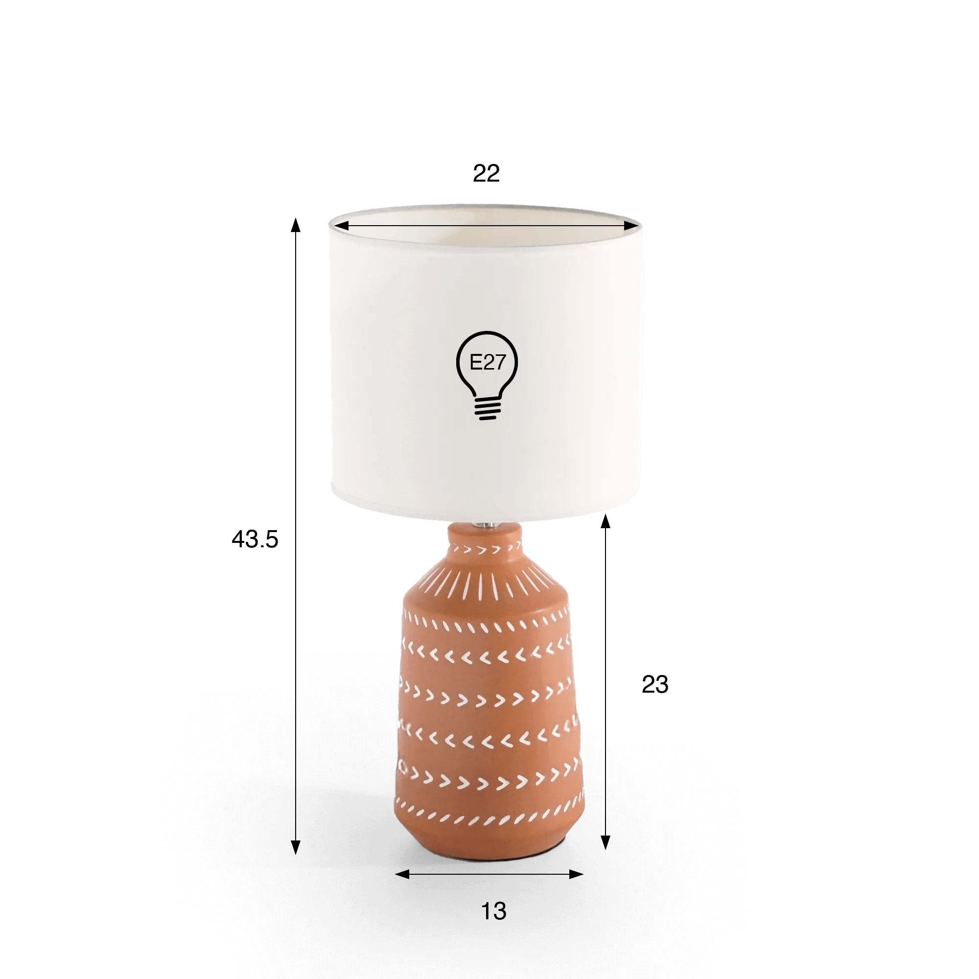 Het formaat van deze ambachtelijke terracotta keramische lamp werd ontworpen om zich gemakkelijk in het dagelijks leven te integreren: met een totale hoogte van 43,5 cm staat ze net zo natuurlijk op een nachtkastje als op een dressoir, bureau of console in de inkomhal. De keramische voet, 23 cm hoog en 13 cm breed, zorgt voor uitstekende stabiliteit en benadrukt tegelijk haar bohemien en etnische stijl. De cilindervormige lampenkap met een diameter van 22 cm verspreidt een zachte verlichting, ideaal om aan het einde van de dag een warme sfeer te creëren. We kozen voor een E27-fitting, compatibel met een ruime keuze aan lampen, zodat iedereen vrij kan bepalen welke lichtsfeer het best bij het interieur past.