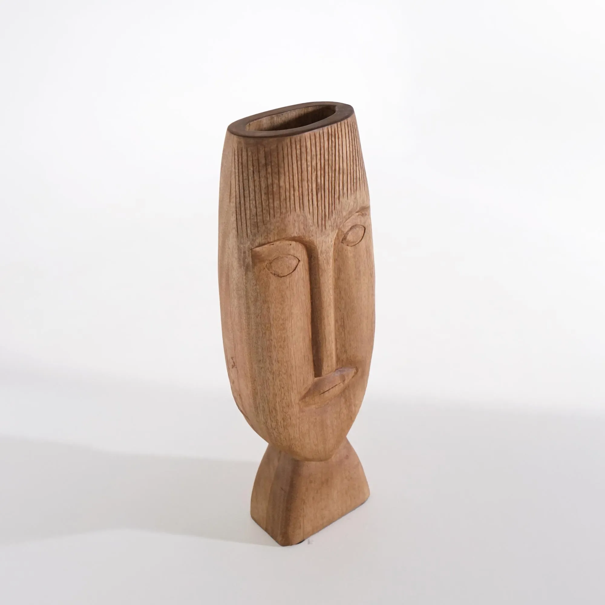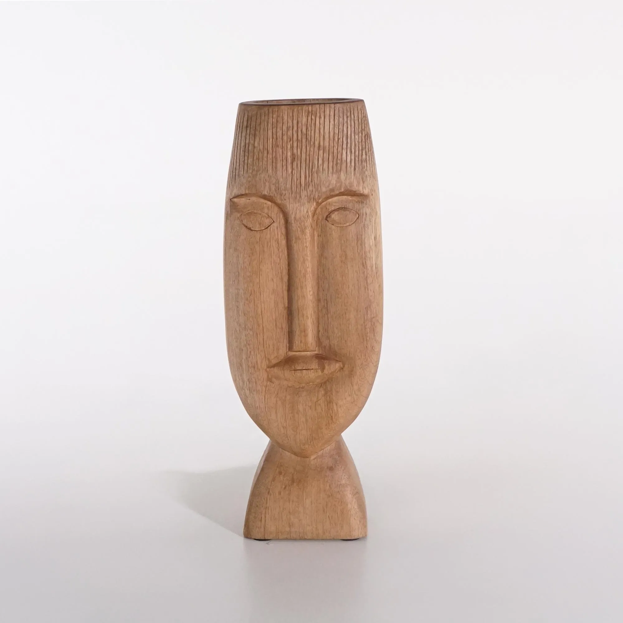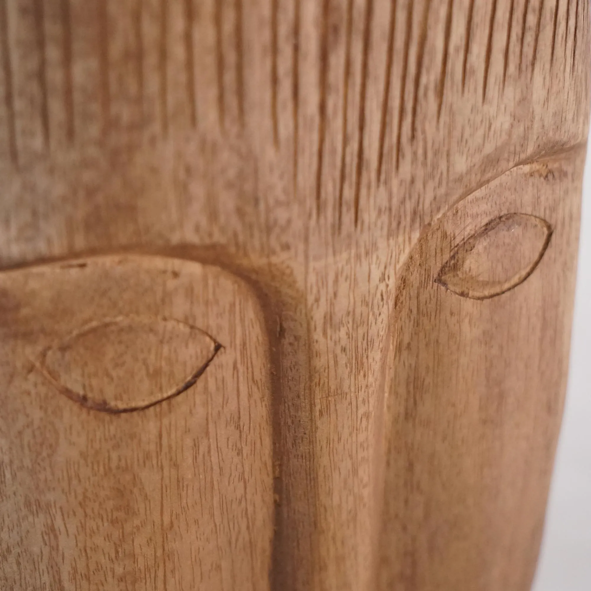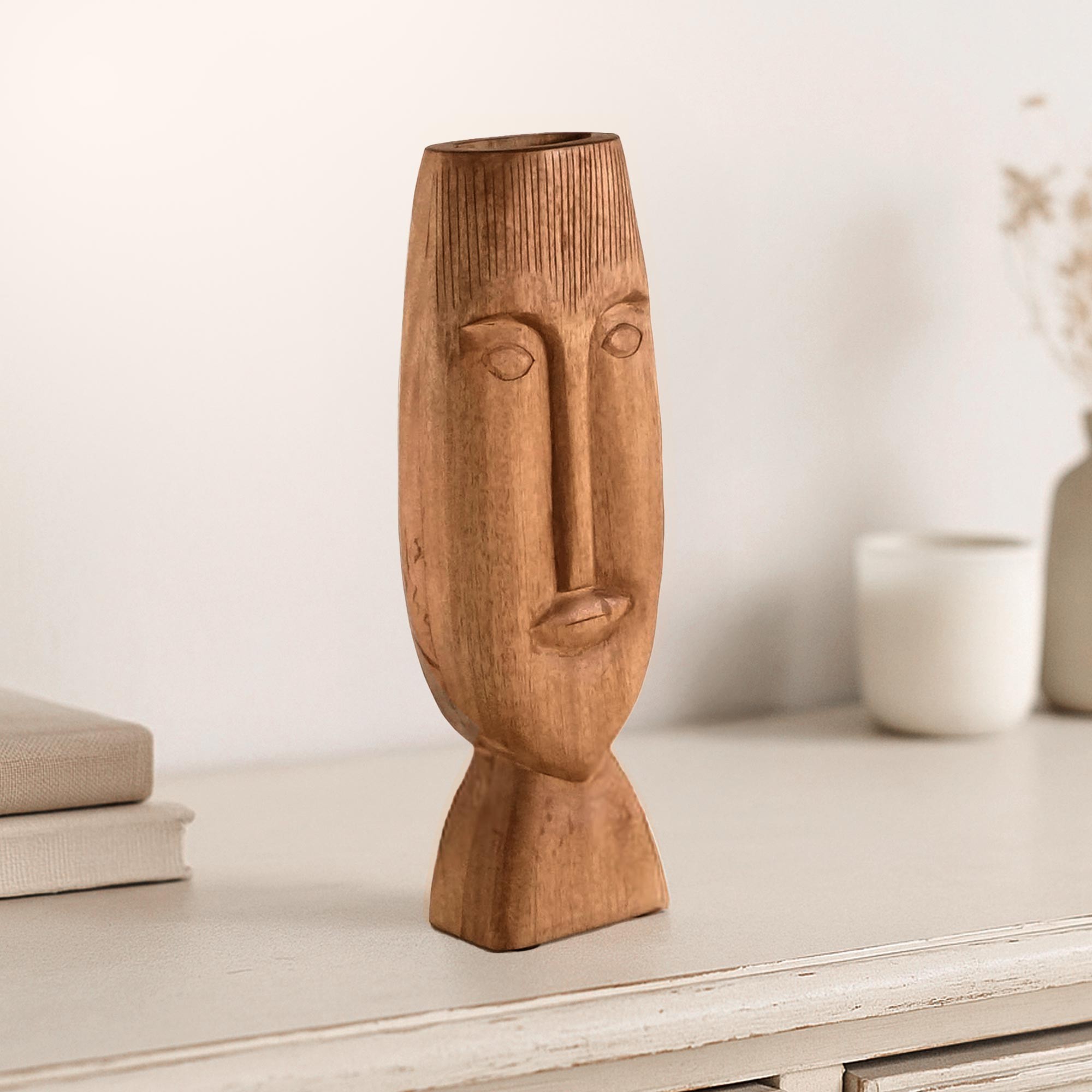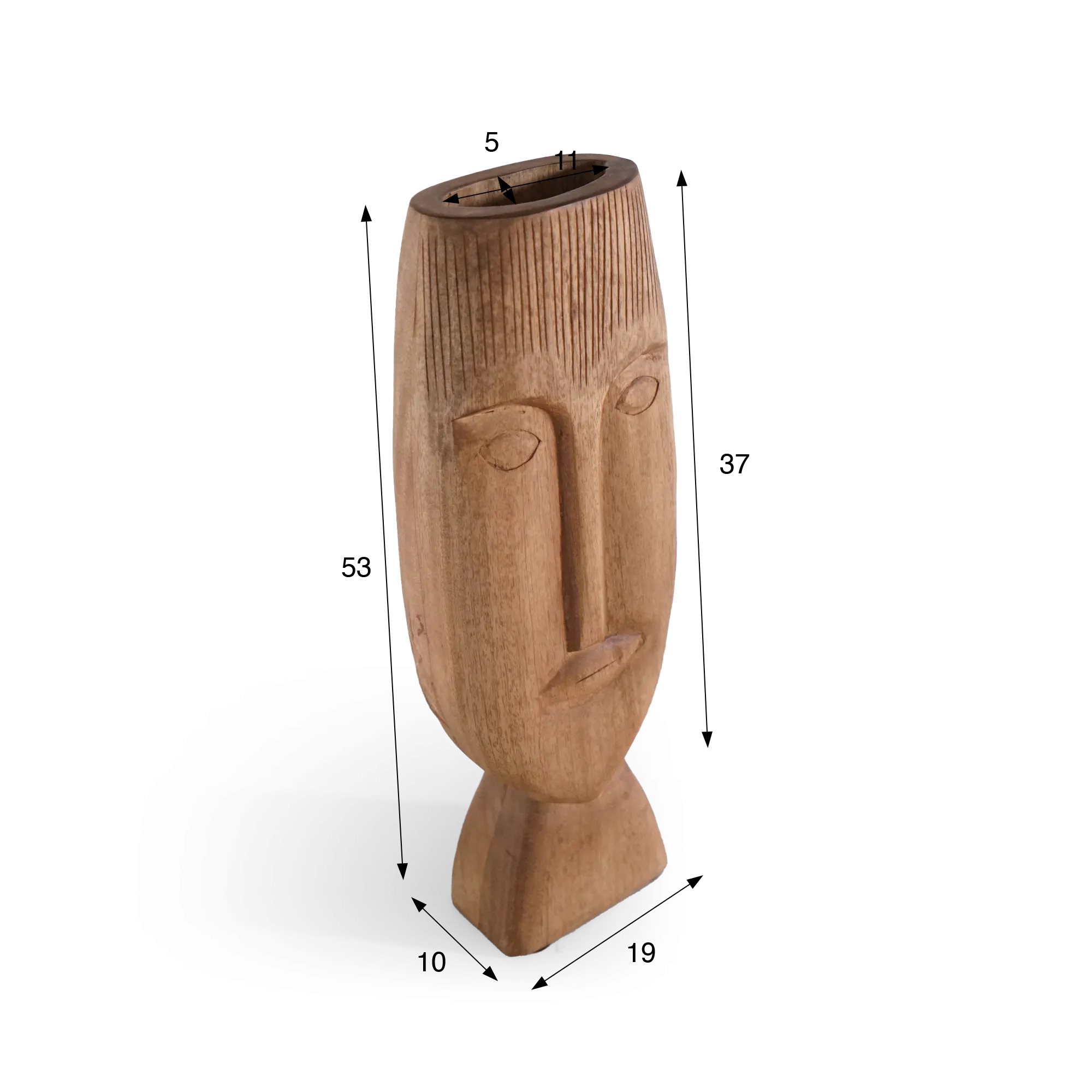 Met een hoogte van 53 cm trekt dit slanke, met de hand gesculpteerde houten beeld de aandacht door de zuiverheid van zijn vormen en de subtiliteit van zijn volumes. Het gestileerde gezicht, uit één enkel stuk hout gesneden, doet denken aan tribale figuren en primitieve kunst, terwijl het een moderne en verfijnde interpretatie behoudt. De fijne nerf van het mangohout, zijn gouden tinten en zijdeachtige textuur onthullen de edelheid van het materiaal, terwijl elk detail van het handwerk getuigt van het ambachtelijke vakmanschap dat ons na aan het hart ligt.