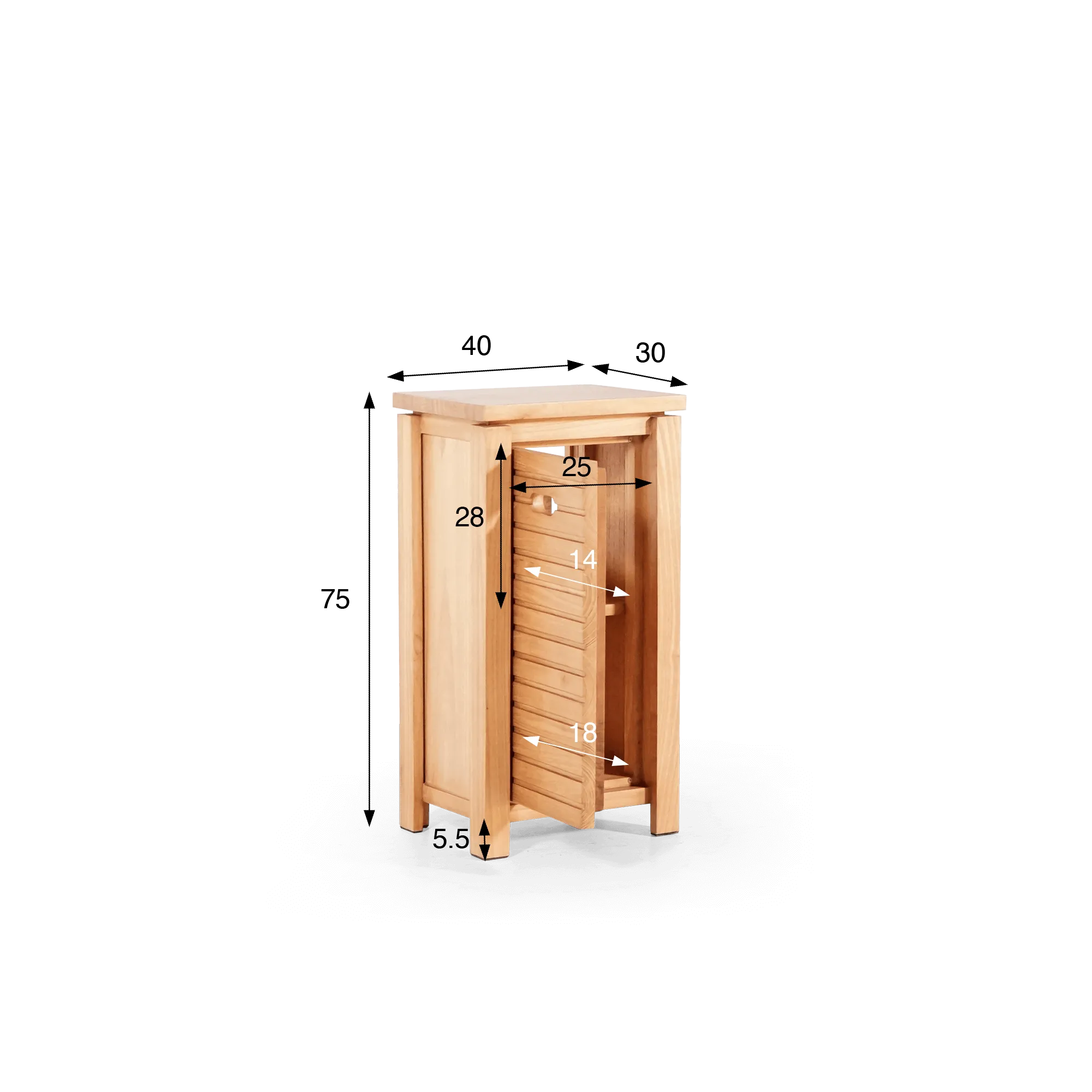 De slanke vorm van dit massief houten wasmeubel – 75 cm hoog en 40 cm breed – werd ontworpen om de ruimte optimaal te benutten zonder aan comfort in te boeten. Achter de draaideur hebben onze ontwerpers twee opbergniveaus geïntegreerd (28 cm hoog per compartiment), ideaal voor verzorgingsproducten, kleine handdoeken of dagelijkse accessoires. De binnendiepte van 14 tot 18 cm, afhankelijk van het compartiment, biedt praktische opbergoplossingen bij een minimaal ruimtebeslag. De discrete opening, rechtstreeks in het hout uitgewerkt, vervolledigt het geheel met de functionele eenvoud die voor ons essentieel was.