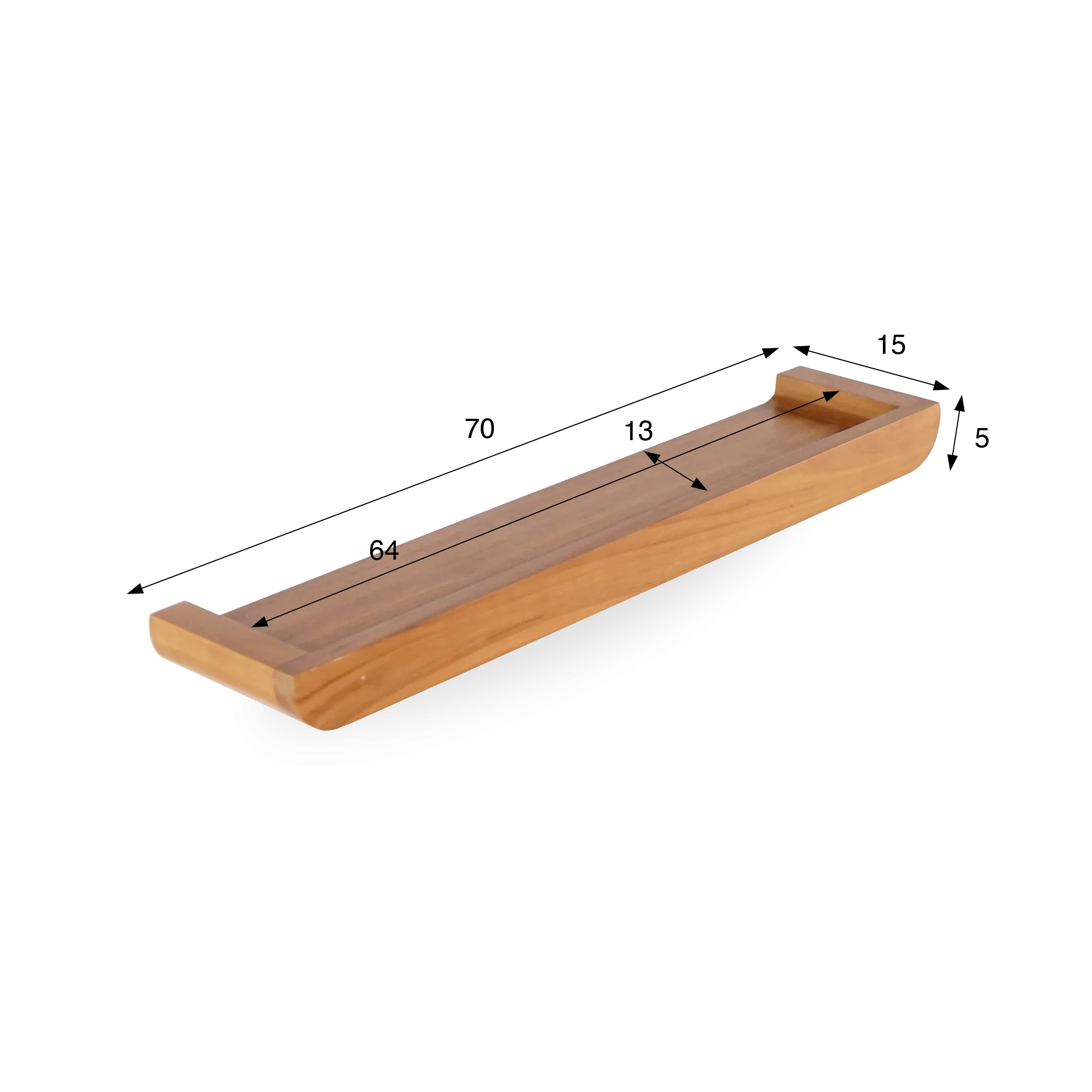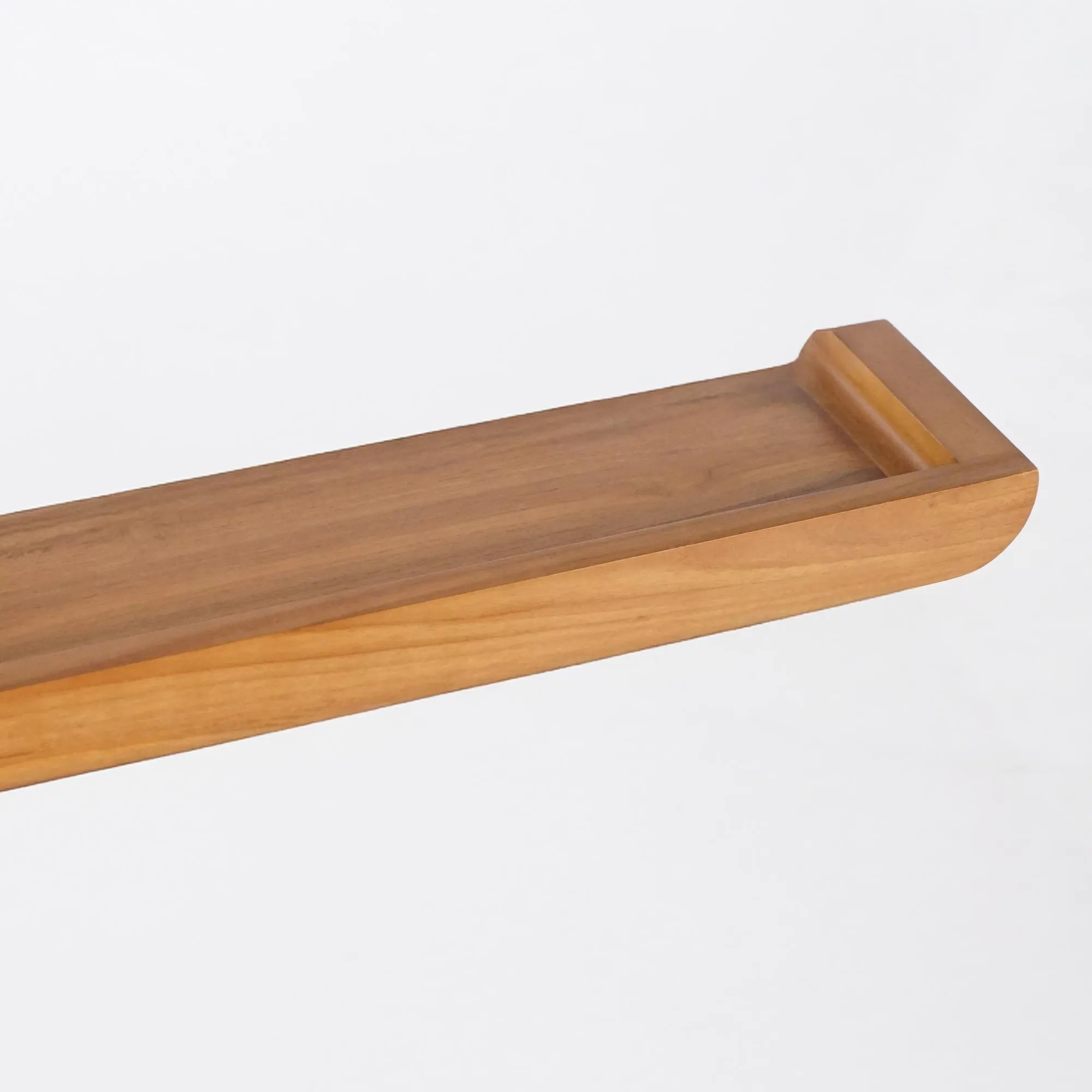 Uitgehouwen uit zorgvuldig geselecteerd massief teakhout, onderscheidt deze wandplank zich door haar slanke profiel en zacht afgeronde hoeken. De natuurlijke nerf, de goudbruine schakeringen en de satijnglansafwerking benadrukken de warmte en edele uitstraling van deze tropische houtsoort, die van nature bestand is tegen vocht.