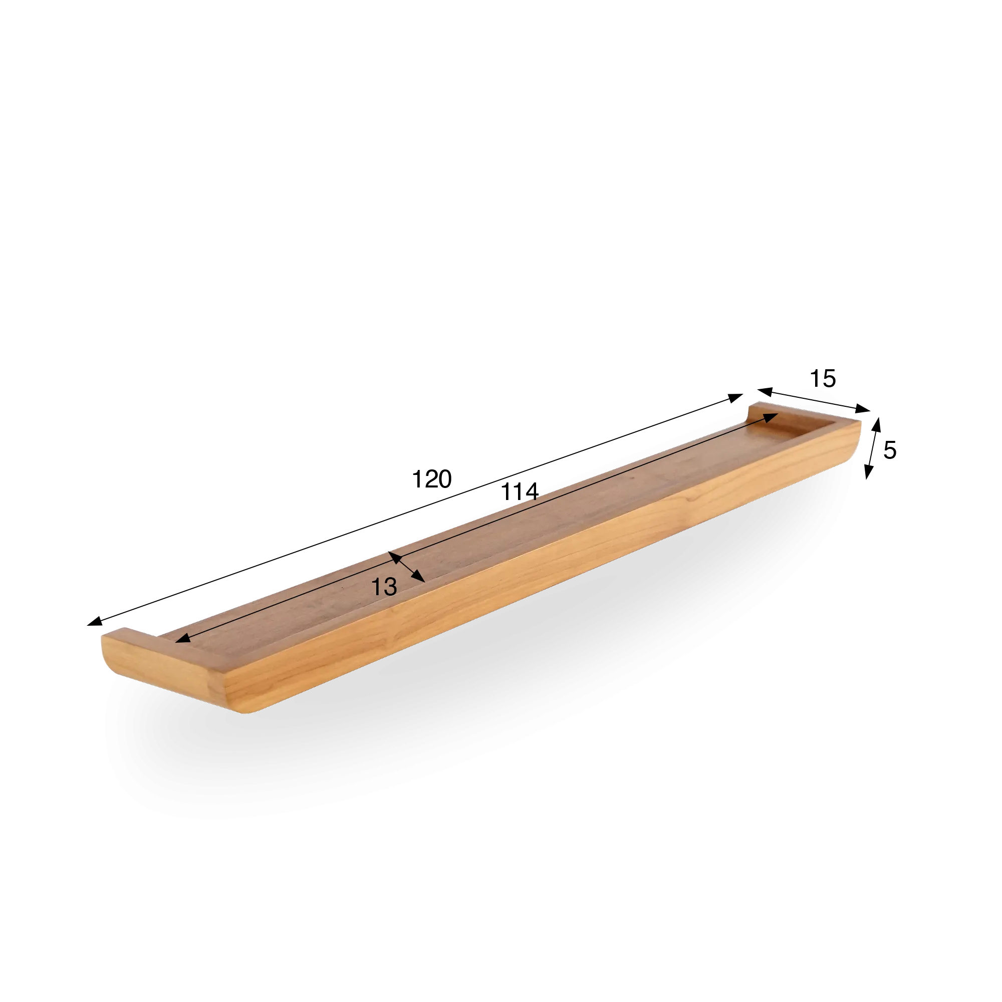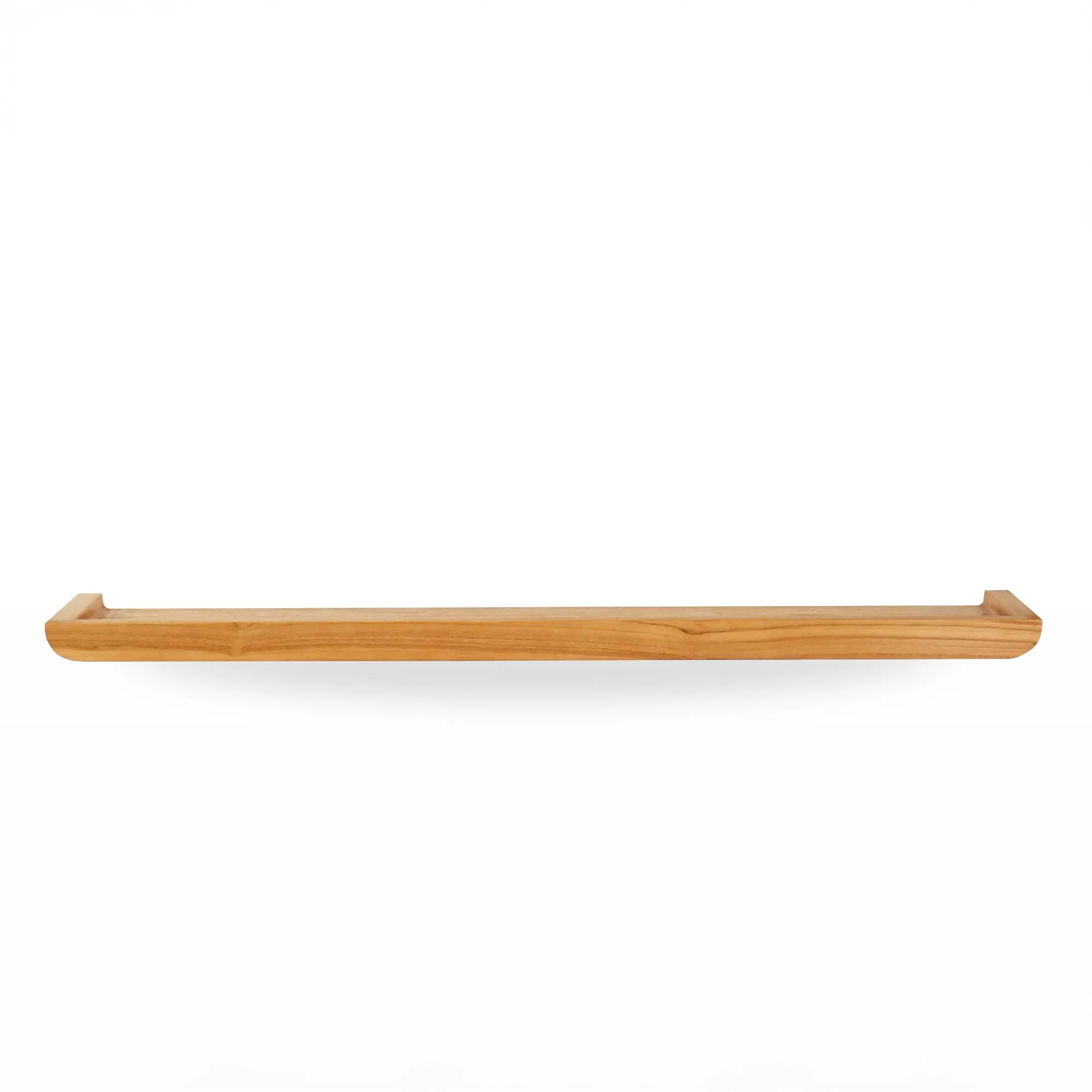 Met haar evenwichtige verhoudingen — 120 cm lang, 15 cm diep en 5 cm hoog — biedt deze wandplank in massief teakhout voldoende ruimte voor alledaagse objecten zoals flacons, zeep, kaarsen of kleine decoratieve planten. De subtiel opstaande rand houdt de voorwerpen op hun plaats en geeft de plank een vloeiende, elegante vorm.