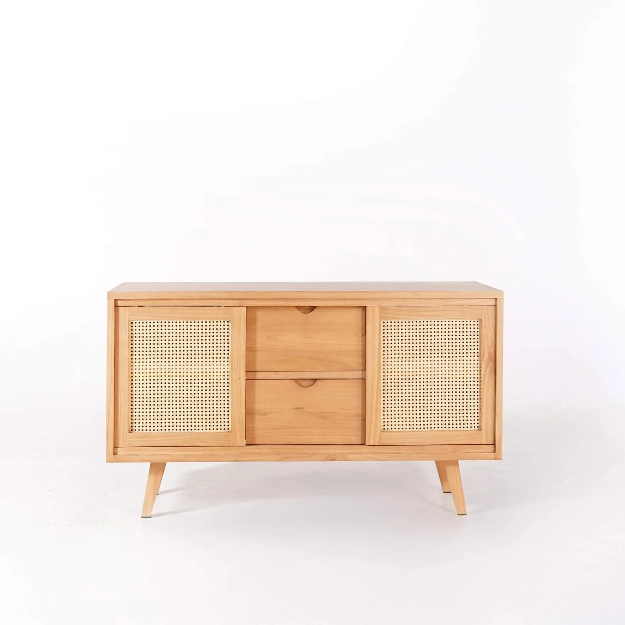 Gemaakt van massief mindihout, een houtsoort die bekendstaat om zijn natuurlijke weerstand tegen vocht en zijn stabiliteit in de tijd, verenigt het badkamermeubel Anaya stevigheid en elegantie. De zichtbare houtnerf, afgewerkt met een satijnen vernis, geeft elke kast een warme en levendige uitstraling, uniek voor elk stuk. De schuifdeuren aan de voorkant zijn voorzien van een fijn handgevlochten rotan dat de structuur verlicht en de inhoud laat ademen.