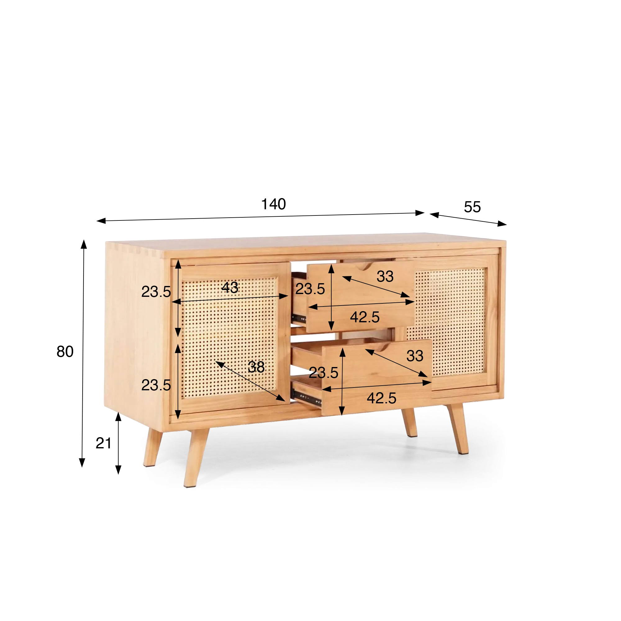 Achter deze deuren bevindt zich een doordachte opbergruimte die gemakkelijk plaats biedt aan de dagelijkse benodigdheden. Daarbovenop zijn er twee centrale laden van 42,5 cm breed en 33 cm hoog, gemonteerd op metalen geleiders met een soepele opening – ideaal om kleine toiletartikelen te organiseren. Aan beide zijden bieden de compartimenten van dit massief houten badkamermeubel op poten (43 cm breed en 23,5 cm hoog per legplank) ruimte voor handdoeken, manden of verzorgingsproducten. Het geheel rust op schuine poten van massief hout van 21 cm hoog, wat het meubel een luchtige, elegante uitstraling geeft en het schoonmaken van de vloer vergemakkelijkt.