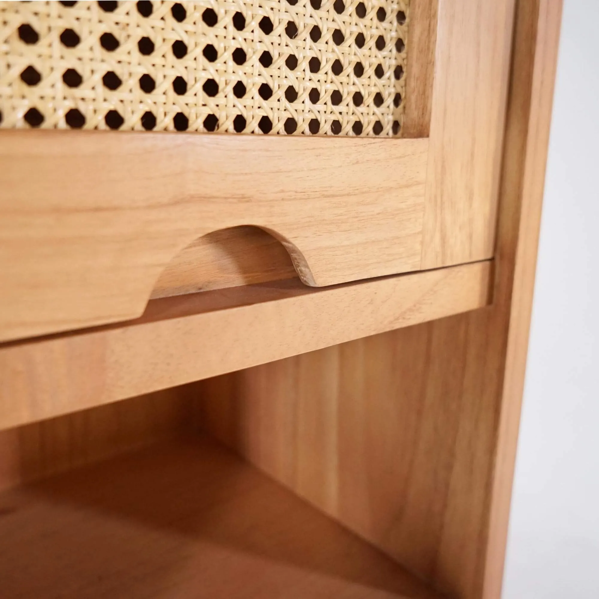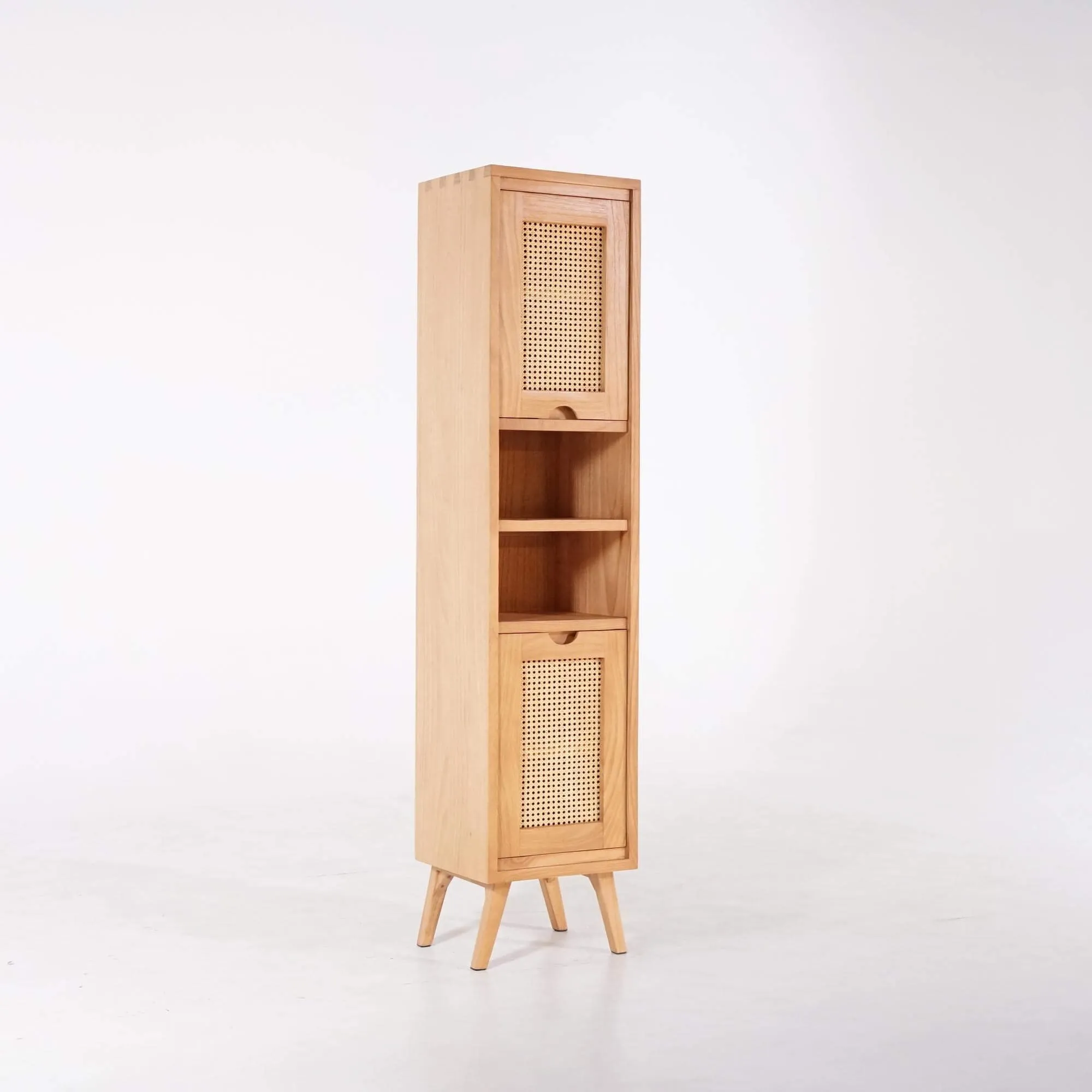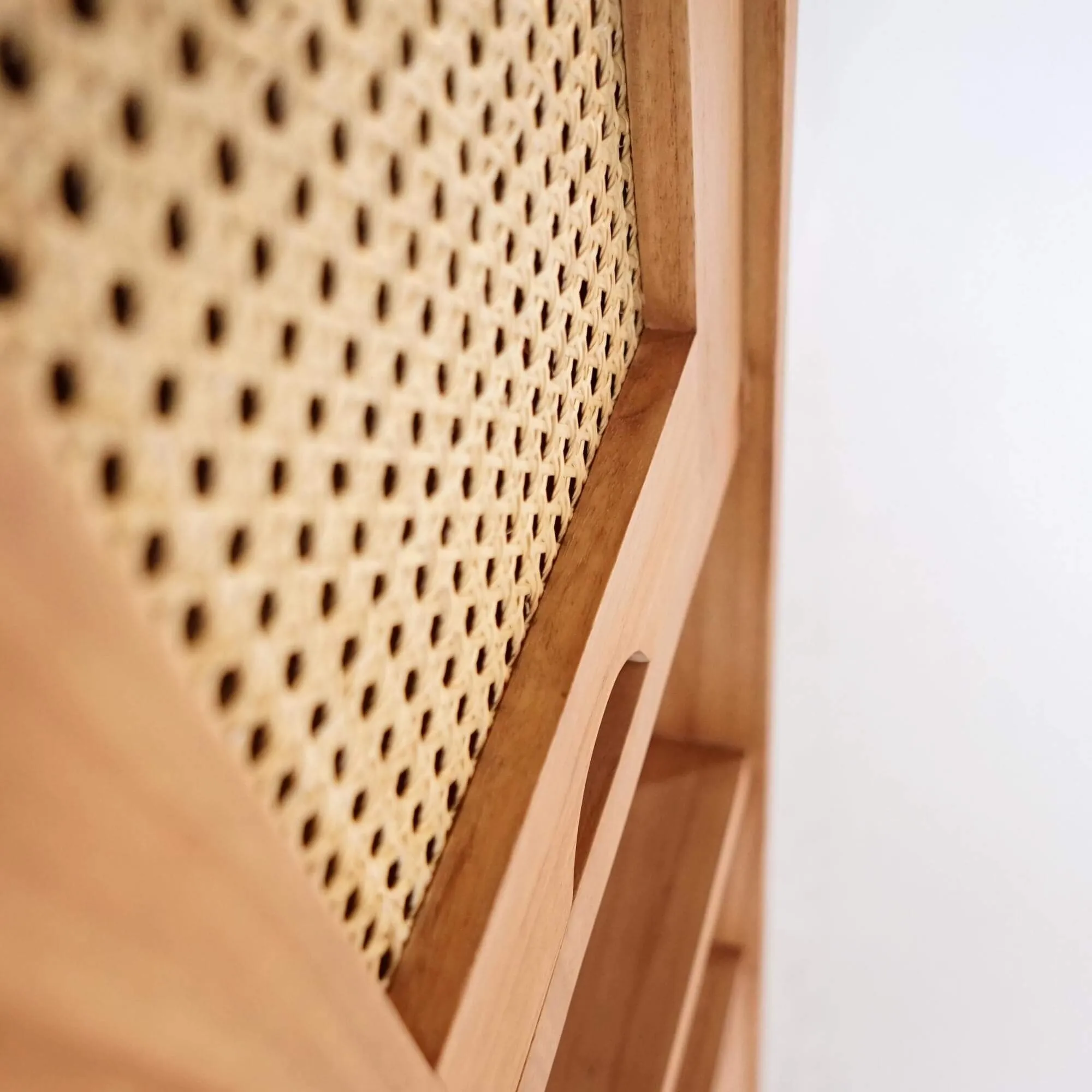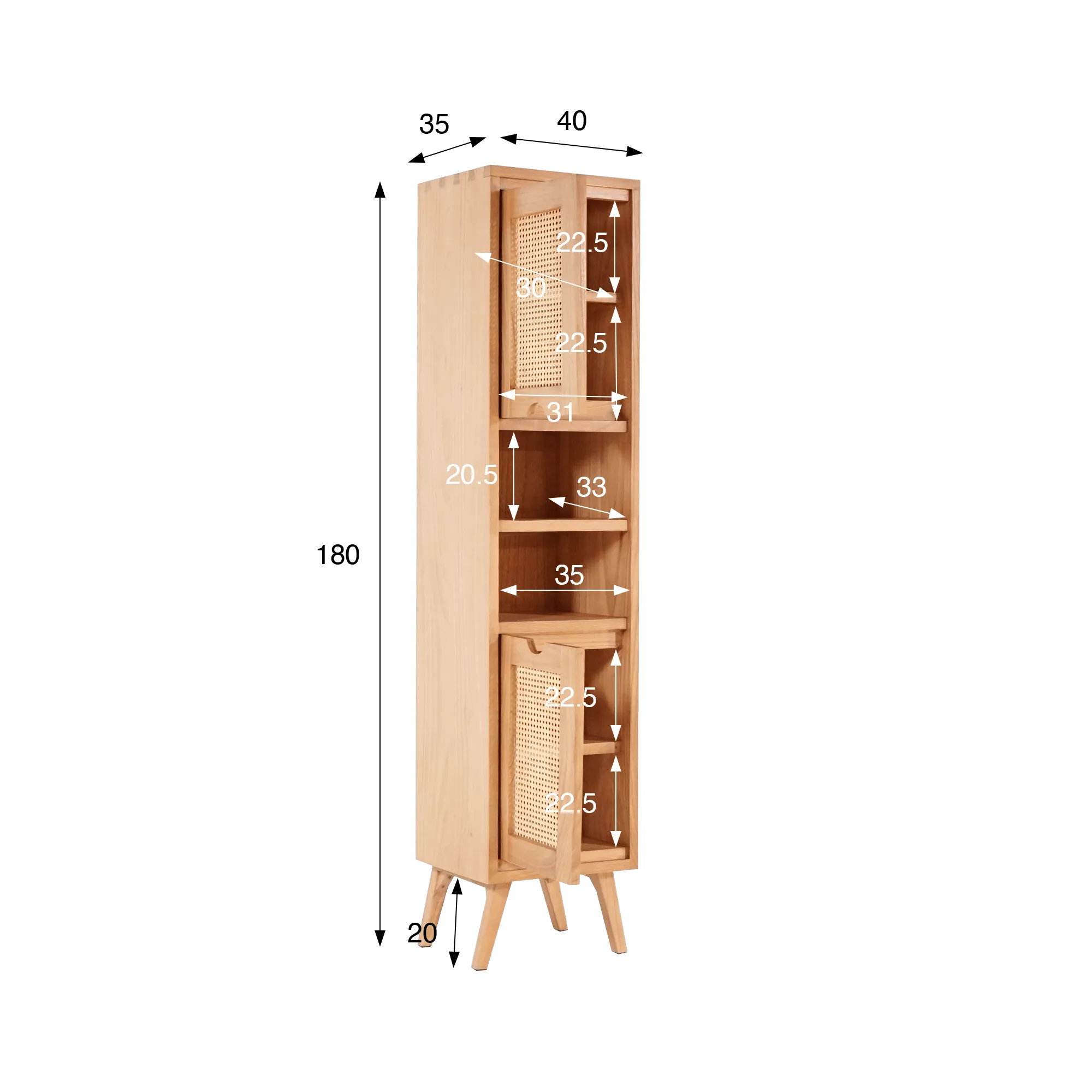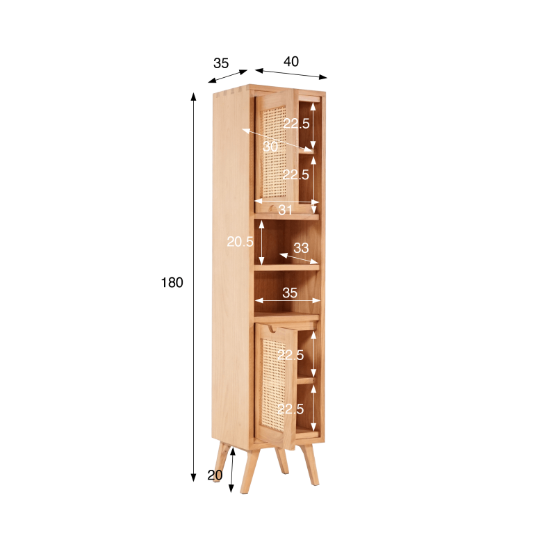 De binnenkant van deze houten badkamerkolom bestaat uit twee open nissen en twee gesloten compartimenten met handgevlochten webbingdeuren. De legplanken, met een diepte van 35 cm en een hoogte van 22,5 cm, bieden een flexibele opbergruimte voor handdoeken, verzorgingsproducten of badaccessoires. De subtiele, in het hout uitgefreesde handgrepen dragen bij aan de zuiverheid van het ontwerp, terwijl de licht schuine poten – eenvoudig te monteren – de structuur slanker maken en voor perfecte stabiliteit zorgen.