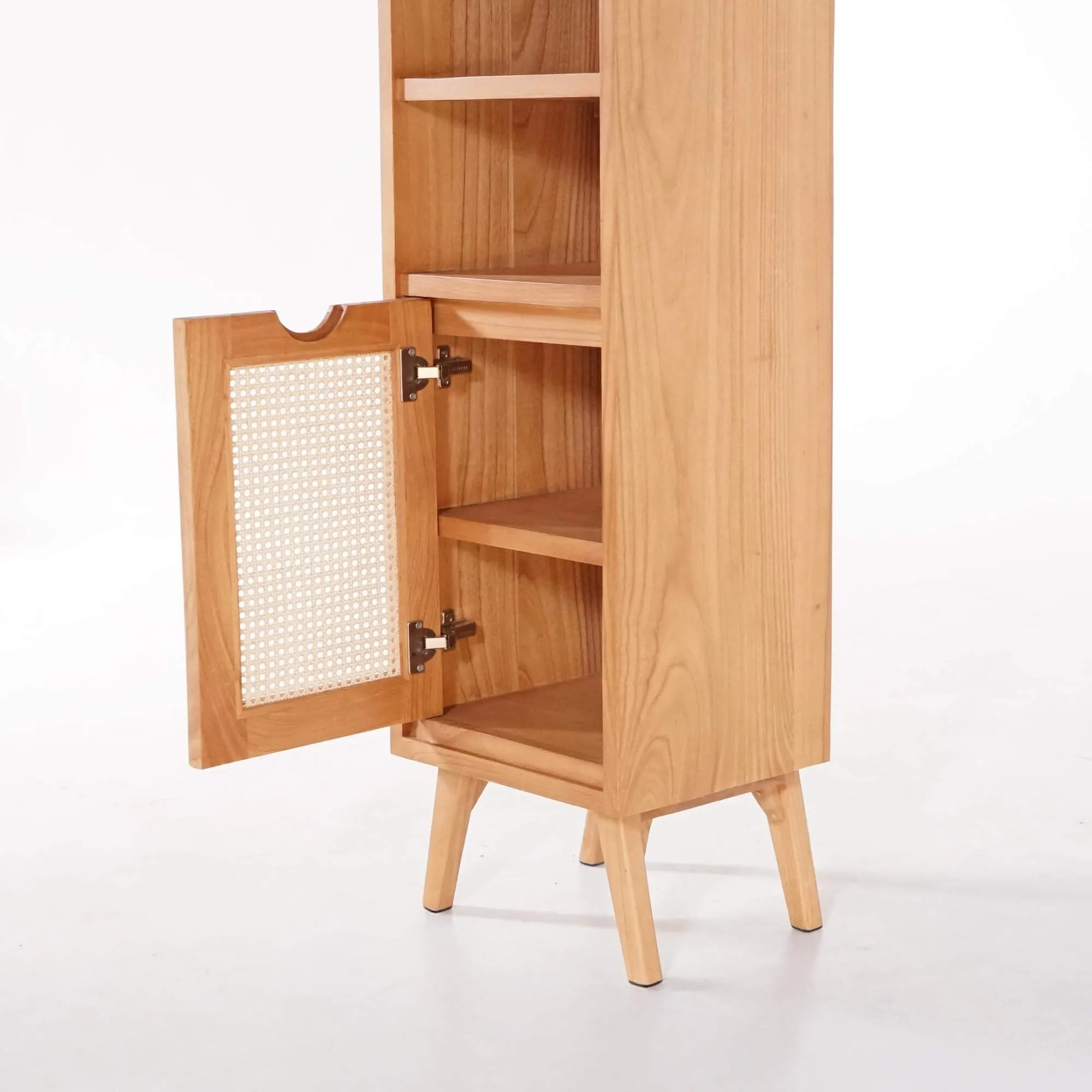 De houten badkamerkolom Anaya belichaamt het perfecte evenwicht tussen natuurlijkheid, zachtheid en functionaliteit. Ontworpen in een Scandinavische stijl met een vleugje romantiek, combineert ze de warmte van mindihout met de verfijning van natuurlijk webbing voor een lichte en rustgevende uitstraling. Met haar slanke silhouet van 180 cm past ze luchtig in de badkamer en biedt ze tegelijk een ideale opbergruimte voor dagelijks gebruik.
