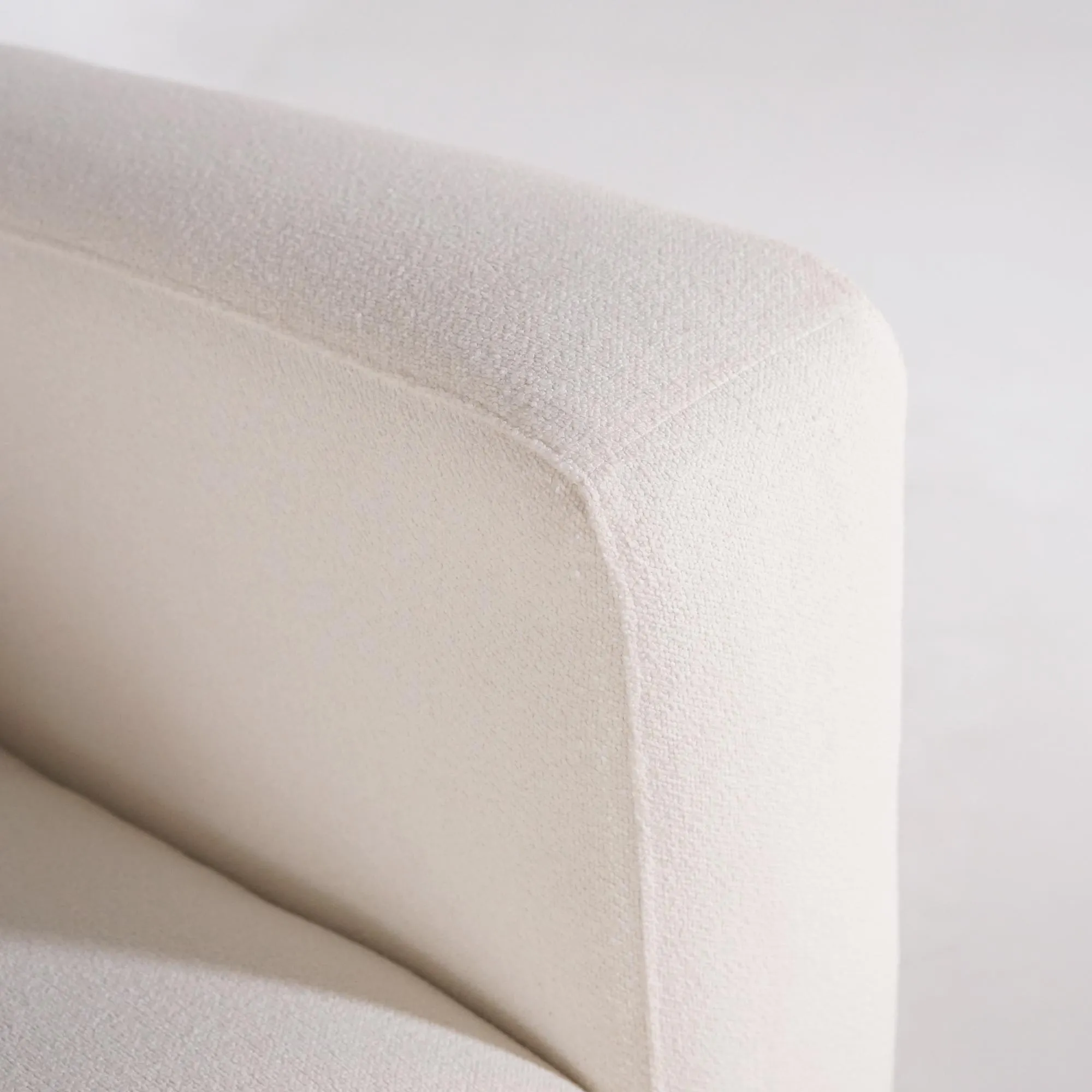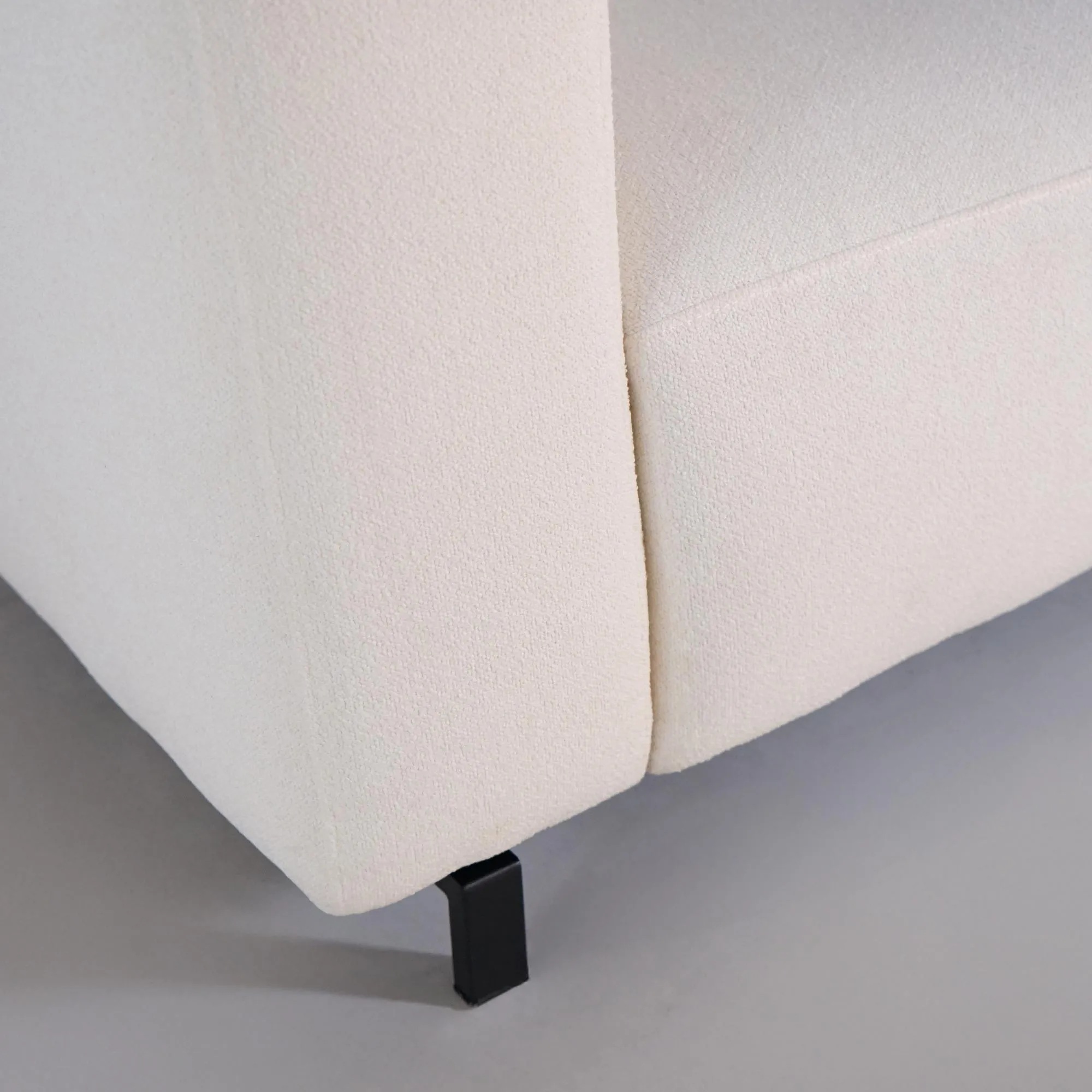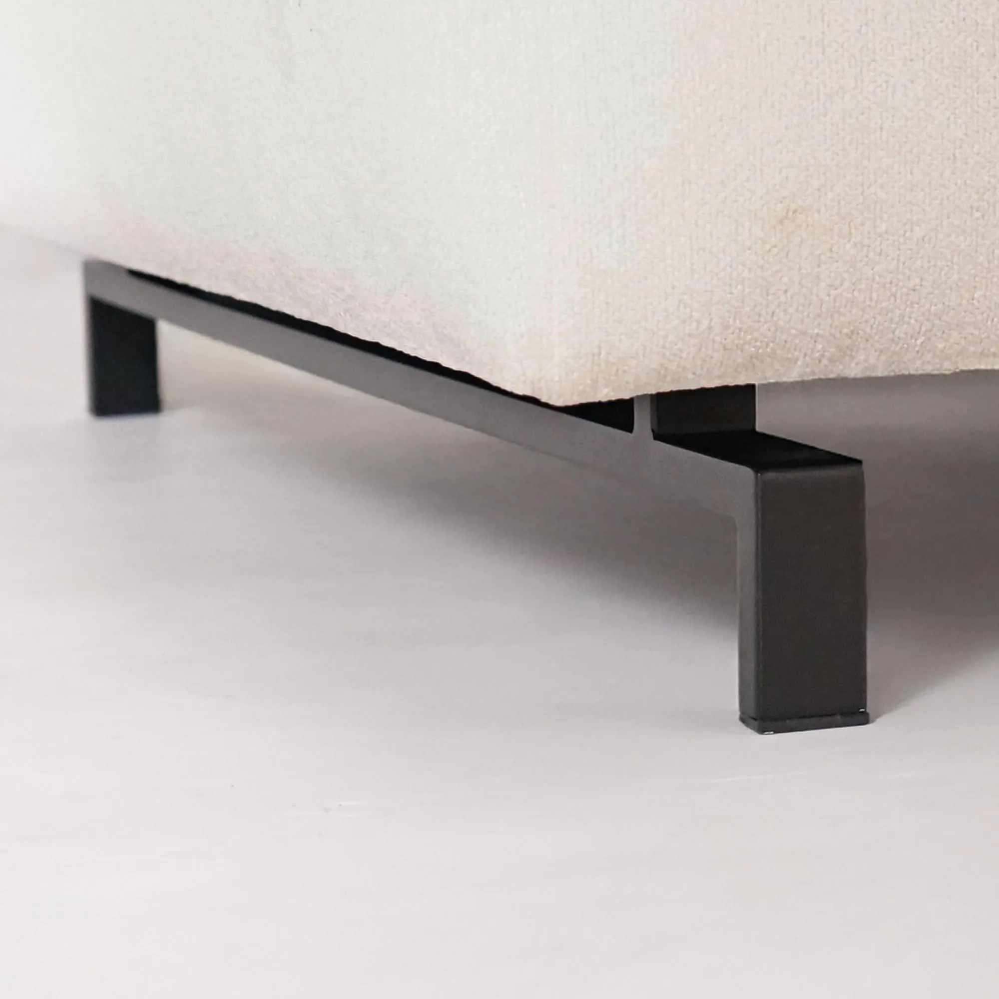 De fijne, geometrische poten in zwart metaal tillen de structuur op en geven het geheel een luchtige en moderne uitstraling. Hun discrete ontwerp benadrukt de zuiverheid van de vorm en accentueert het contrast met de lichte bekleding.