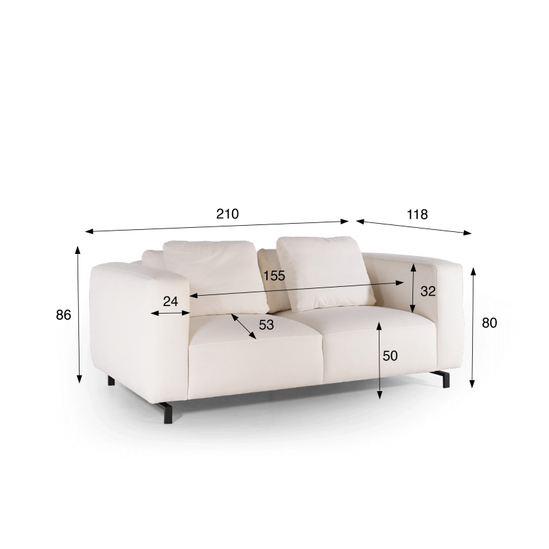 De moderne 3-zitssofa Miro is opgebouwd uit een stevige structuur van grenenhout, beukenhout en multiplex, wat zorgt voor een solide en duurzame basis. De ambachtelijke bekleding combineert een schuim met hoge veerkracht en gekruiste elastische riemen voor een optimaal zitcomfort. De losse, zachte rugkussens versterken het gevoel van zachtheid en geborgenheid. Met zijn lengte van 210 cm, diepte van 118 cm en hoogte van 86 cm biedt hij een royale ruimte, perfect in verhouding voor drie personen.