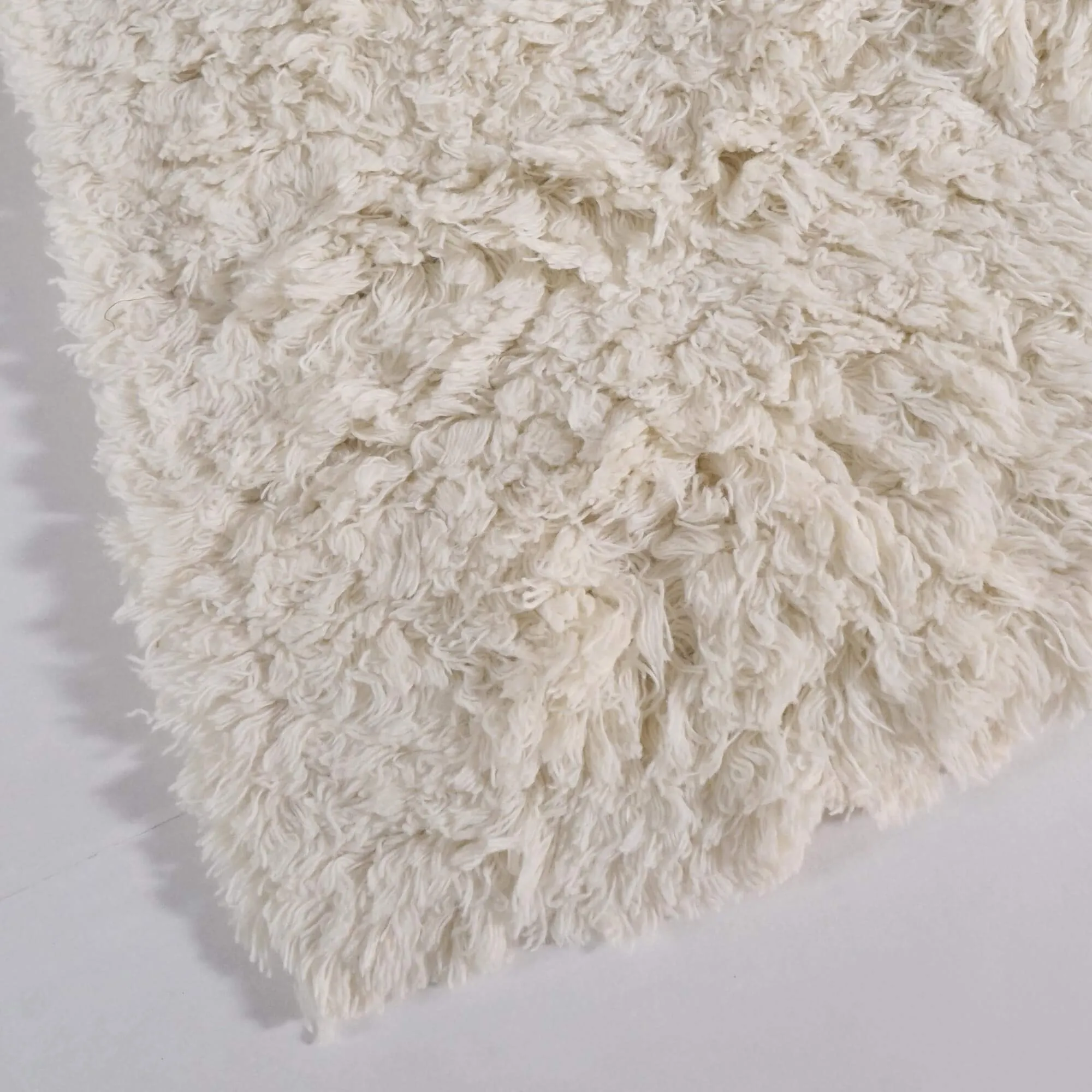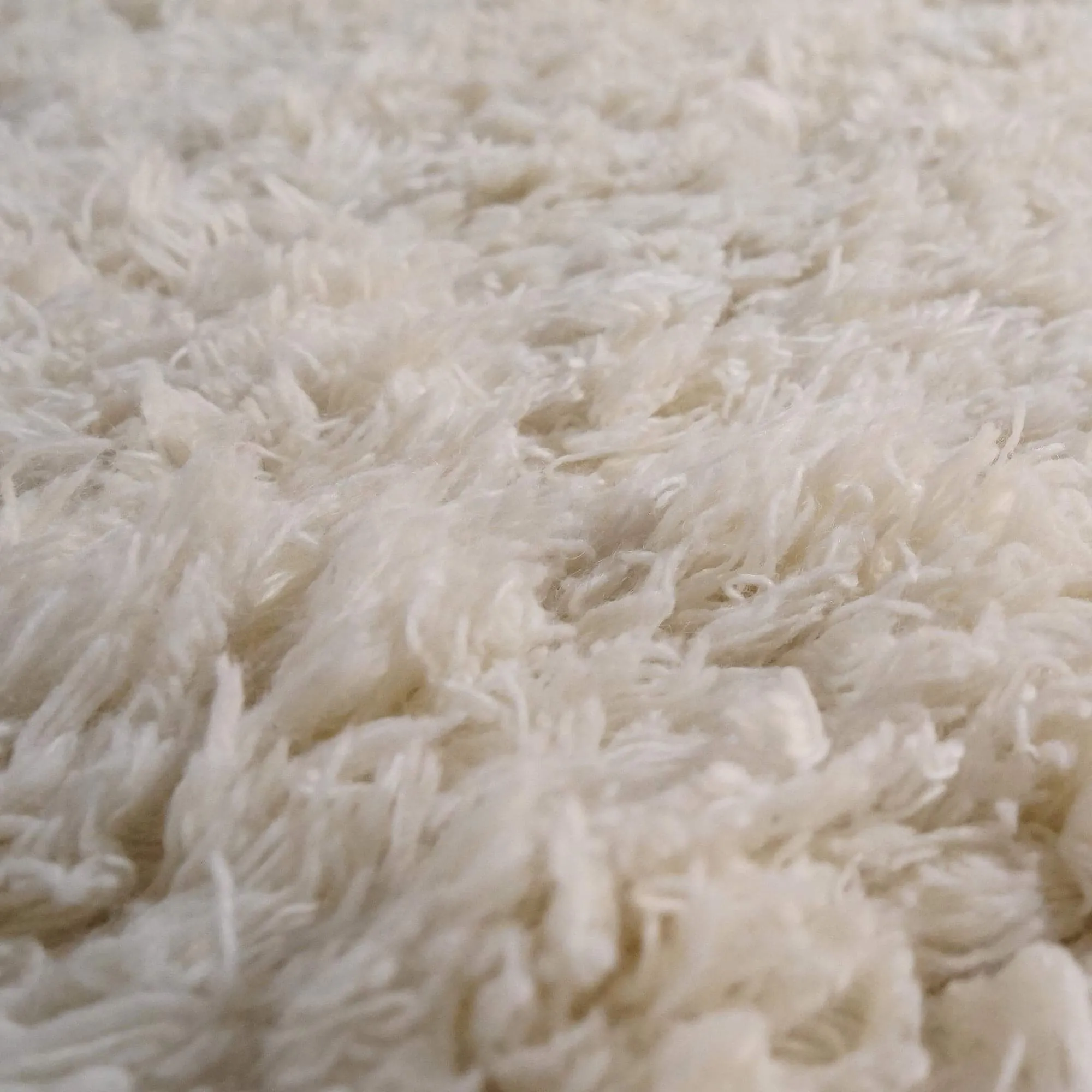Dit wollen tapijt is volledig met de hand vervaardigd en gemaakt van 100% wol, een materiaal dat we bijzonder waarderen om zijn duurzaamheid, soepelheid en ongeëvenaarde zachtheid. Onder de voeten biedt het oppervlak van dit handgemaakte wollen tapijt een warme en comfortabele sensatie, met een dikte van ongeveer 8 mm die dagelijks comfort garandeert zonder de ruimte visueel te verzwaren. De wol vangt het licht op subtiele wijze en onthult delicate nuances van wit die variëren naargelang de inval van het licht, wat extra diepte aan de textuur geeft.