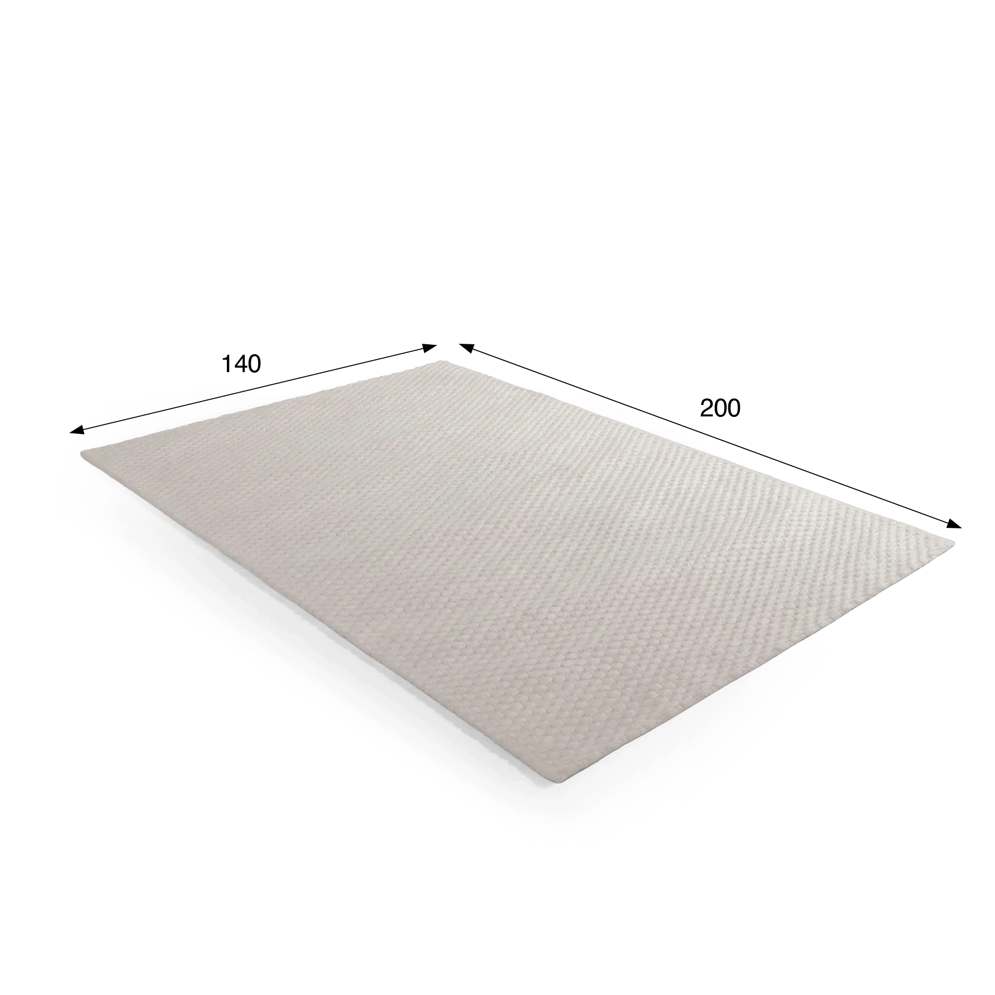 Het formaat van 140 x 200 cm van dit wollen tapijt is ontworpen om een ruimte te structureren zonder ze vast te zetten. In een woonkamer creëert het een gezellige zone rond de bank; in een slaapkamer verzacht het het gevoel van de vloer bij het ontwaken; in een bureau of leeshoek brengt het warmte en nodigt het uit tot ontspanning. Het regelmatige, licht reliëfachtige weefsel van dit wollen tapijt vangt het licht anders naargelang het moment van de dag en onthult zo de volledige rijkdom van de natuurlijke wol.