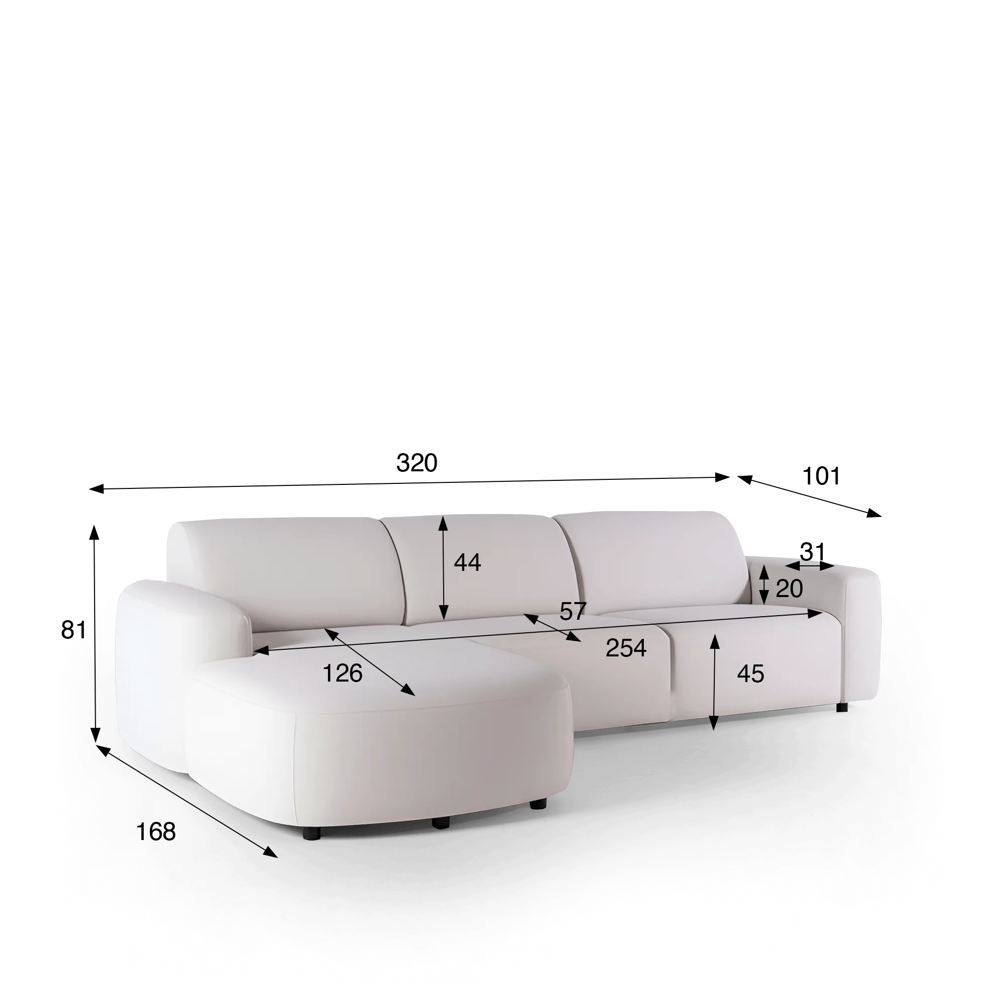 Met zijn harmonieuze proporties — 320 cm breed, 168 cm diep en 81 cm hoog — past deze hoeksofa met linkerliggedeelte voor 4 personen natuurlijk in elke woonkamer, terwijl hij toch een luchtige elegantie behoudt. De linker méridienne biedt een zitruimte van 126 cm, ideaal om comfortabel te loungen of gezellige momenten te delen.