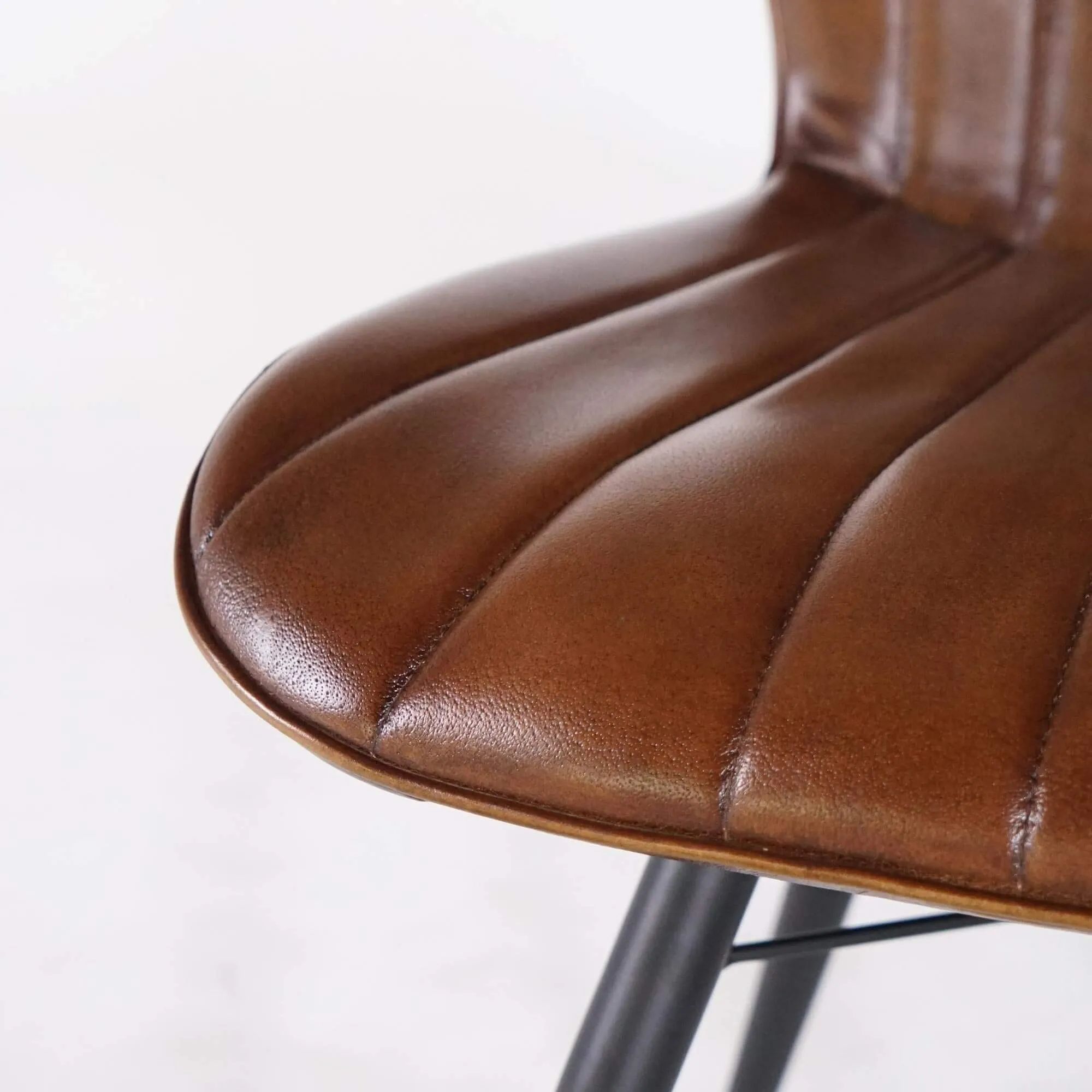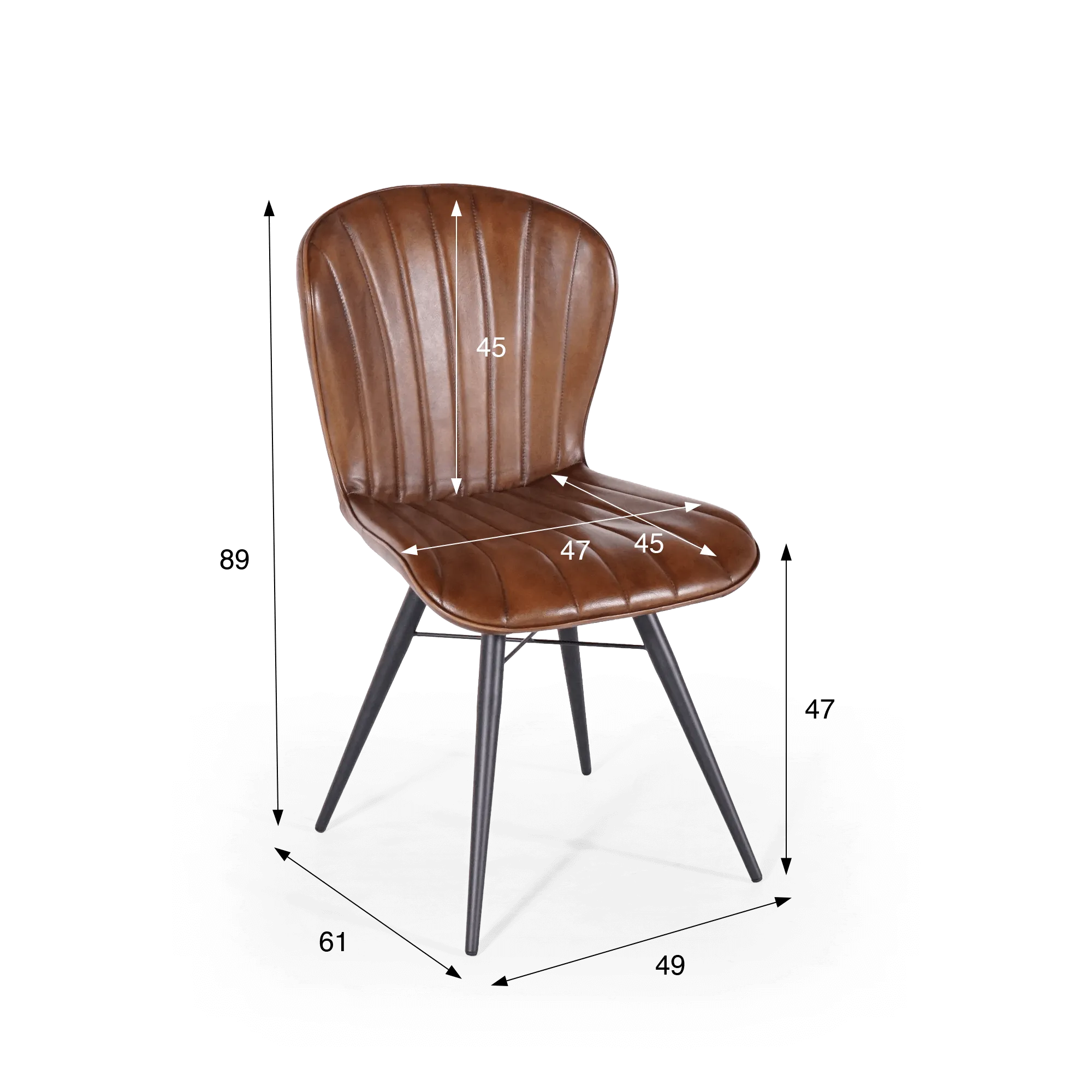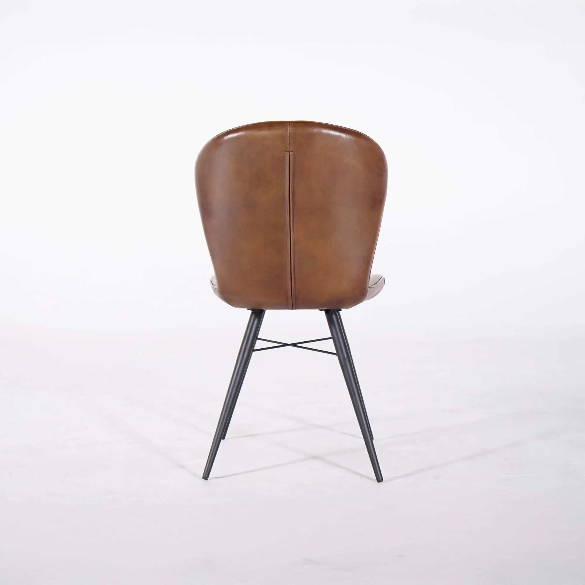 We kozen voor een onderstel in zwart metaal om een evenwichtig contrast te creëren met de warmte van het leer. De licht schuin geplaatste poten versterken de stabiliteit en geven tegelijk een visueel luchtige lijn. De totale diepte van ongeveer 61 cm draagt bij aan het evenwicht tussen comfort en een beheerst ruimtebeslag, waardoor de stoel ook in compactere ruimtes vlot te integreren is.