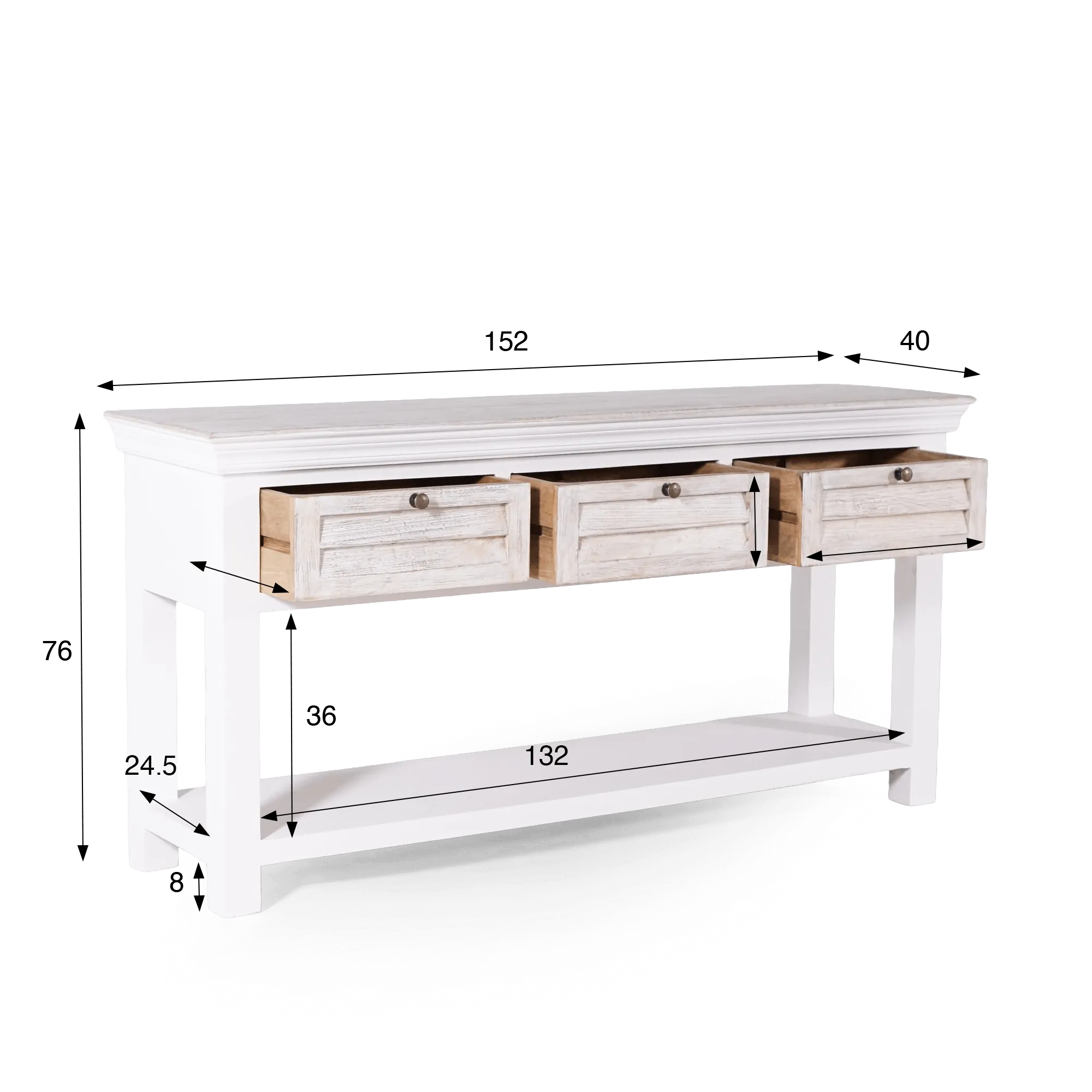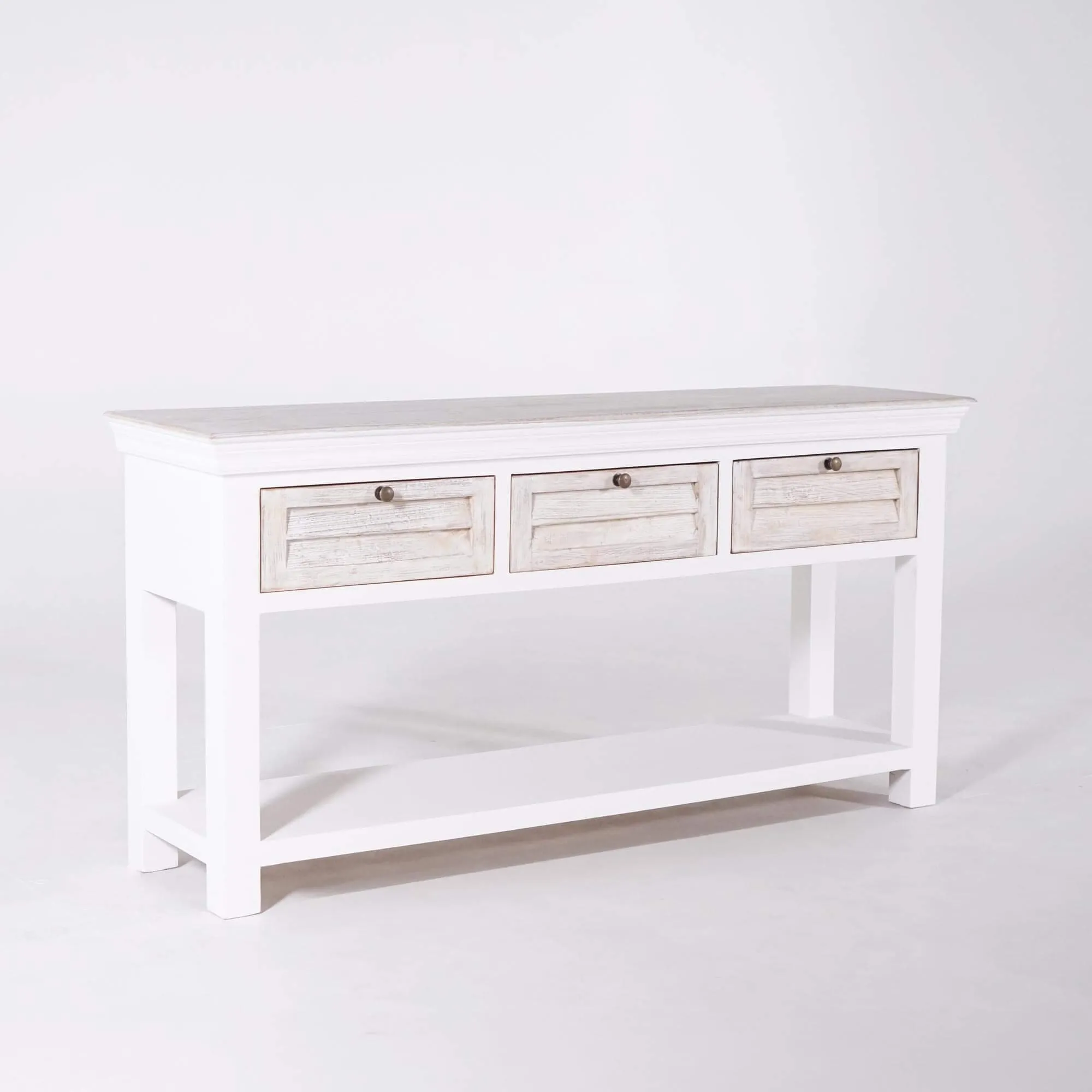Ontworpen als een functioneel meubel, biedt onze Sea Side halconsole in hout moeiteloos plaats aan je dagelijkse essentials dankzij de drie uitgelijnde lades. Ze zijn diep genoeg voor sleutels, post of klein materiaal — een discreet maar fijn detail om je inkom netjes te houden. Onder het blad loopt een lange legplank over de volledige lengte, ideaal voor manden, kussens of decoratieve objecten; met haar breedte van 132 cm laat ze veel ruimte om in te richten zonder de doorgang te hinderen. Met een totale hoogte van 76 cm schuif je deze witgepatineerde halconsole makkelijk achter een zetel of in een smalle gang, waar je net een slank, langwerpig meubel zoekt met beperkte diepte (40 cm).