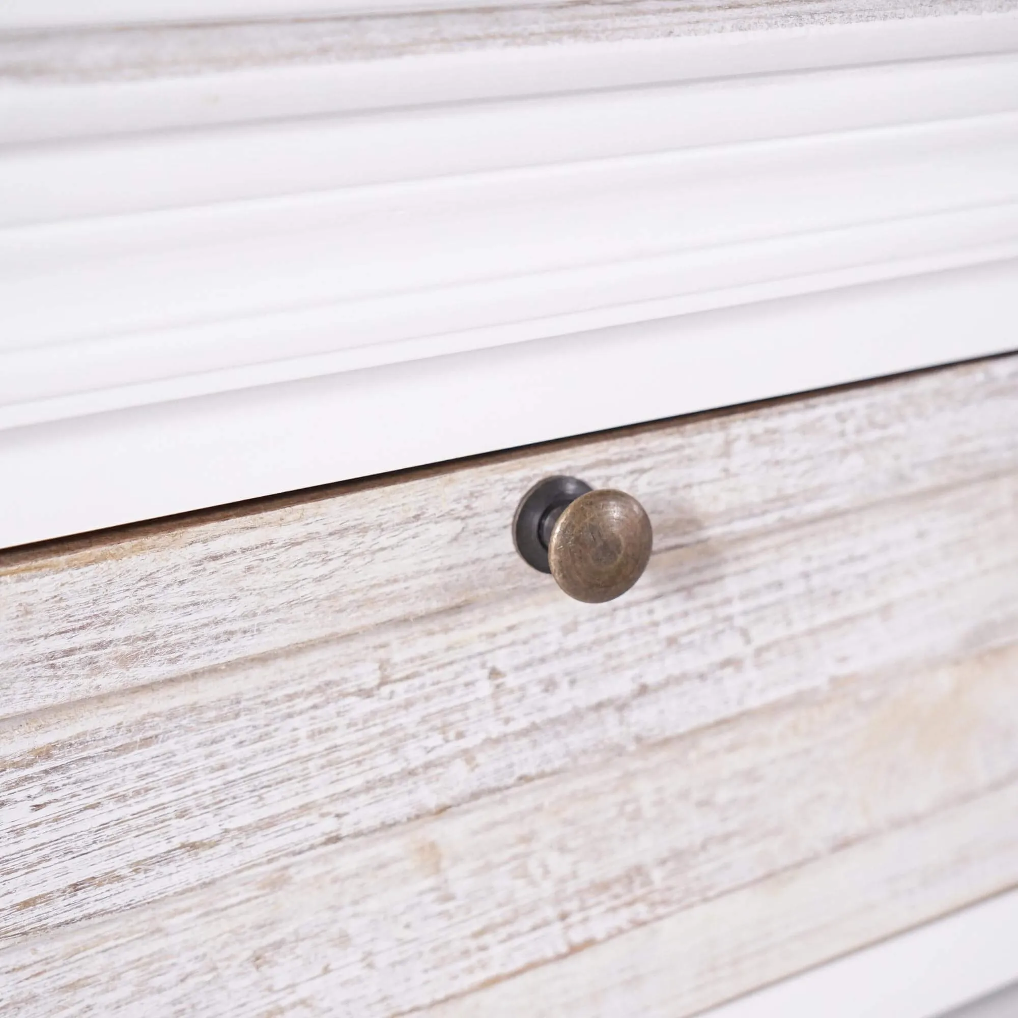 Volledig vervaardigd uit massief mangohout, toont de Sea Side halconsole een mooi spel van nuances tussen het licht gepatineerde wit van de structuur en het blad in zandtinten, subtiel geborsteld zodat de nerven en natuurlijke onregelmatigheden zichtbaar blijven. Die afwerking geeft een bijna poederige diepte die het licht vangt zonder ooit te glanzen. De fronten van de lades van deze halconsole in hout nemen dezelfde lichte patine over, waardoor de reliëfs extra uitkomen en het geheel een zachte uitstraling krijgt.