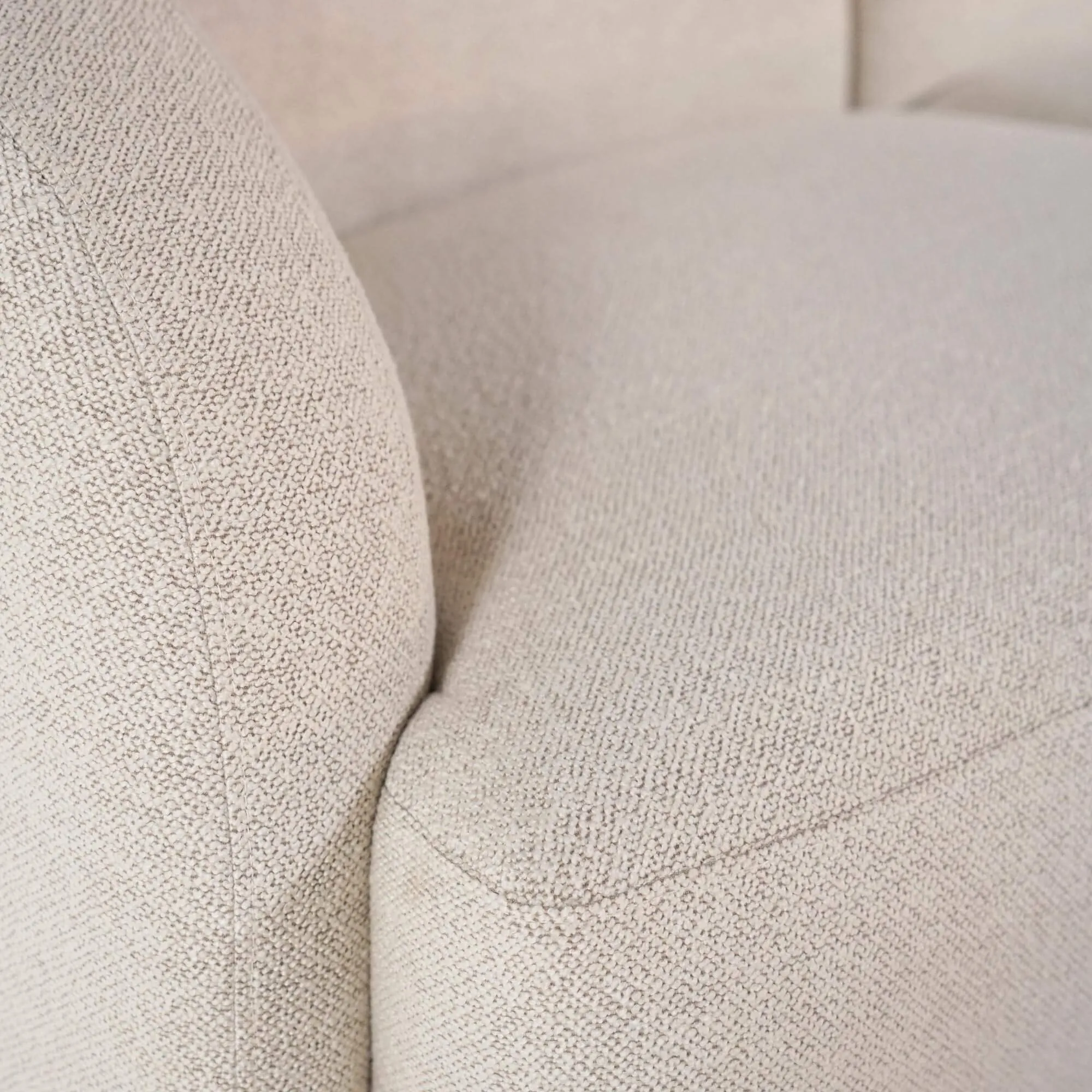 Voor dit model kozen we een getextureerde stof geïnspireerd op bouclé, aangenaam om aan te raken en bestand tegen dagelijks gebruik. Oeko-Tex®-gecertificeerd, garandeert het een duurzaam comfort en een uitstekende kleurvastheid, met een slijtvastheid van meer dan 45.000 Martindale-cycli en een quasi-nul pluizenvorming (pilling 4-5). De zitting van deze design 2-zitsbank combineert een HR-schuim met hoge dichtheid, een systeem van pocketveren en lagen PU-schuim om zowel ondersteuning als soepelheid te bieden. De rugleuning is voorzien van zorgvuldig gekalibreerde schuimlagen die zorgen voor een gelijkmatig comfort, ideaal voor ontspanning en lange, gezellige avonden.