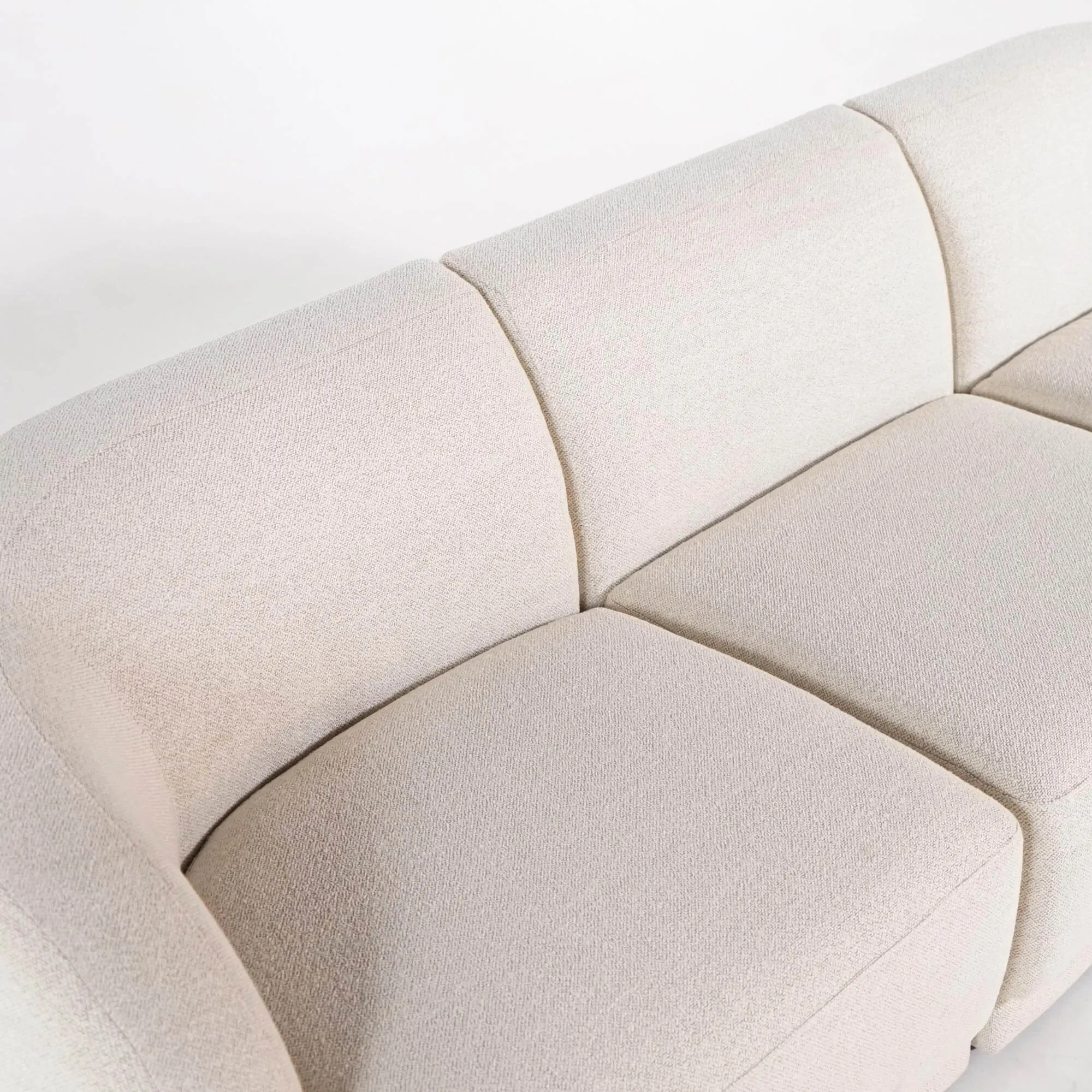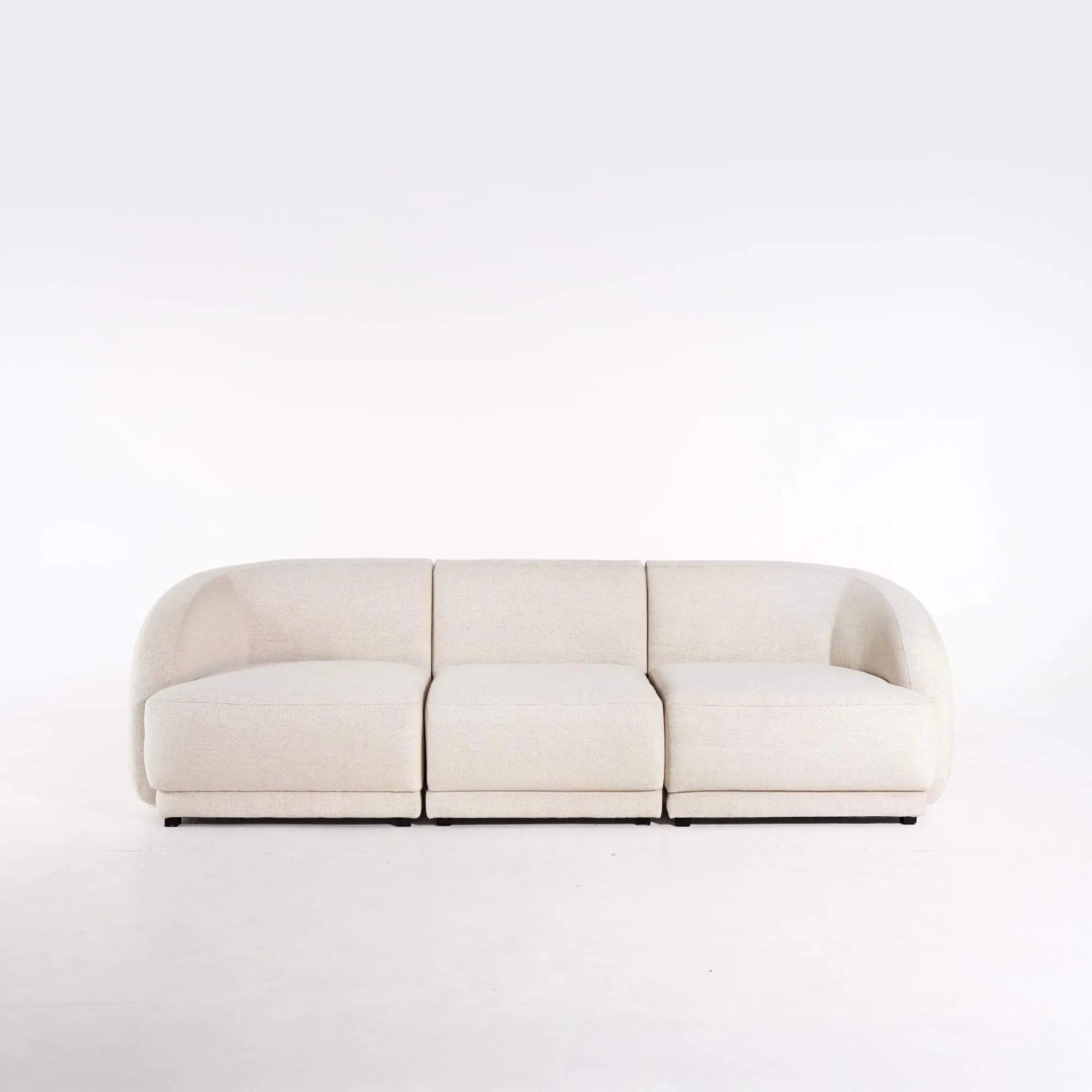 Met onze moderne 3-zitsbank Elora wilden we een meubel creëren dat organische lijnen en modern comfort samenbrengt. Ontworpen in een minimalistische geest belichaamt deze sofa een verfijnde esthetiek waarbij elk detail zorgvuldig is bedacht om een evenwicht te bieden tussen zachtheid en karakter. De afgeronde vorm ontvouwt zich elegant in de ruimte en brengt een uitnodigende en eigentijdse sfeer in uw woonkamer.