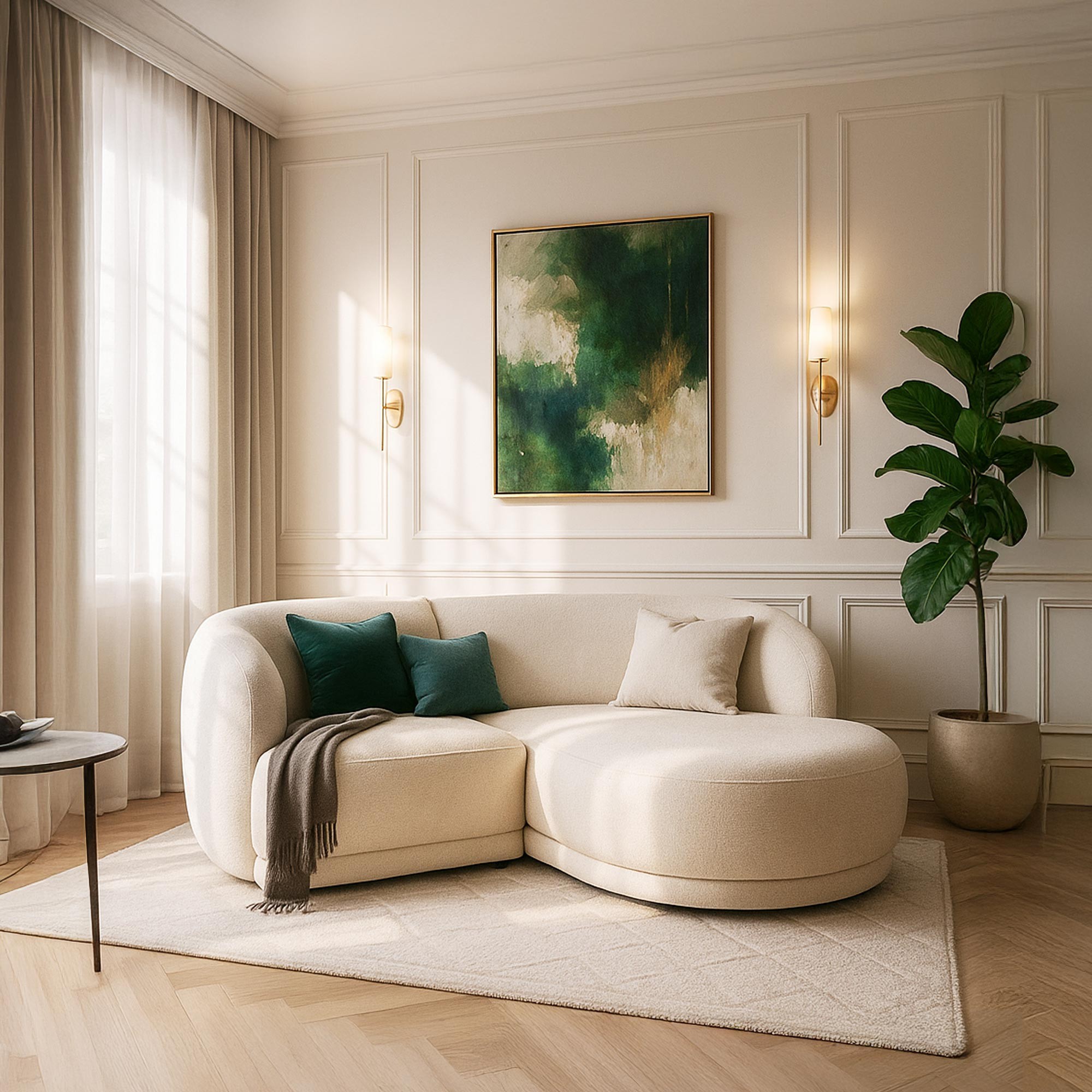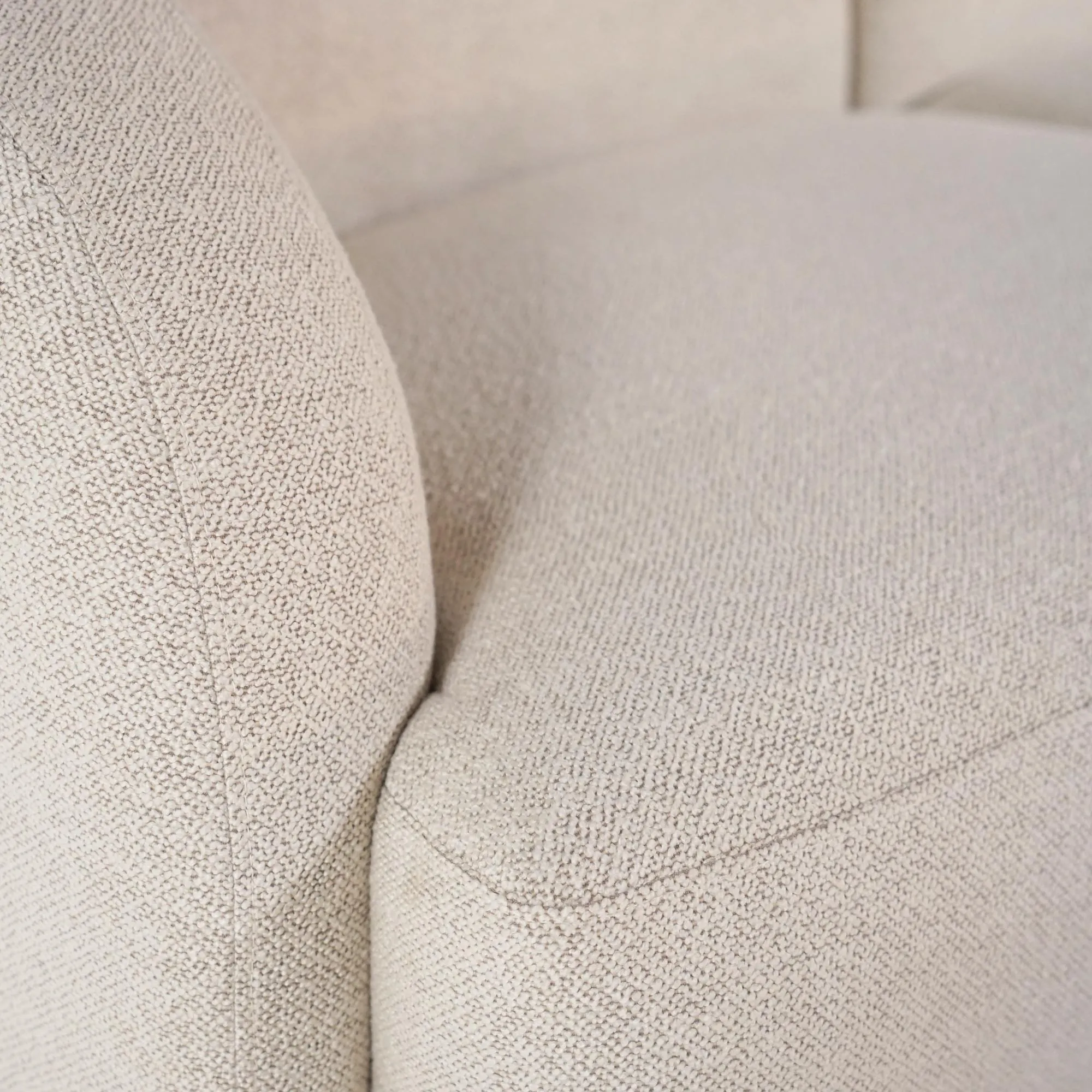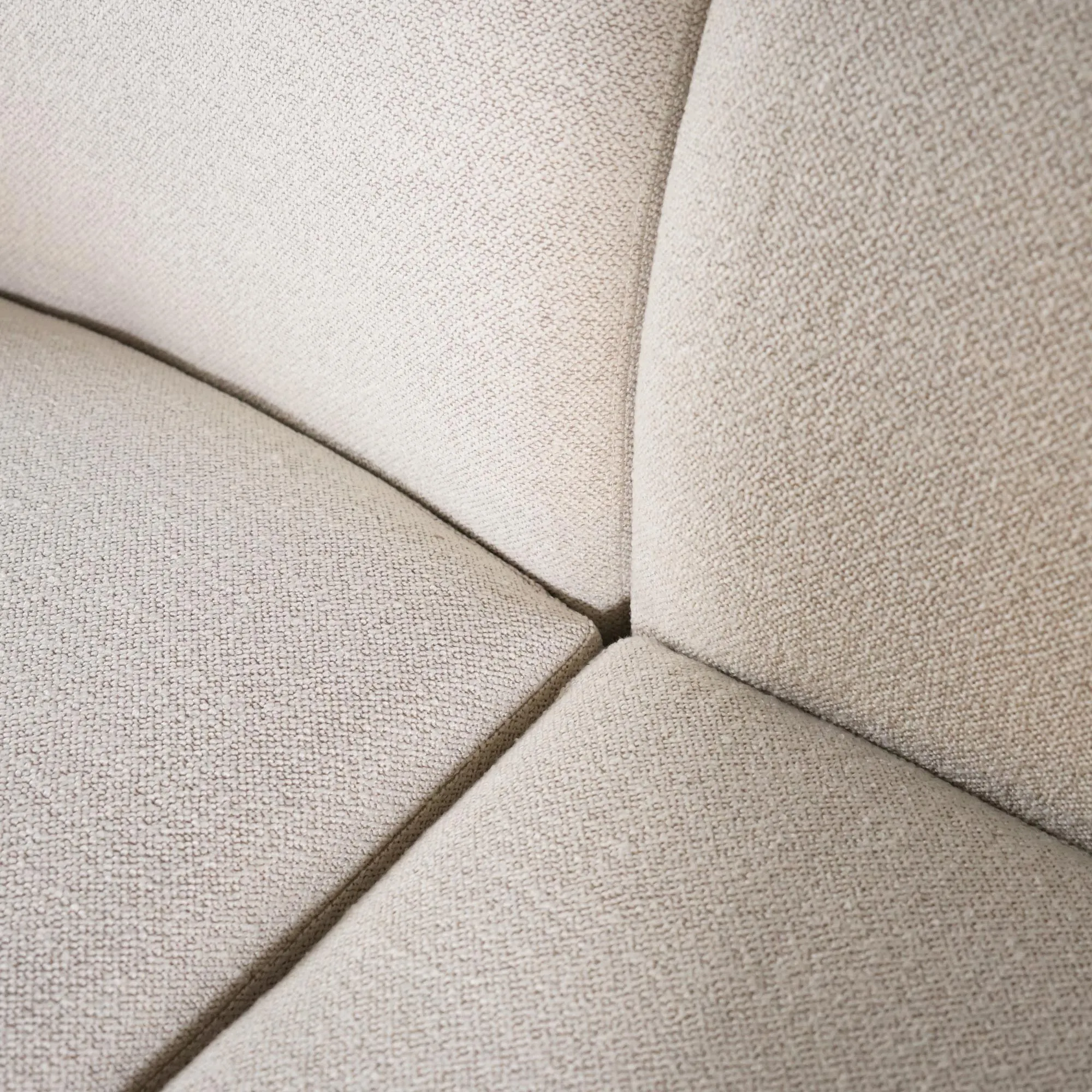 Elk detail van deze hoekzetel met 3 zitplaatsen en rechter longchair is ontworpen om esthetiek en functionaliteit in balans te brengen: van de subtiel gebogen rugleuningen die de lichaamsvorm volgen tot de royale kussens die uitnodigen tot rust. We wilden dat deze zetel zich onderscheidt door zijn ambachtelijke afwerking en zijn vermogen om een interieur te transformeren. Geplaatst in een lichte woonkamer met strakke lijnen, wordt hij het ankerpunt van de ruimte en brengt hij een warme, eigentijdse sfeer.