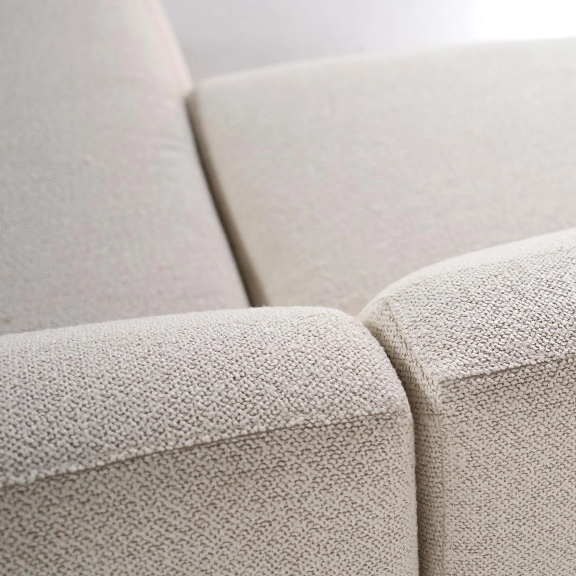 Voor deze hoekzetel met 3 zitplaatsen en rechter longchair kozen we voor een boucléstof met Oeko-Tex®-certificaat, waarvan de getextureerde touch de omhullende vorm van de zit mooi benadrukt. Deze bekleding, met een dichte en stevige weving, combineert comfort in het dagelijks gebruik met duurzaamheid. De interne structuur bestaat uit HR-schuim met hoge veerkracht, pocketveren en meerlagig PU-schuim, wat zorgt voor een zitervaring die zowel soepel als ergonomisch is, en jarenlang hetzelfde comfort biedt. De discrete plastic poten, bijna onzichtbaar, versterken de visuele lichtheid en laten de zetel gemakkelijk in verschillende interieurs opgaan.