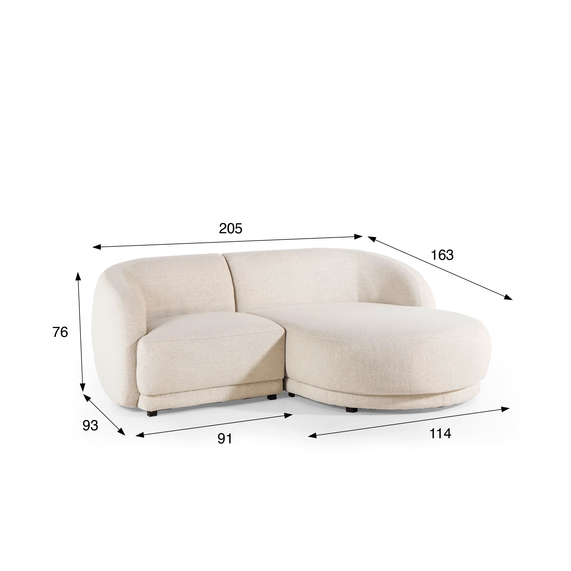 Ontworpen door onze designers binnen de Elora-collectie, combineert deze hoekzetel met 3 zitplaatsen en rechter longchair organische lijnen met verfijnd minimalisme. De zachte, afgeronde vorm nodigt vanzelf uit tot ontspanning, terwijl de zorgvuldig gekozen afmetingen van 205 cm breedte, 163 cm diepte en 76 cm hoogte deze zetel ideaal maken om een moderne woonkamer te structureren.