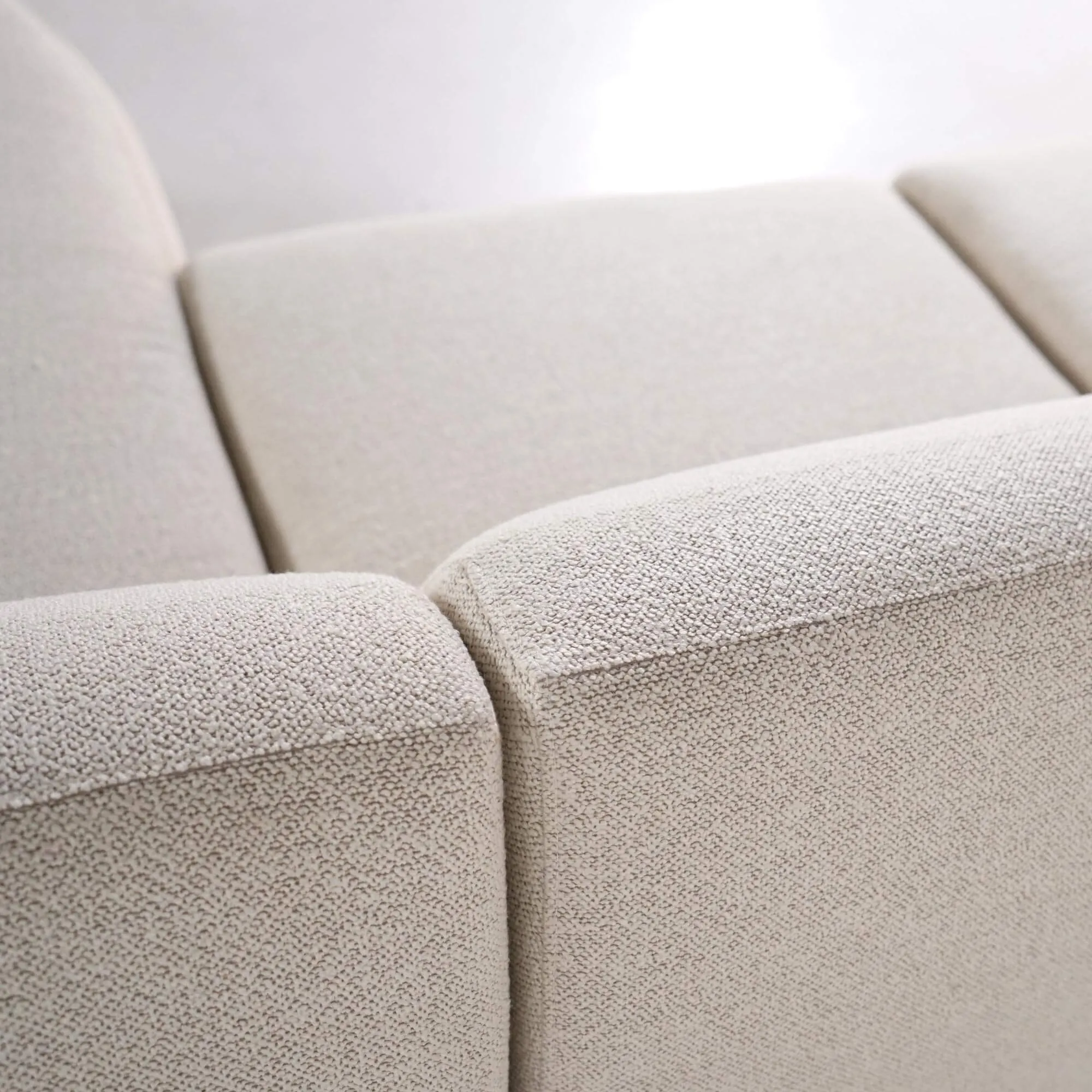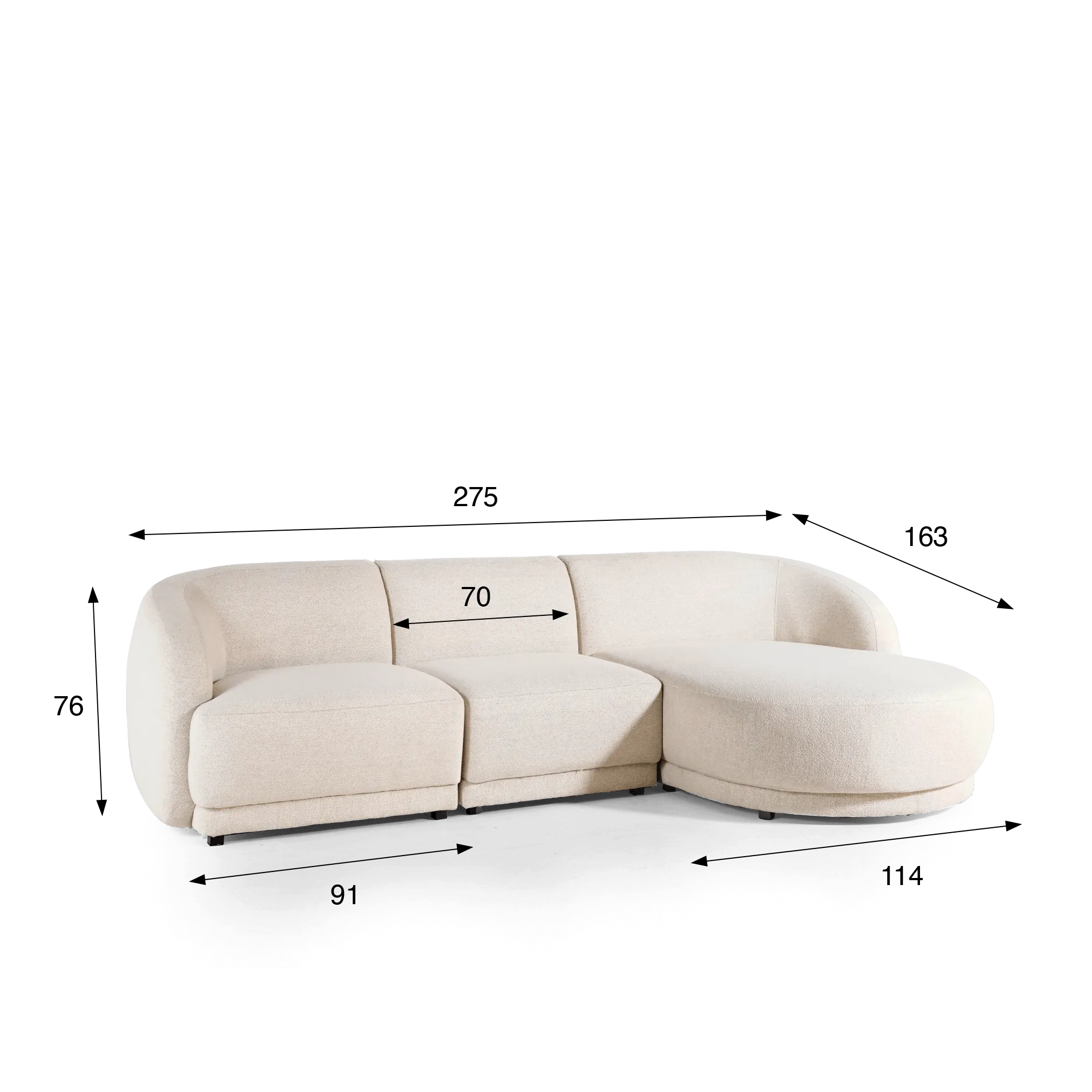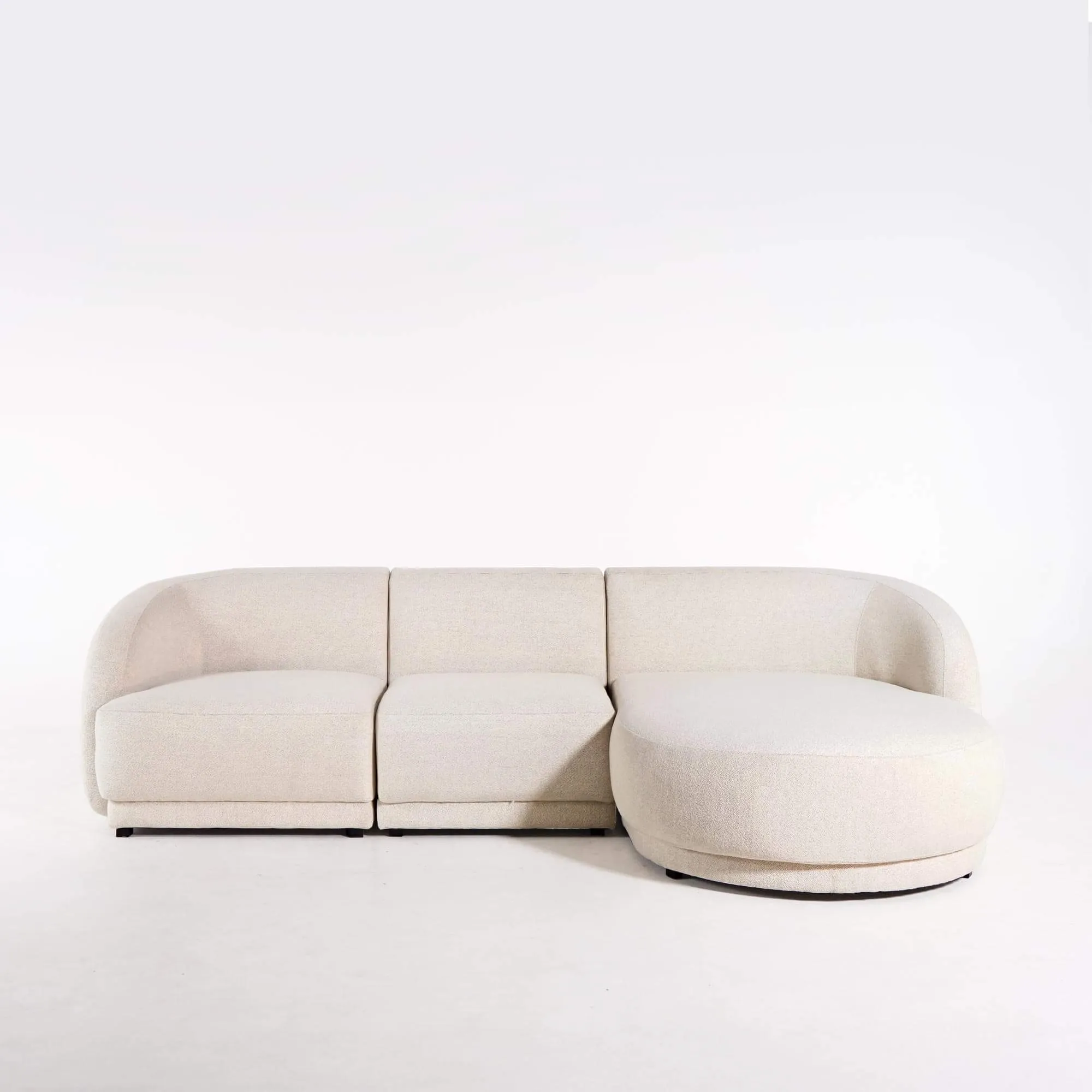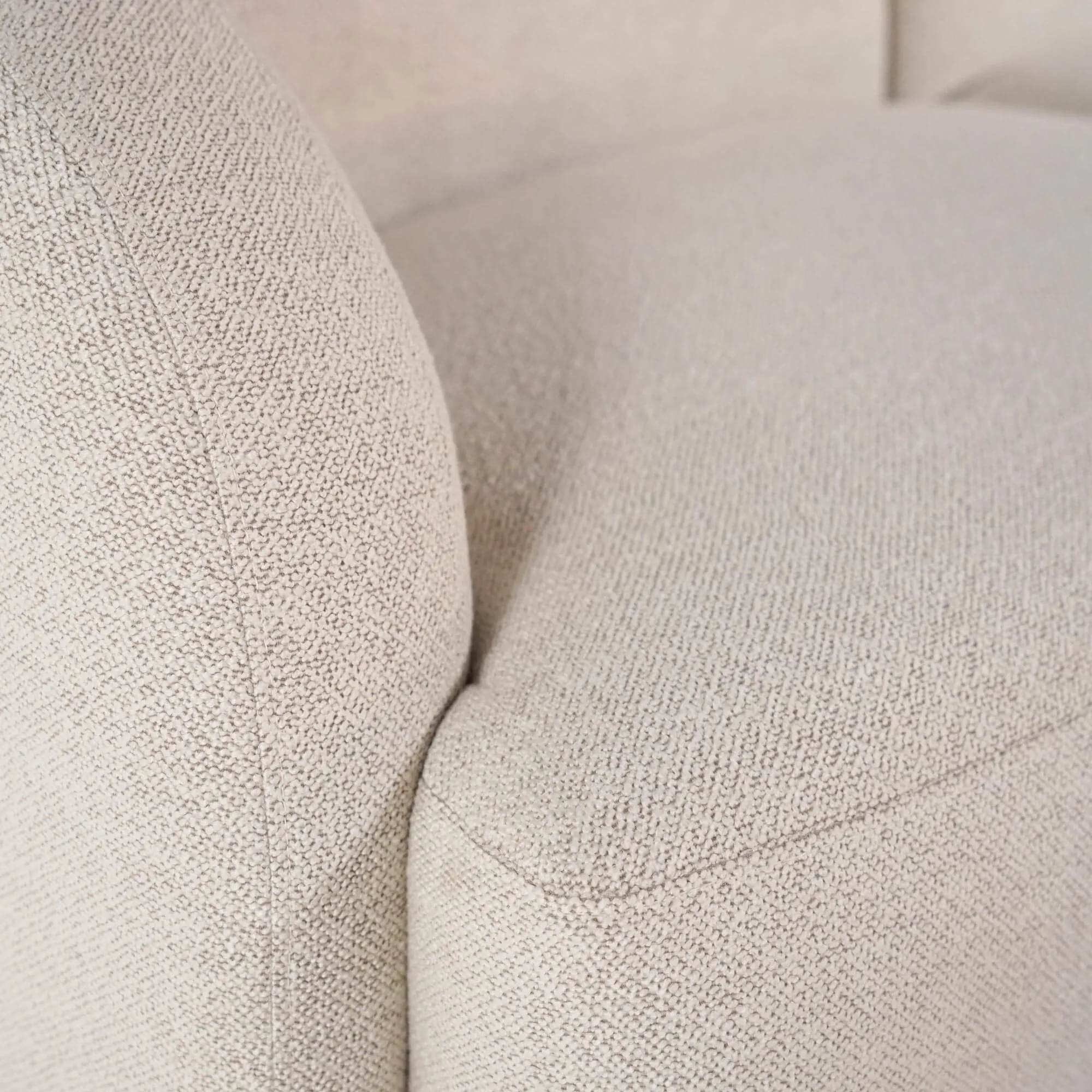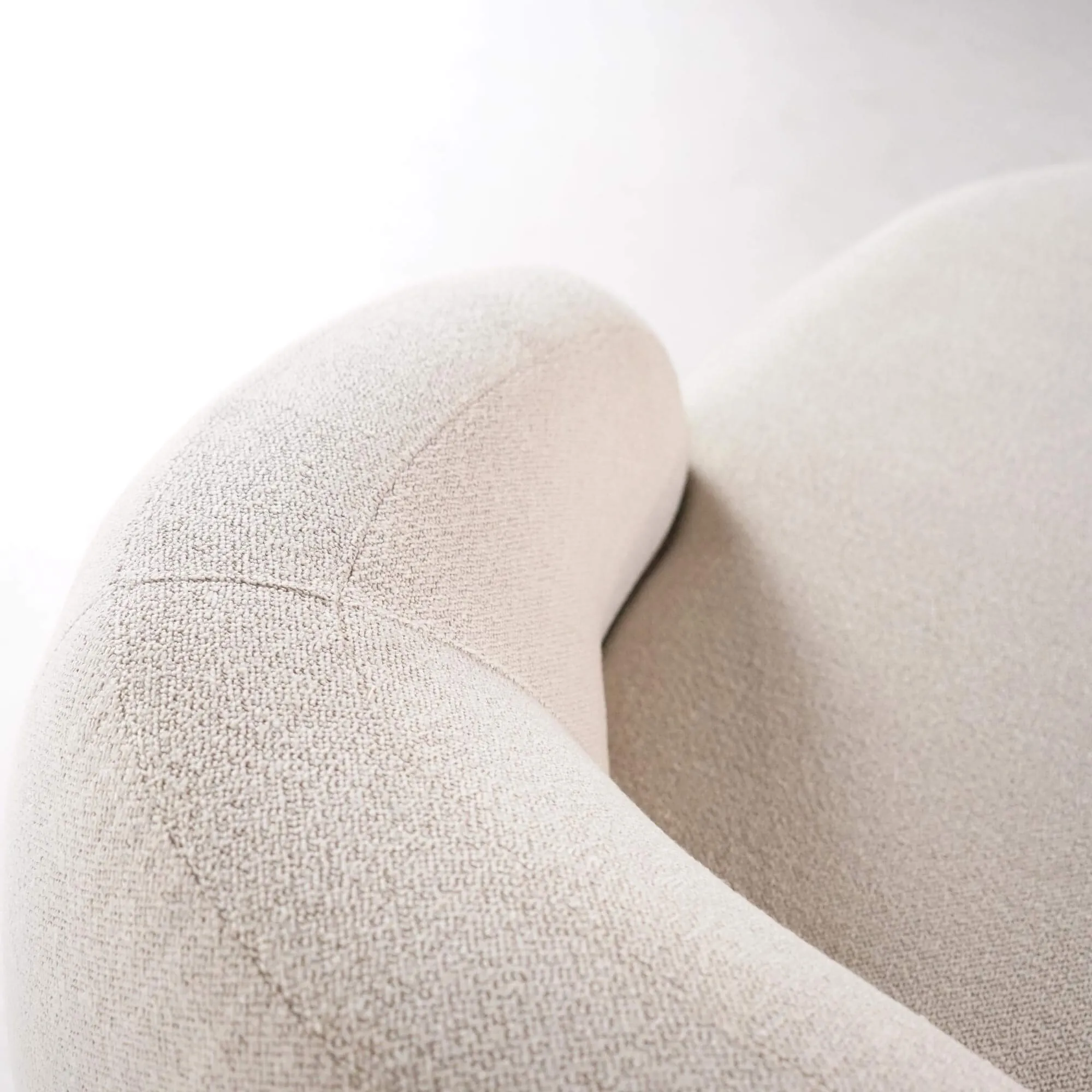 Voor dit model kozen we een bouclé stof met Oeko-Tex®-certificaat, gewaardeerd om zijn getextureerde aanraking en discrete elegantie. Bestand tegen meer dan 45.000 Martindale-cycli, garandeert hij een opmerkelijke duurzaamheid in het dagelijks gebruik. Onder de bekleding komt het comfort tot uiting dankzij een binnenstructuur die pocketveren, HR-schuim en lagen PU-schuim combineert, wat zowel soepelheid als steun verzekert. Het geheel rust op discrete zwarte kunststof poten, die de vloeiende lijnen behouden zonder de visuele harmonie te doorbreken.