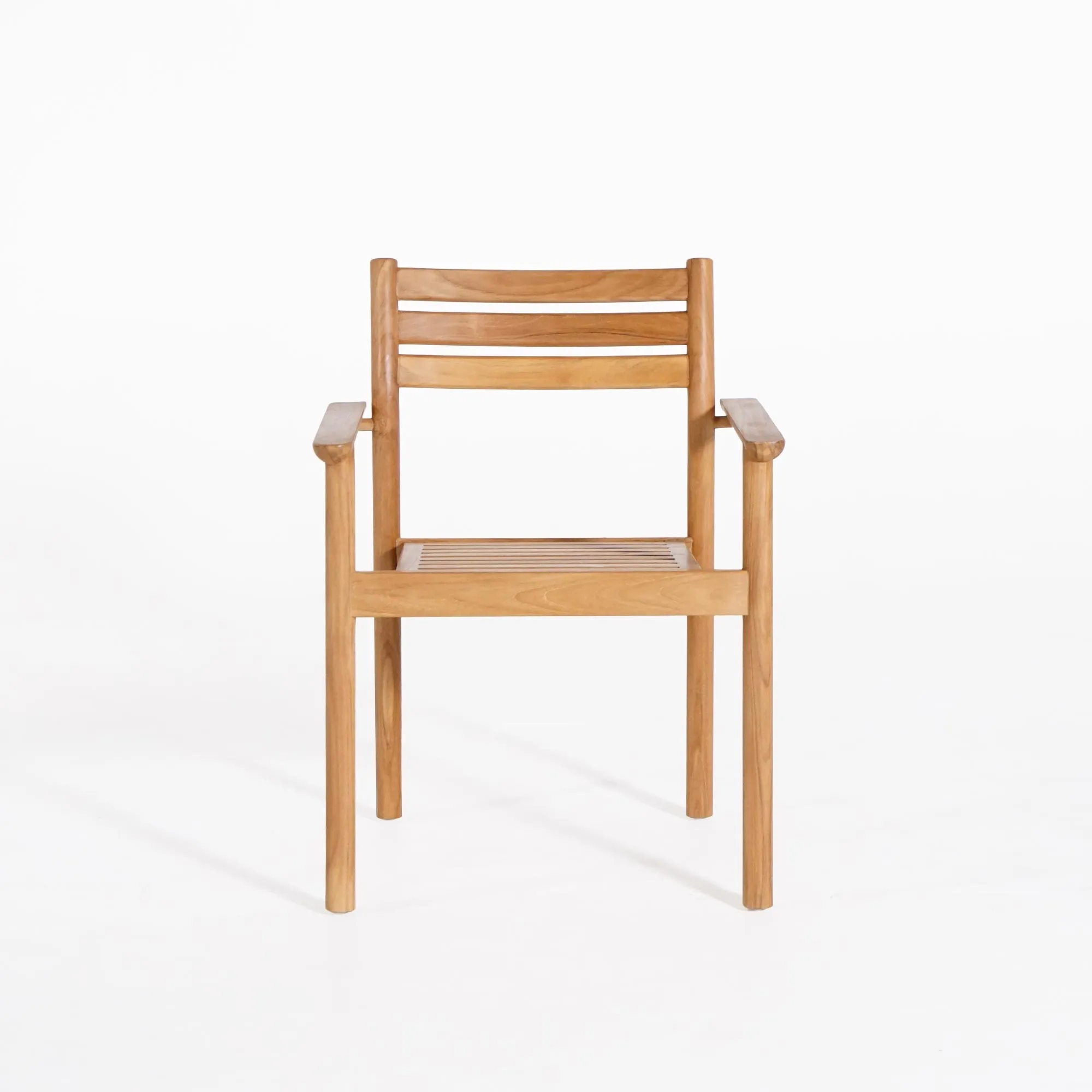 De structuur van de houten teak tuinstoel Sento steunt op licht gebogen stijlen in massief hout, die het geheel tegelijk stabiel én luchtig doen aanvoelen. De armleuningen volgen die natuurlijke lijn en bieden een comfortabele steun tijdens ontspannen momenten. De open zitting, opgebouwd uit fijne teaklatten, zorgt voor een goede luchtcirculatie en tegelijk voor een grote stevigheid. De rugleuning van deze houten teak tuinstoel, gevormd door drie horizontale, zacht gebogen dwarslatten, volgt de rug precies en draagt bij aan het ergonomische evenwicht van het geheel.