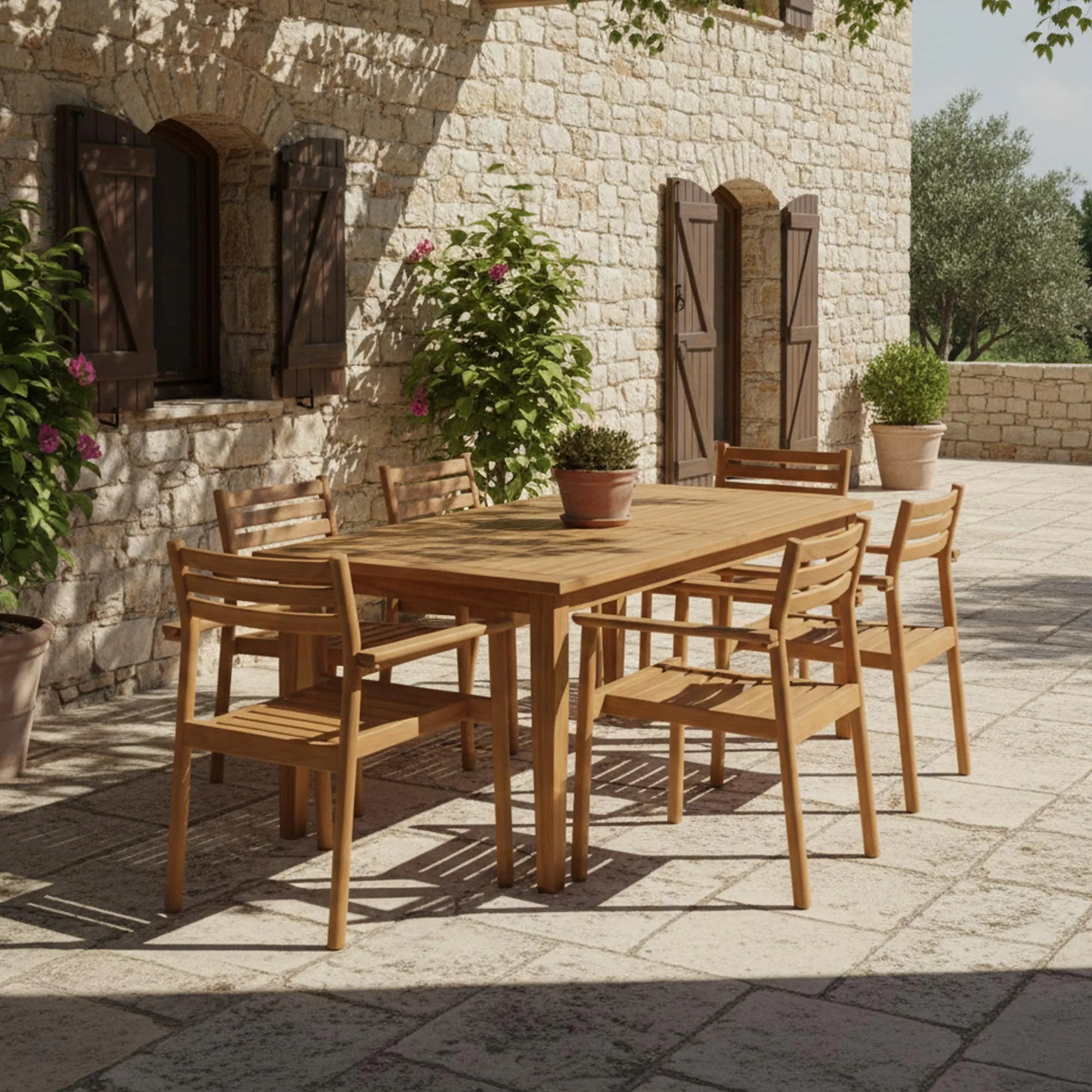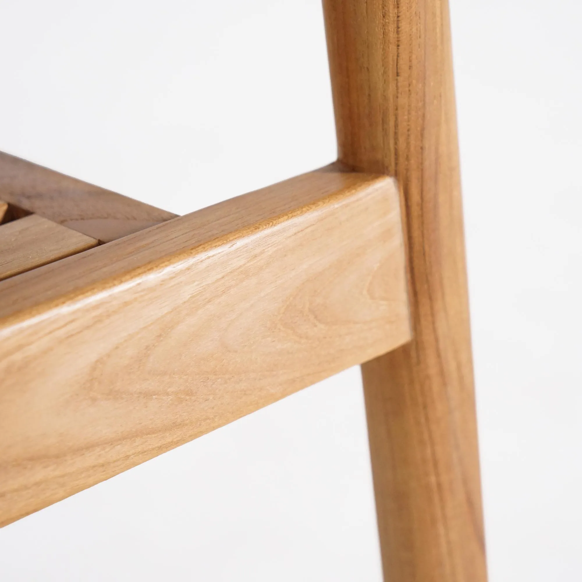 Volledig vervaardigd uit massief teak zet deze houten tuinstoel één van de meest geliefde houtsoorten voor buitenmeubilair in de kijker. We kozen dit hout om zijn uitzonderlijke weerstand tegen weersinvloeden, maar ook om de warme honingkleur die zich doorheen de tijd op elegante wijze ontwikkelt. Het houtoppervlak toont een subtiele, levendige nerf, zorgvuldig bewerkt door onze ambachtslieden voor een afwerking die zacht aanvoelt en visueel harmonieus oogt.