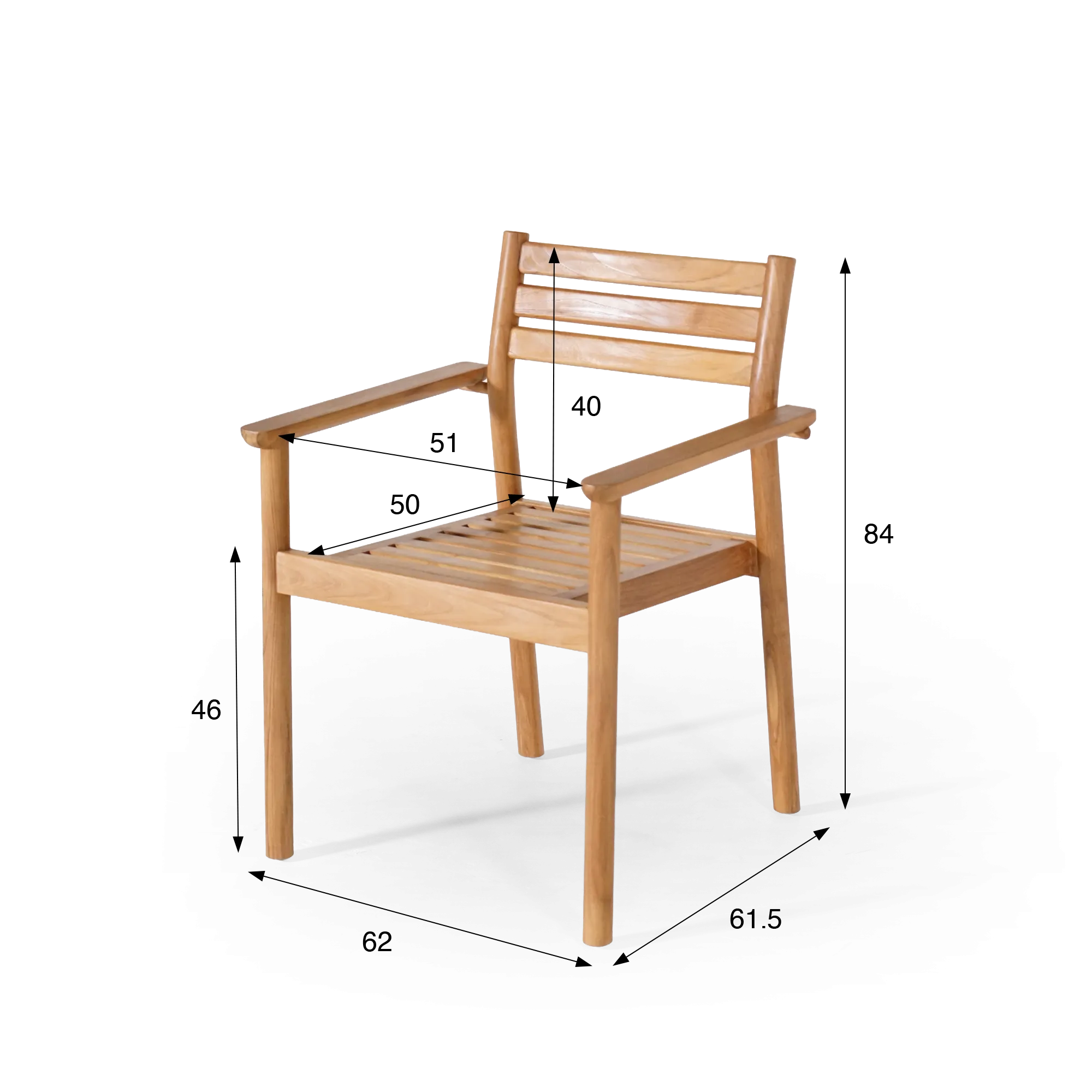 Met een breedte van ongeveer 51 cm tussen de armleuningen en een rugleuninghoogte van ongeveer 40 cm boven de zitting vindt de houten teak tuinstoel Sento moeiteloos haar plek rond een tuintafel of op een zonnig terras. Ze blijft visueel licht, terwijl ze toch merkbaar comfort biedt om langer te tafelen of te ontspannen in de buitenlucht.