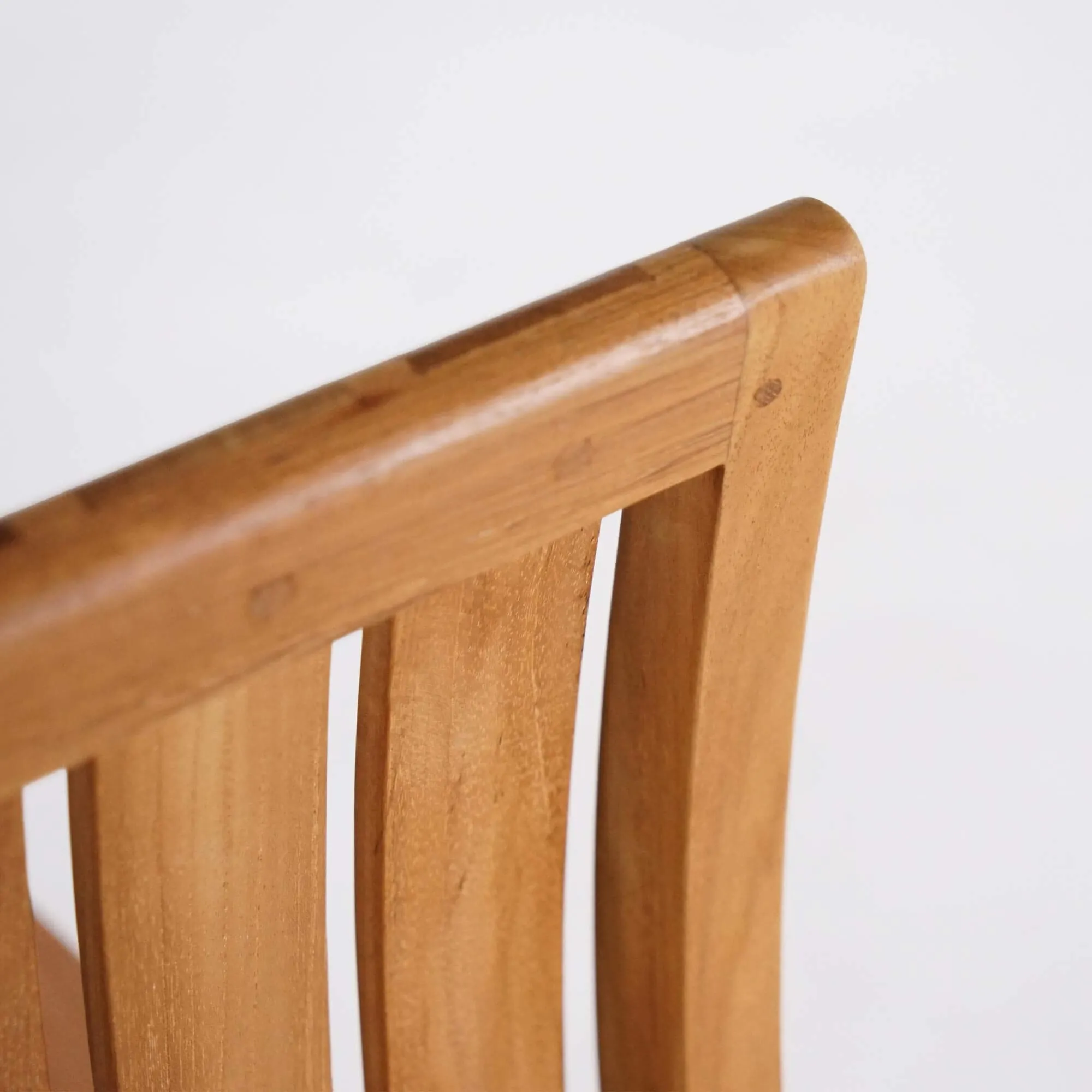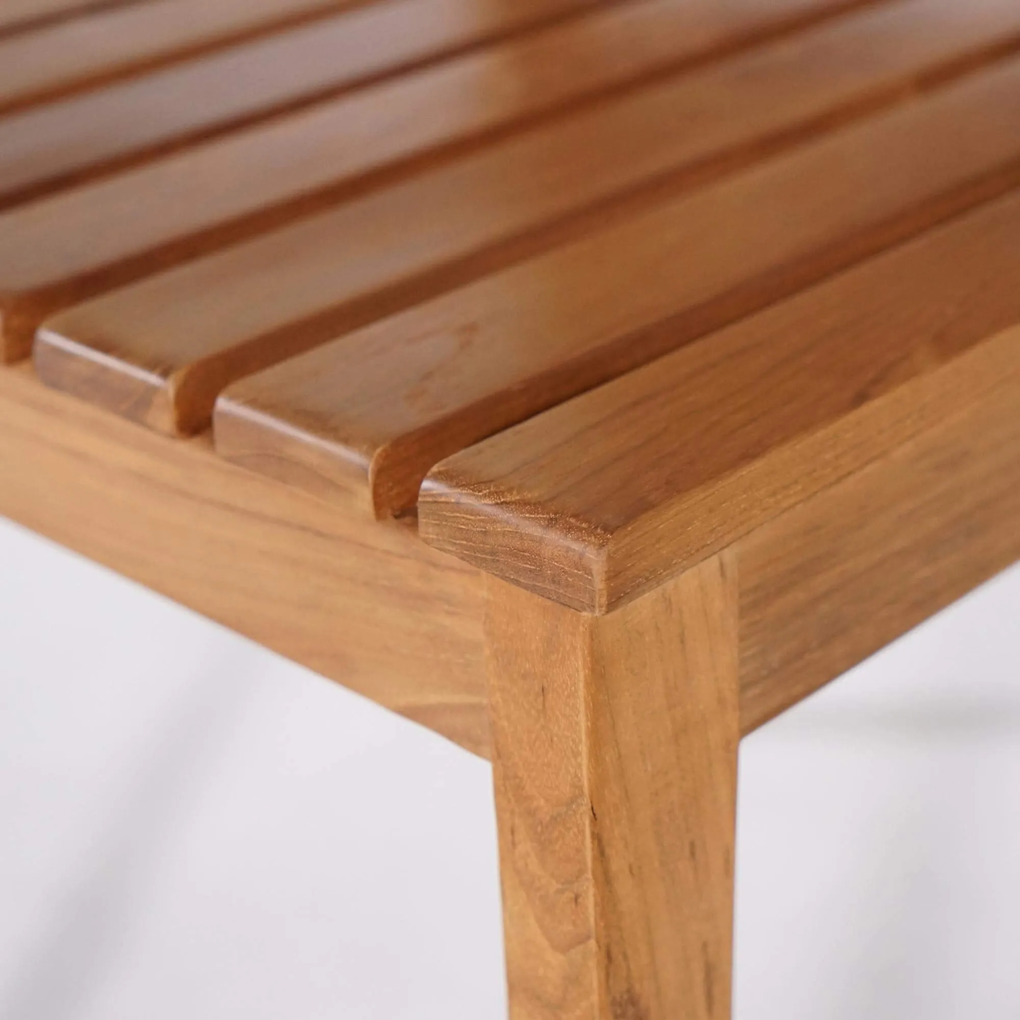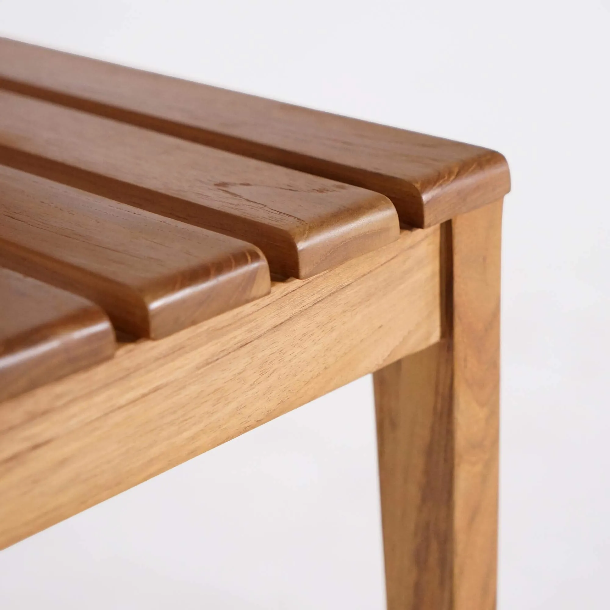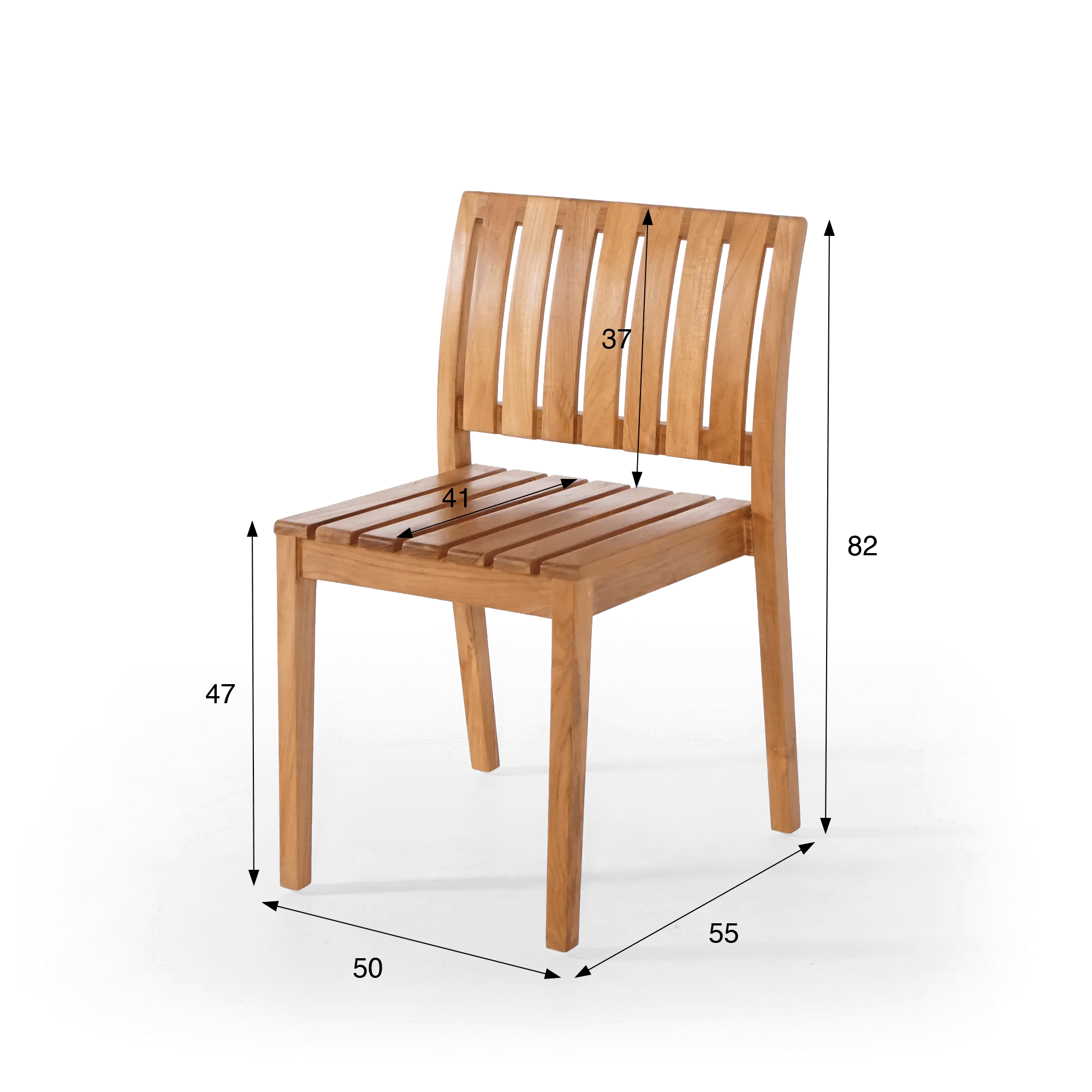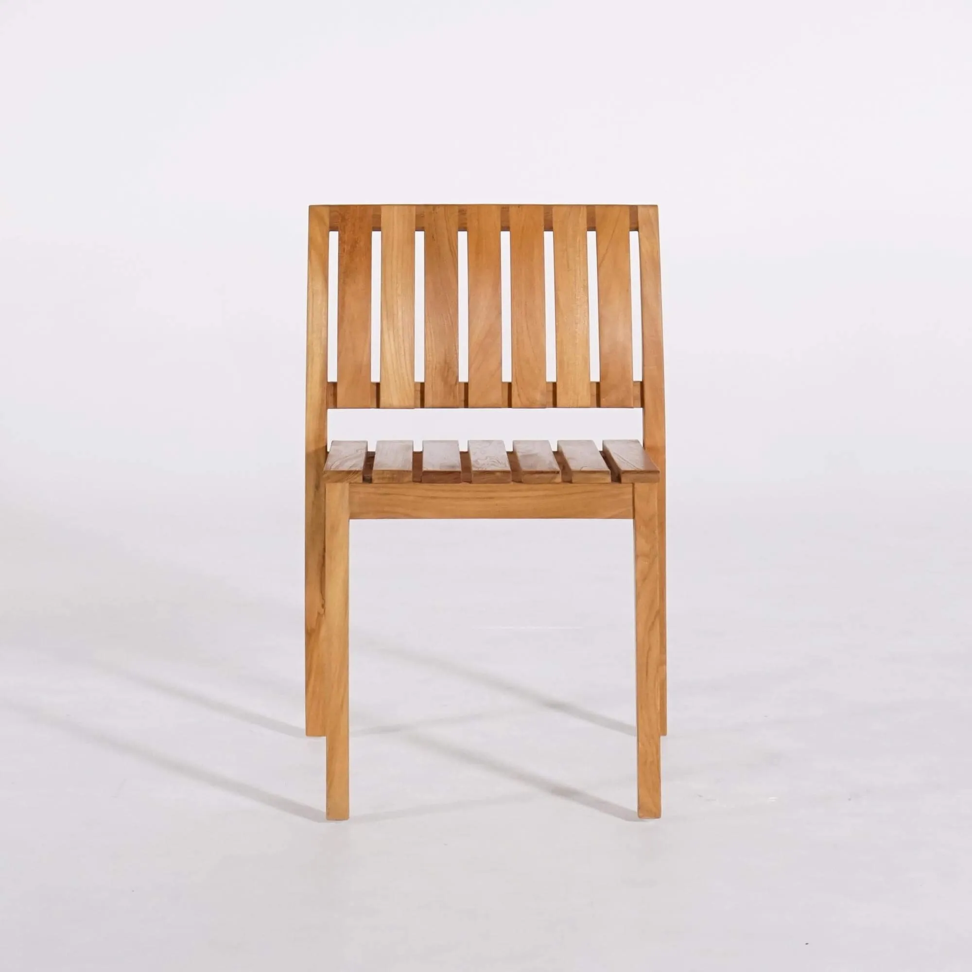 De zitting van deze tuinhouten stoel, opgebouwd uit licht gespatieerde teklatten, bevordert de luchtcirculatie en zorgt voor aangenaam comfort tijdens maaltijden of ontspannen momenten buiten rond een eettafel. Met een zitbreedte van ongeveer 41 cm biedt de stoel voldoende ruimte, terwijl het silhouet licht blijft en gemakkelijk te verplaatsen is. De rugleuning van deze tuinhouten teakhouten stoel, gevormd door licht gebogen verticale latten, volgt op natuurlijke wijze de curve van de rug en versterkt het gevoel van ondersteuning. Deze subtiele ergonomie is het resultaat van nauwgezet werk aan de verhoudingen en hoeken van de structuur.