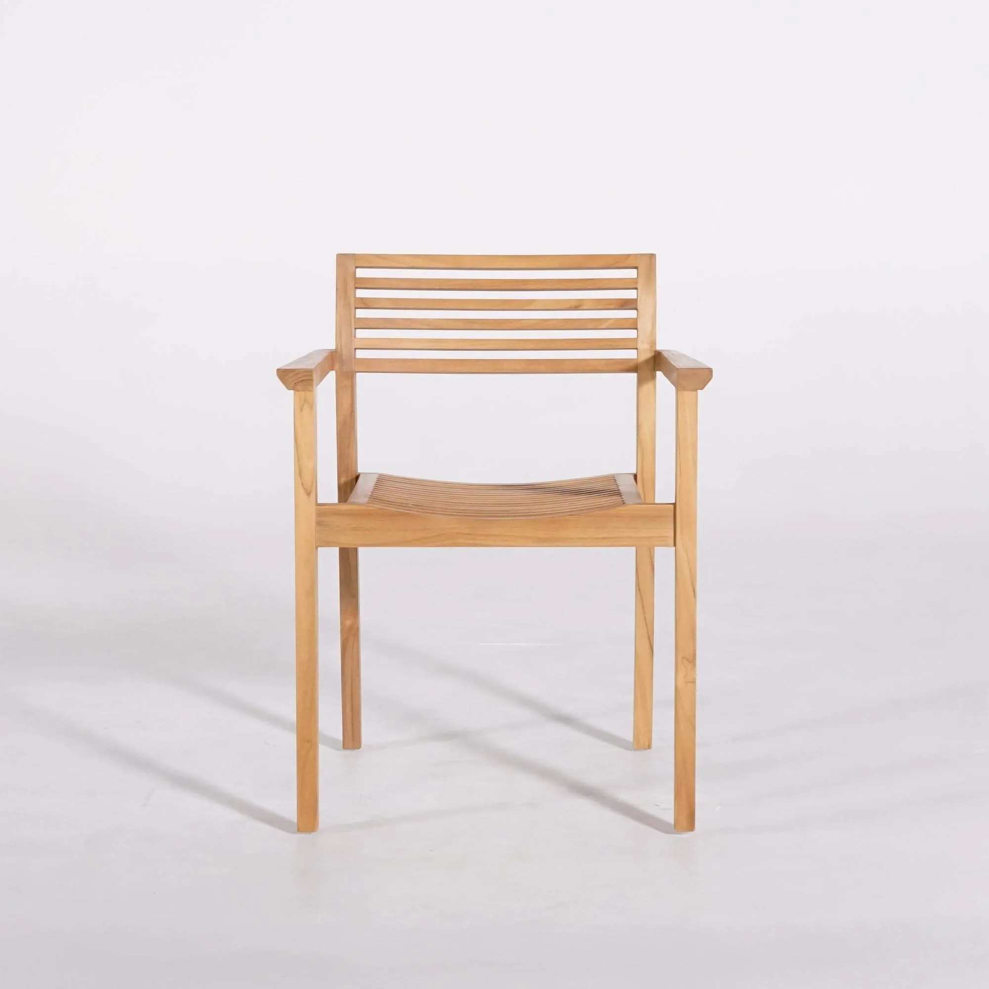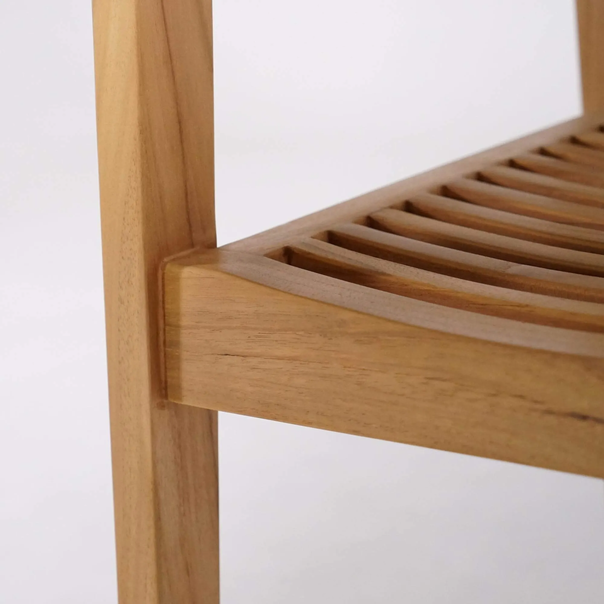 De zitting van de tuinhouten teak stoel Naito werd ontworpen met een lichte ronding en bestaat uit fijn bewerkte teakhouten latten. Deze vorm volgt vanzelf de lichaamshouding en biedt aangenaam comfort tijdens langere maaltijden buiten. De rugleuning, opgebouwd uit elegant gespreide horizontale latten, ondersteunt de rug en behoudt tegelijk een lichte, luchtige uitstraling. De armleuningen verlengen die zoektocht naar comfort en maken het makkelijk om ontspannen aan tafel te zitten.