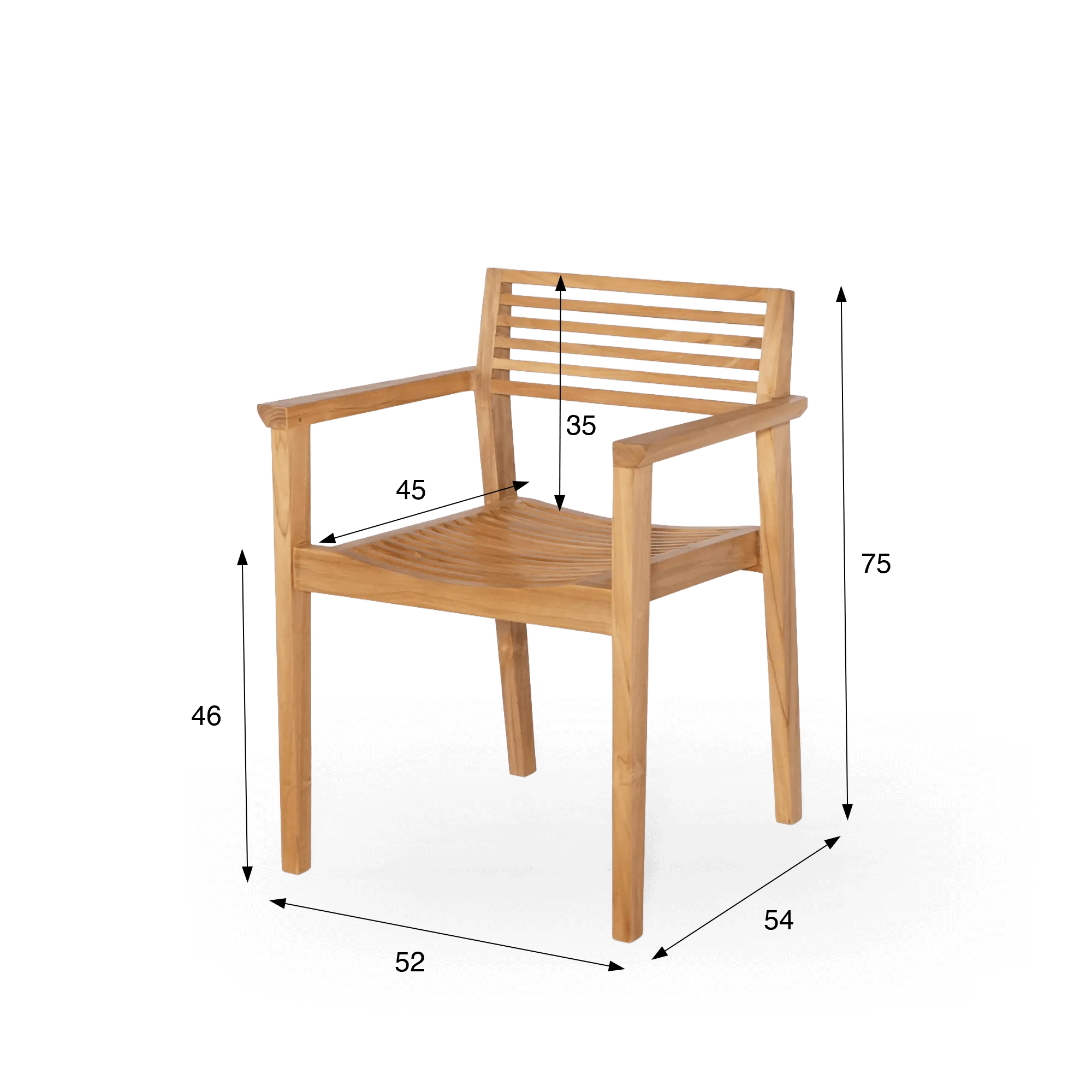 Met haar evenwichtige verhoudingen — ongeveer 58 cm breed, 60 cm diep en 83 cm hoog — heeft de tuinhouten teak stoel Naito een discrete maar duidelijke aanwezigheid rond een buiten-eethoek. Het onderstel in massief hout zorgt voor een geruststellende stabiliteit in het dagelijks gebruik, terwijl de ambachtelijke uitvoering het precieze werk van de verbindingen mooi in de verf zet.