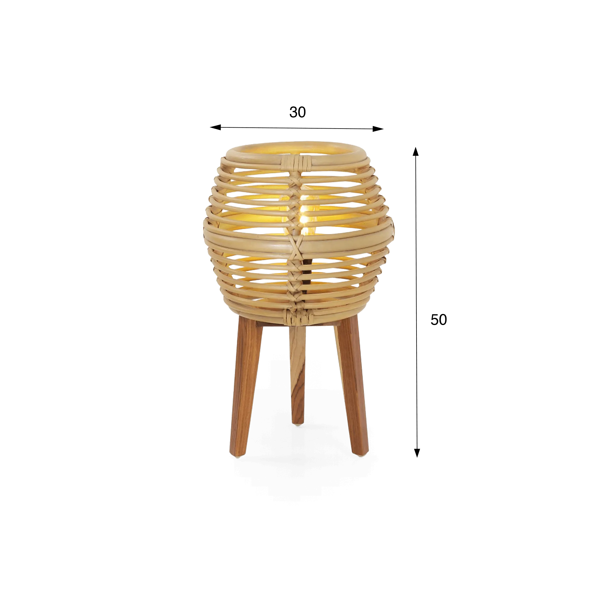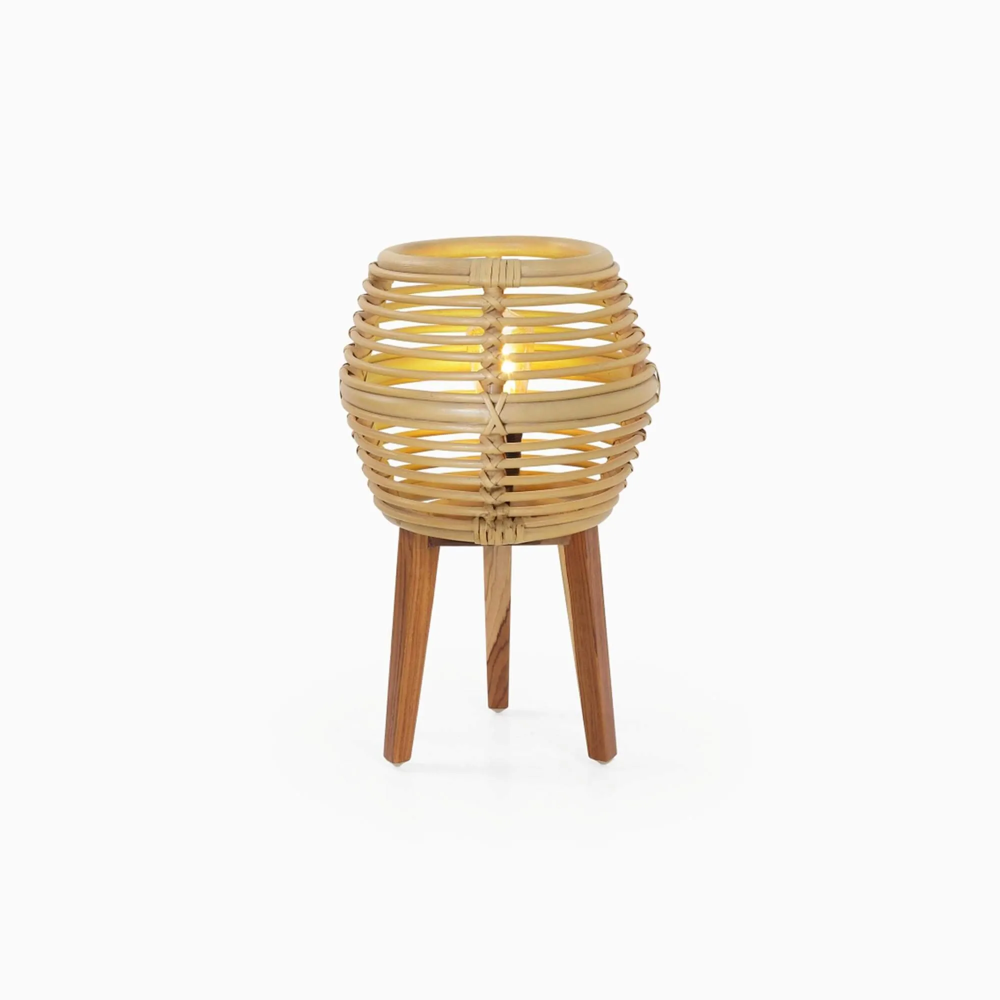 Met de tafellamp in rotan en teakhout Yumi hebben wij een lichtgevend object ontworpen dat een zachte sfeer verspreidt en tegelijk de schoonheid van ambachtelijk werk onthult. Het rotan, met precisie gevlochten, vormt een opengewerkte lampenkap die het licht subtiel doorlaat. De ineengevlochten lijnen creëren een verfijnd schaduwspel op de muren en brengen een visuele warmte die de sfeer van een ruimte meteen verandert.
