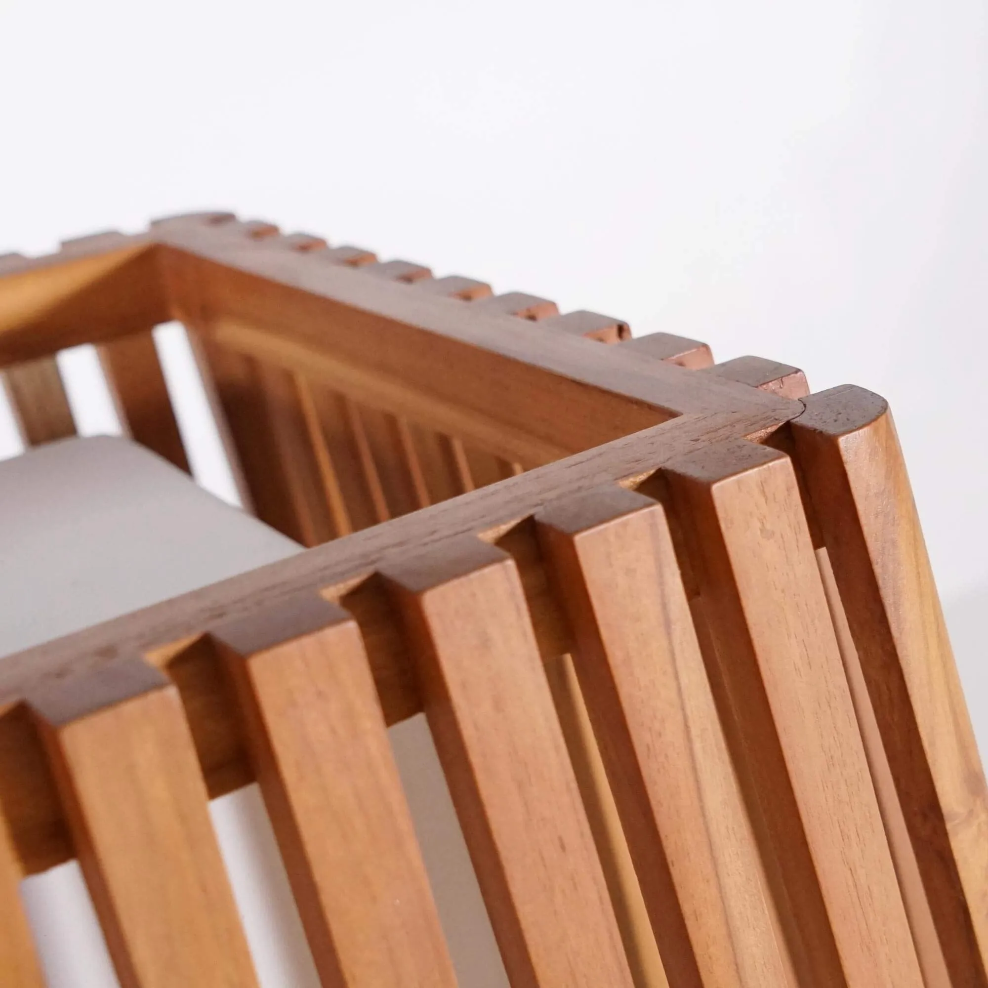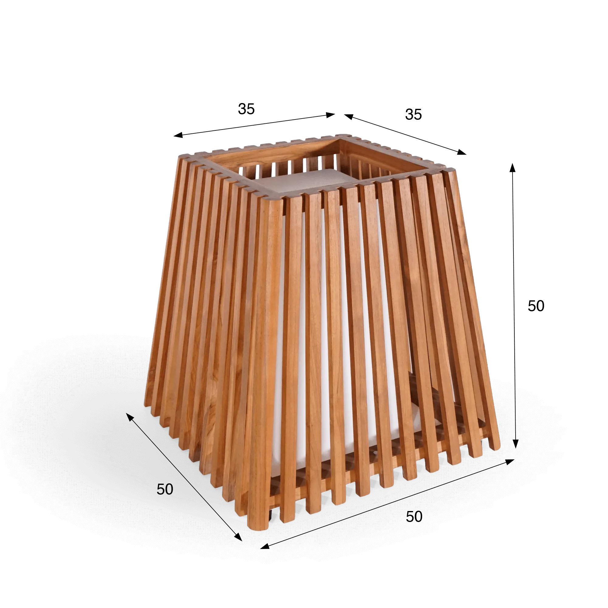 De structuur van deze buitenlamp in hout is gemaakt van massief teakhout, een houtsoort die we selecteren omwille van haar uitzonderlijke weerstand tegen buitentoepassingen. Dit dichte hout, van nature rijk aan oliën, beschermt de lamp tegen vocht en weersschommelingen, terwijl het doorheen de tijd zijn warme patina behoudt. De verticale latten waaruit de structuur is opgebouwd, zijn zorgvuldig samengesteld om een gelijkmatig visueel ritme te creëren. Deze constructie zet de natuurlijke nuances van teak in de spotlight: de subtiele nerftekening en kleurschakeringen tonen de authenticiteit van het materiaal.