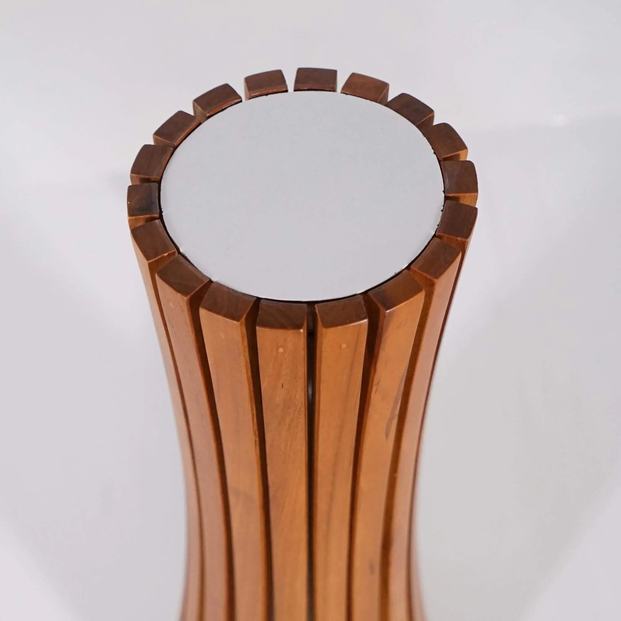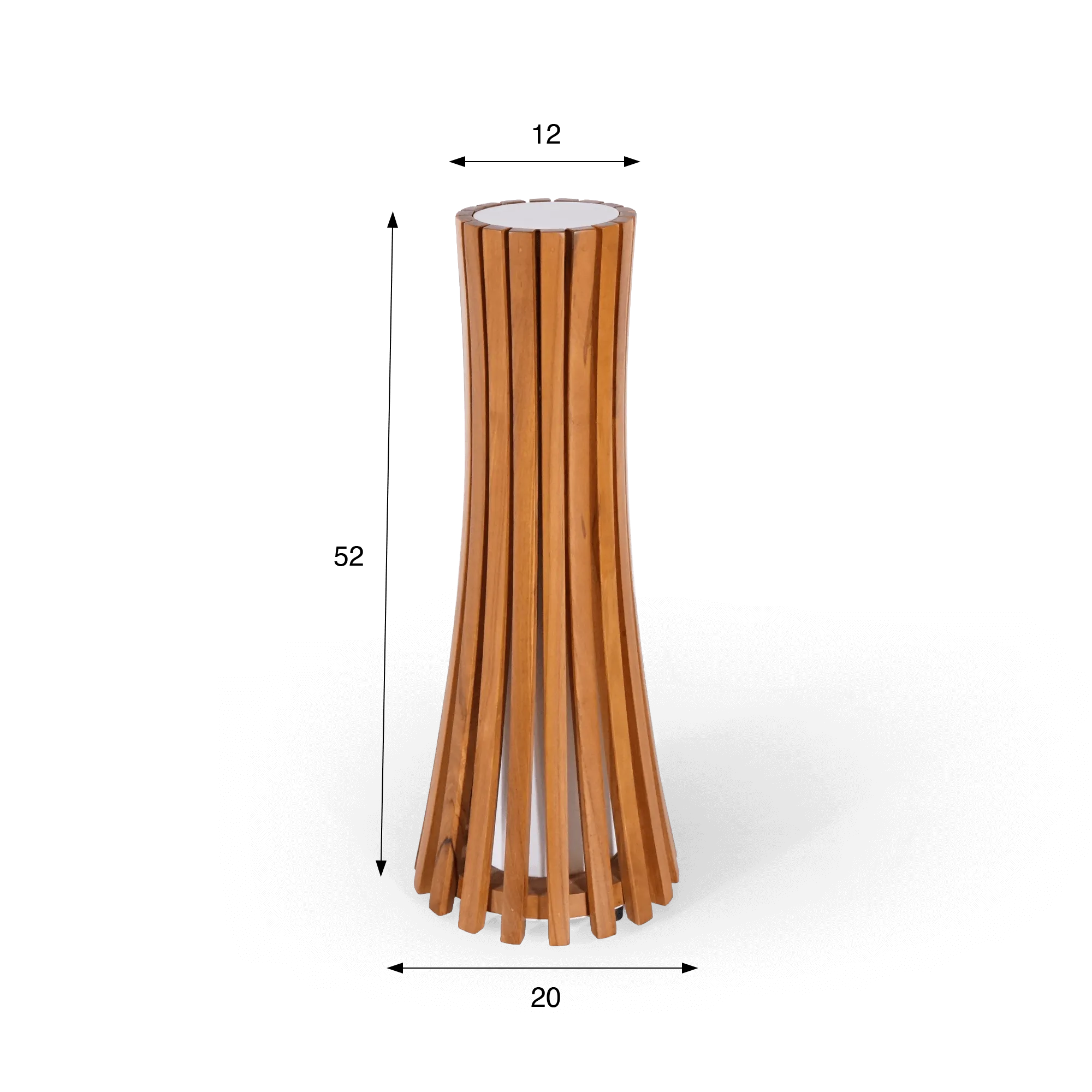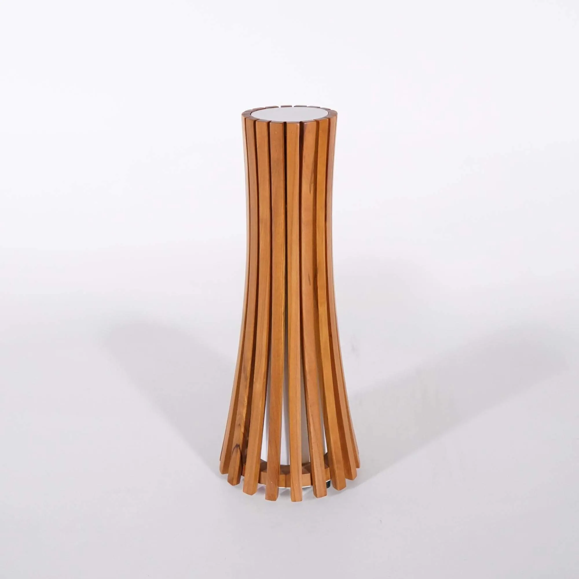 Toen we de teakhouten buitenlamp Liven ontwierpen, wilden we een armatuur creëren dat een warme en grafische aanwezigheid brengt in een tuin of op een terras, en tegelijk de natuurlijke schoonheid van massief hout benadrukt. We hebben gewerkt rond een slank silhouet van ongeveer 52 cm hoog, waarvan de verticale lijnen een vorm tekenen die subtiel in het midden versmalt. Die constructie geeft de lamp een dynamische, evenwichtige uitstraling die vanzelf de aandacht trekt, maar toch harmonieus blijft in een buitenomgeving.
