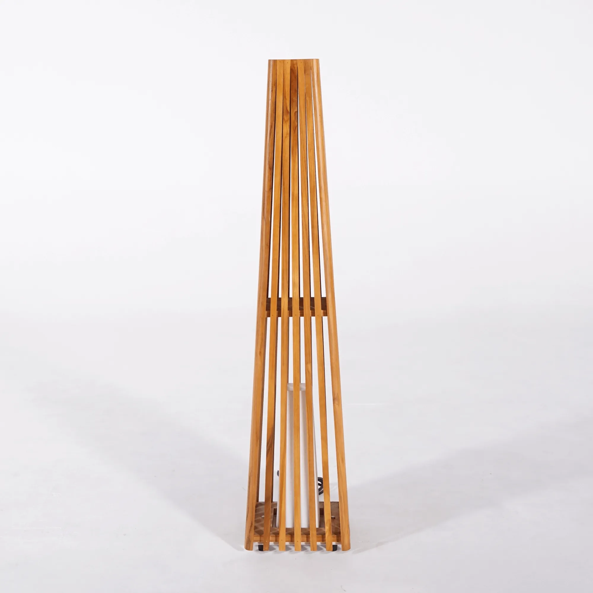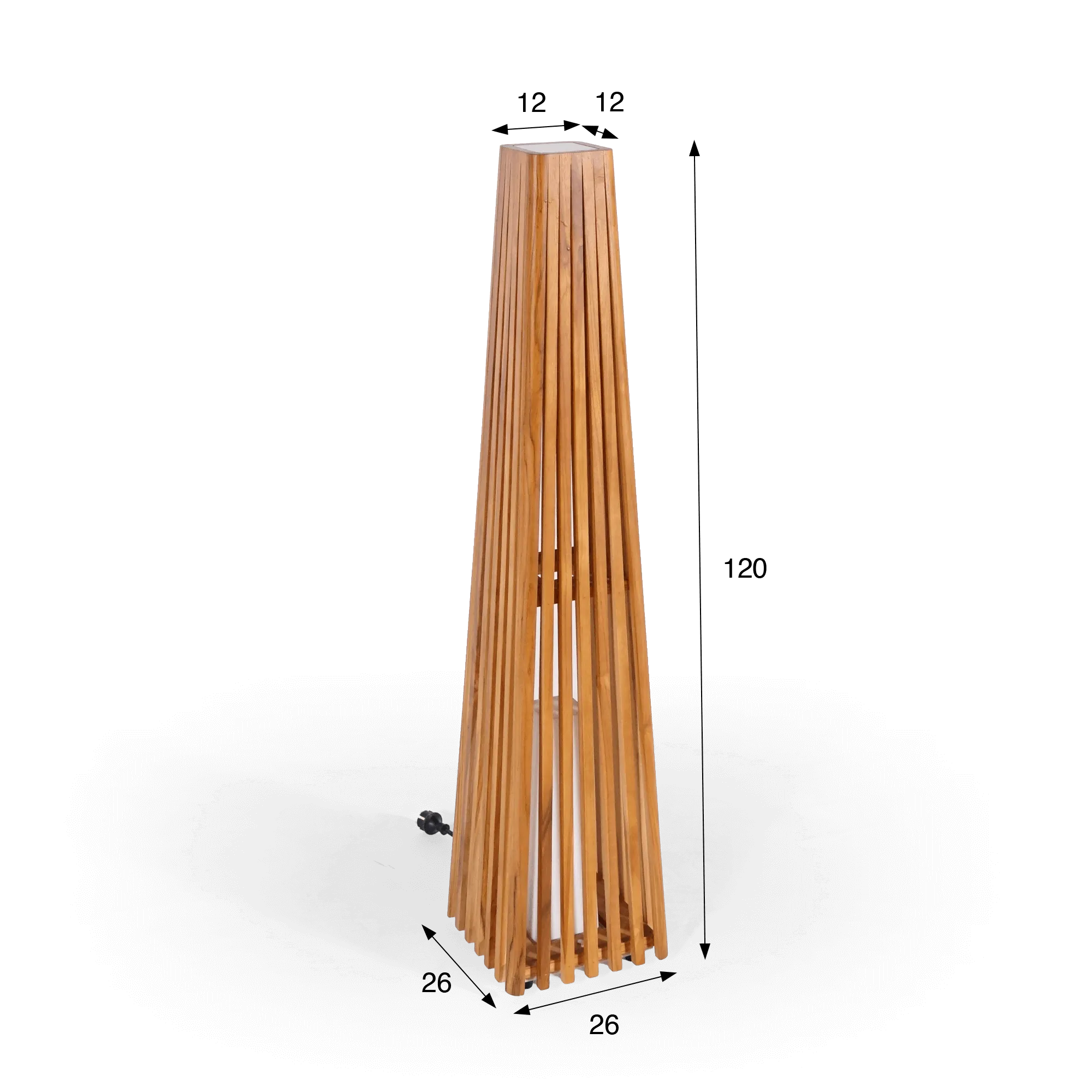 De structuur van de buitenlamp Taro is volledig uitgevoerd in massief teakhout, een houtsoort die we bijzonder waarderen om haar natuurlijke weerstand tegen weersinvloeden. Dit dichte en duurzame hout verdraagt temperatuur- en vochtigheidswisselingen uitstekend, terwijl het zijn warme uitstraling behoudt. Elke teakhouten lat wordt zorgvuldig geplaatst om een constructie te vormen die naar boven toe licht versmalt. Dit spel van verticale lijnen creëert een harmonieus ritme en laat het licht zacht en omhullend verspreiden.
