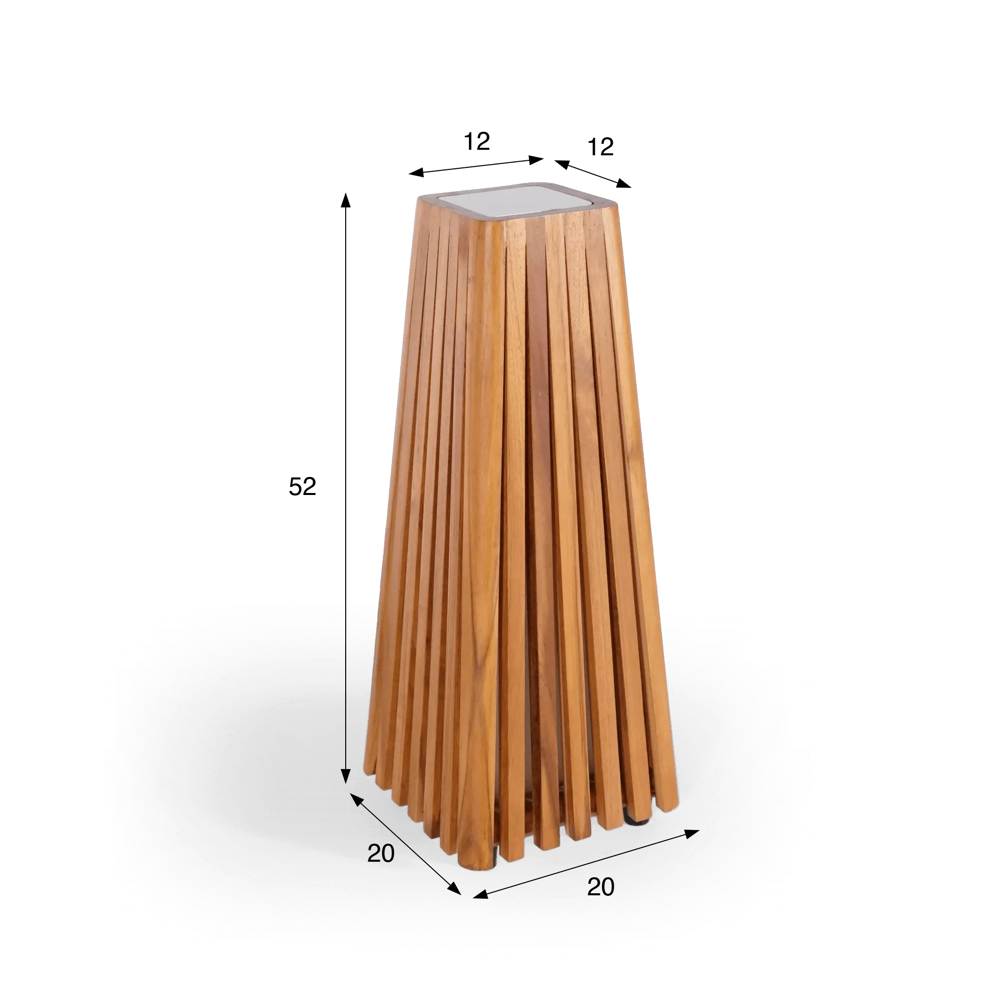 Met zijn compacte proporties van ongeveer 50 cm hoog vindt deze buitenlamp in teak hout vanzelf zijn plaats op de grond, naast een tuinlounge, langs een pad of op een mineraal terras. Het licht uitwaaierende silhouet rust op een stabiele basis, wat zorgt voor een evenwichtige en eigentijdse uitstraling. We hebben gewerkt met een spel van verticale lijnen, opgebouwd uit fijne latten in massief hout van teak die zorgvuldig zijn geplaatst. Zo ontstaat een open structuur die het licht laat circuleren en tegelijk de natuurlijke schoonheid van het hout benadrukt.