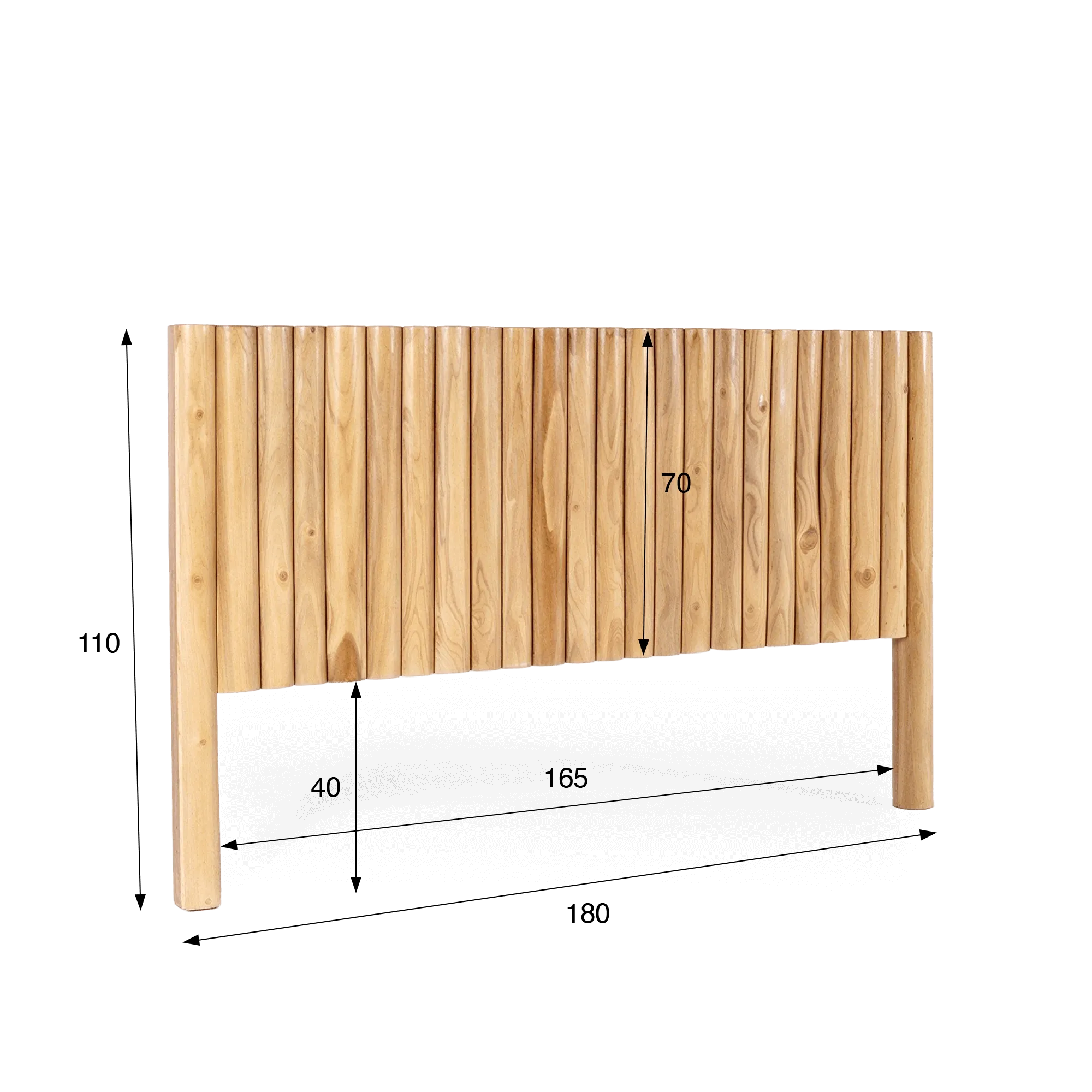 Het houten hoofdbord Naya plaats je eenvoudig achter een bed van 180 × 200 cm en het komt vanzelf mooi tegen de muur te staan, zonder ingewikkelde bevestiging. Met een hoogte van 110 cm en een visueel structurerend paneel van 165 cm, geplaatst op 40 cm van de vloer, wordt dit houten hoofdbord een echt decor voor het bed, terwijl er voldoende ruimte blijft voor kussens, sierkussens en textiel. Die vrijheid in styling is precies wat we wilden meegeven: een houten hoofdbord dat tegelijk uitgesproken én makkelijk is om mee te leven.