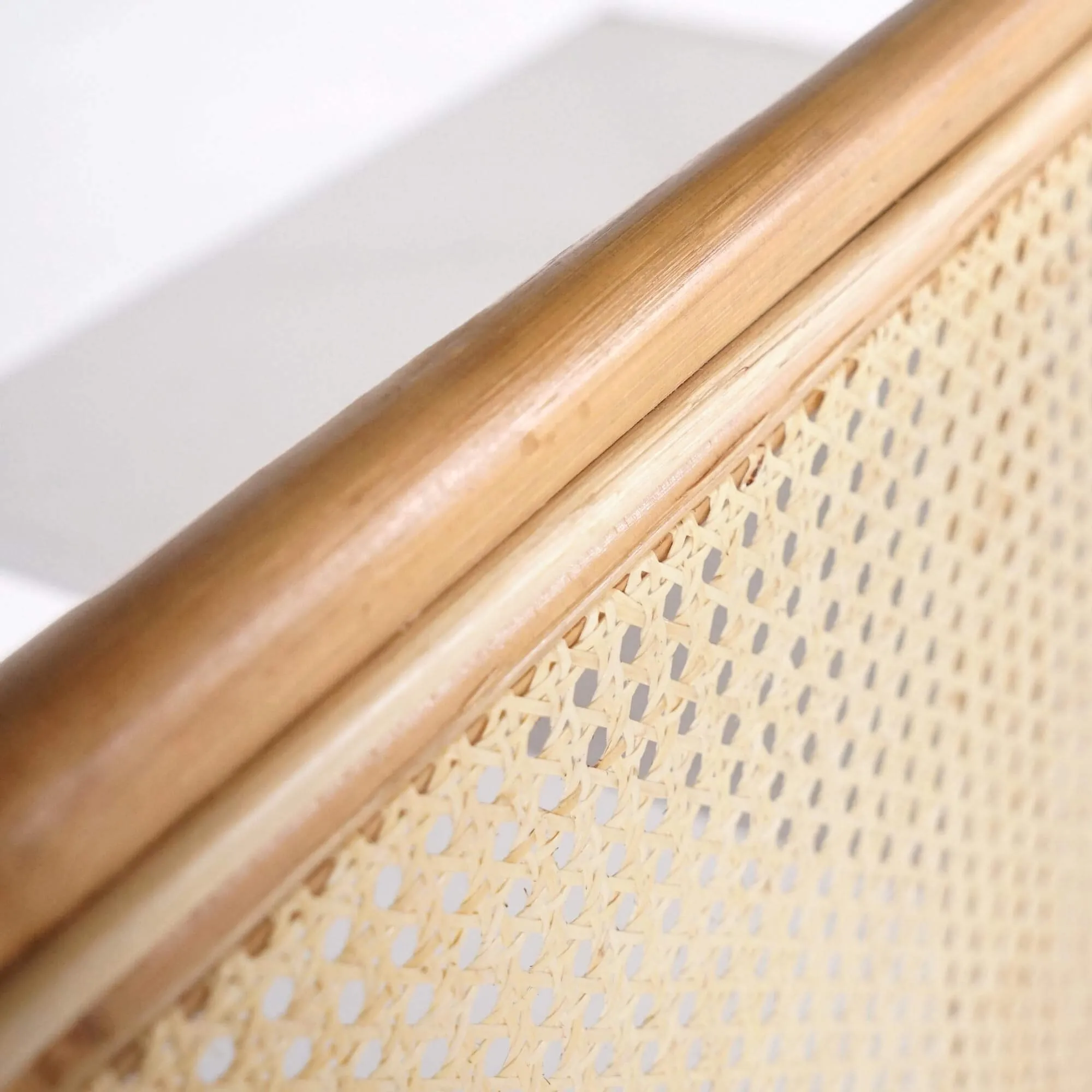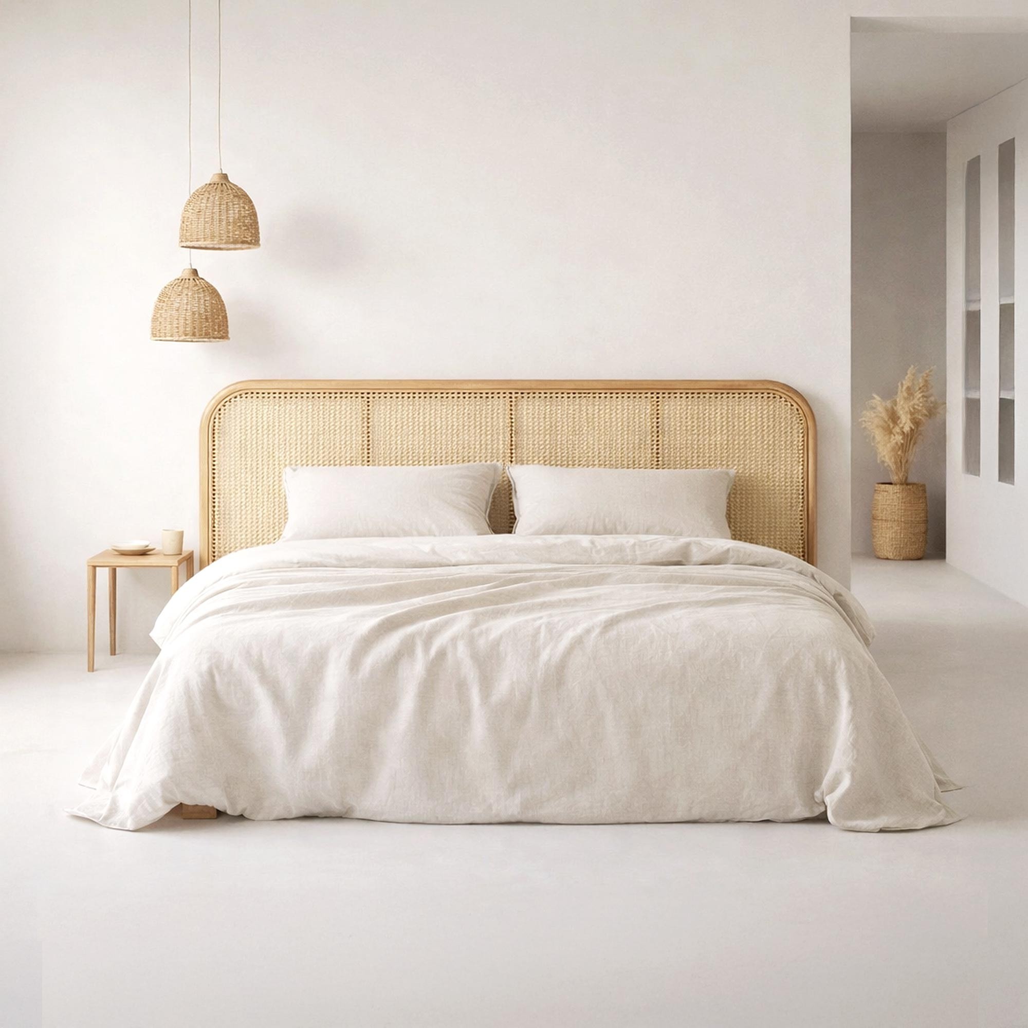 Het rotan dat dit hoofdbord vormt, is gekozen omwille van zijn sensorische kwaliteiten én zijn duurzaamheid. De warme touch, de levendige nerf en de lichte patina die zich met de tijd ontwikkelt, versterken het natuurlijke karakter van de kamer. Het handmatige vlechtwerk van dit rotan hoofdbord toont een vakmanschap dat je zowel van dichtbij als vanop afstand opmerkt—iets waar we tijdens de ontwikkeling van de Manila-lijn bijzonder veel belang aan hechtten.